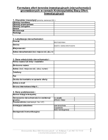 Formularz ofert terenów inwestycyjnych (nieruchomości) gromadzonych w ramach Krotoszyńskiej Bazy Ofert Inwestycyjnych 1. Charakter inwestycji (prosimy zaznaczyć [X] ): Obiekty handlowe Obiekty przem ysłowe Obiekty usługowe Hotele Restauracje Parkingi 2. Lokalizacja nieruchomości: Pow iat Gm ina KROTOSZYŃSKI MIASTO I GMINA KROTOSZYN Miejscow ość Adres nieruchomości (kod, miejscowość, ulica, nr) 3. Dane właściciela nieruchomości : Pełna nazwa lub im ię i nazwisko Skrócona nazwa Adres (kod, miejscow ość, ulica, numer) Telefony Fax Osoba do kontaktu w spraw ie oferty Adres e-m ail Strona internetow a http://... 4. Dane podstawowe : Num er księgi w ieczystej Oznaczenie nieruchom ości w ewidencji gruntu: Pow ierzchnia (zaznaczyć: ha / m2) nr działki arkusz mapy Istniejąca zabudowa pow ierzchnia wysokość ilość kondygnacji Dostępność komunikacyjna: _______________________________________________________________________________ 1/ Krotoszyńska Baza Ofert Inwestycyjnych – ul. Kołłątaja 7, tel. 062 722 74 81 3 e-mail:[email protected] Ogrodzenie /rodzaj Klasa gruntu Uzbrojenie terenu (prosimy zaznaczy ć [X]) Sieć w odociągow a Sieć elektryczna Kanalizacja deszczowa Kanalizacja sanitarna Sieć gazow a ciepłociąg Sieć telefoniczna Cena (za m 2) Obciążenie hipoteczne (niepotrzebne s kreślić) tak / nie 5. Sposób rozporządzenia nieruchomością (prosimy Sprzedaż Dzierżaw a Wkład do spółki Przetarg Negocjacje zaznaczy ć [X]) : Sposób rozporządzenia Tryb rozporządzenia 6. Przeznaczenia nieruchomości w miejscowym planie zagospodarowania przestrzennego : 7. W załączeniu materiały dodatkowe: Dokumentacja fotograficzna terenu tak / nie Prosimy o załączenie przynajmniej 1-go zdjęcia lub przesłanie w formie elektronicznej. 8. Uwagi : Niniejszym wyrażam zgodę na przetwarzanie moich danych osobowyc h przez Urząd Miejs ki w Krotosz ynie, ul . Kołłątaj a 7, 63- 700 Krotosz yn w z związ ku z działalności ą Krotosz yńs kiej Baz y Ofert Inwestyc yjnyc h, zgodni e z przepisami Ustawy z dnia 29.08.1997 r. o ochronie danych osobowych (Dz. U. Nr 133, poz. 883, z z m.). Wyrażam zgodę na opublikowani e na stronac h internetowych http://www.krotosz yn.pl moic h danyc h os obowyc h. ......................................................................... /podpis/ Oferta – term iny: _______________________________________________________________________________ 2/ Krotoszyńska Baza Ofert Inwestycyjnych – ul. Kołłątaja 7, tel. 062 722 74 81 3 e-mail:[email protected] Data od: dzień/miesiąc /rok Data do: dzień/miesiąc /rok UWAGA! Zamieszczana oferta w Krotoszyńskiej Bazie Ofert Inwestycyjnych będzie ważna przez okres dwóch mięsiecy. W przypadku zmiany stanu rozporządzania nieruchomością lub przedłużenia jej ważności należy powiadomić Urząd M iejski w Krotoszynie telefoniczne pod nr 722 74 81. _______________________________________________________________________________ 3/ Krotoszyńska Baza Ofert Inwestycyjnych – ul. Kołłątaja 7, tel. 062 722 74 81 3 e-mail:[email protected]