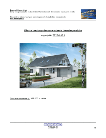 Domyszkieletowe24.pl Domy energooszczędne w standardzie Thermo Comfort. Ekonomiczne rozwiązanie na lata. Standardowy zakres rozwiązań technologicznych dla budynków mieszkalnych: stan deweloperski Oferta budowy domu w stanie deweloperskim wg projektu TRYPOLIS 3 Stan surowy otwarty: 367 000 zł netto ________________________________________________________________________________________________ www.domyszkieletowe24.pl [email protected] tel. 691 220 553 tel. 782 977 258 1/8 Domyszkieletowe24.pl Domy energooszczędne w standardzie Thermo Comfort. Ekonomiczne rozwiązanie na lata. Standardowy zakres rozwiązań technologicznych dla budynków mieszkalnych: stan deweloperski OFERTA Obiekt: Budynek mieszkalny, jednorodzinny, wg projektu budowlanego TRYPOLIS 3 Zakres robót: Stan deweloperski Cena: 367 000 zł netto (8% vat) 396 360 zł brutto Cena zawiera: • konstrukcja budynku jednorodzinnego, wykonana wg Opisu Konstrukcji Budynku, zgodnie z przedstawionym projektem • projekt produkcyjno-montażowy • montaż konstrukcji • koszt dźwigu budowlanego • koszty transportu ________________________________________________________________________________________________ www.domyszkieletowe24.pl [email protected] tel. 691 220 553 tel. 782 977 258 2/8 Domyszkieletowe24.pl Domy energooszczędne w standardzie Thermo Comfort. Ekonomiczne rozwiązanie na lata. Standardowy zakres rozwiązań technologicznych dla budynków mieszkalnych: stan deweloperski OPIS KONSTRUKCJI BUDYNKU stan deweloperski 1. Podwaliny • • • • elementy ścienne prefabrykowane ustawiane są na podwalinach 140x60 mm z drewna KVH podwaliny mocowane są do konstrukcji fundamentowej przy pomocy ocynkowanych łączników lub kotew chemicznych pod podwalinami ułożone są pasy izolacji poziomej z folii izolacyjnej fundamentowej o szerokości 200 mm szczelina pomiędzy podwaliną a podłożem betonowym wypełniona jest spienionym poliuretanem 2. Ściany zewnętrzne typu Thermo Comfort o współczynniku U=0,14 W/m2K • • • prefabrykowane płyty ścienne łączone na placu budowy w tarcze ścienne konstrukcja z drewna konstrukcyjnego KVH o wilgotności 15% (+/-3%), suszonego komorowo, czterostronnie struganego, o przekroju 140x60 mm łączna grubość ściany 28 cm •warstwy ściany zewnętrznej w kolejności od zewnątrz: • • • • • • • • • tynk zewnętrzny akrylowy (warstwa zewnętrzna strukturalna, siatka z włókna szklanego, warstwa podkładowa) izolacja termiczna (płyta styropianowa 100 mm) płyta konstrukcyjna OSB 3 grubości 12 mm membrana wiatroizolacyjna elementy konstrukcyjne z drewna KVH (140x60 mm) izolacja termiczna wewnętrzna (wełna mineralna 150 mm) płyta konstrukcyjna OSB 3 grubości 12 mm folia paroizolacyjna suchy tynk (płyta gipsowo-kartonowa grubości 12 mm) ________________________________________________________________________________________________ www.domyszkieletowe24.pl [email protected] tel. 691 220 553 tel. 782 977 258 3/8 Domyszkieletowe24.pl Domy energooszczędne w standardzie Thermo Comfort. Ekonomiczne rozwiązanie na lata. Standardowy zakres rozwiązań technologicznych dla budynków mieszkalnych: stan deweloperski 3. Ściany wewnętrzne • prefabrykowane moduły ścienne łączone na placu budowy w tarcze ścienne z drewna konstrukcyjnego KVH o wilgotności 15% (+/-3%), suszonego komorowo, czterostronnie struganego 140x60 mm •opis warstw ściany wewnętrznej: • • • • • • • suchy tynk (płyta gipsowo-kartonowa grubości 12 mm) płyta konstrukcyjna OSB 3 grubości 12 mm folia paroizolacyjna (w pomieszczeniach o podwyższonej wilgotności, tzw. mokrych) elementy konstrukcyjne z drewna KVH (140x60 mm) izolacja akustyczna wewnętrzna (wełna mineralna grubości 50 mm) płyta kartonowo-gipsowa grubości 12 mm suchy tynk (płyta gipsowo-kartonowa grubości 12 mm) 4. Konstrukcja dachu, U=0,14 W/m2K • • • wykonana jest z prefabrykowanych gotowych wiązarów dachowych z drewna konstrukcyjnego klasy C24 lub C30, impregnowanego przed korozją biologiczną i ogniem, suszonego komorowo i struganego czterostronnie, łączonego ocynkowanymi płytkami kolczastymi, lub więźba typu tradycyjnego dla budynków z użytkowym poddaszem dach jest typu "ciepłego", tzn. warstwa izolacji cieplnej umieszczona jest w połaci dachu połacie dachu pokryte dachówką ceramiczną, obróbki dekarskie, deska czołowa •opis kolejności warstw połaci dachu od zewnątrz: • ◦ ◦ ◦ ◦ ◦ ◦ ◦ ◦ • dachówka ceramiczna Roben lub odpowiednik cenowy, obróbki dekarskie łaty z drewna iglastego impregnowanego kontrłaty z drewna iglastego impregnowanego membrana dachowa wysokoparoprzepuszczalna pas górny wiązarów dachowych/krokwie dachowe izolacja termiczna wewnętrzna (wełna mineralna grubości 250 mm) płyta konstrukcyjna OSB 3 grubości 12 mm folia paroizolacyjna suchy tynk (płyta gipsowo-kartonowa grubości 12 mm) Strop zgodnie z projektem. Od spodu wykończony płytą OSB i suchym tynkiem (płyty GK), izolacja akustyczna z wełny mineralnej, od góry poszycie z płyty OSB 25 mm. ________________________________________________________________________________________________ www.domyszkieletowe24.pl [email protected] tel. 691 220 553 tel. 782 977 258 4/8 Domyszkieletowe24.pl Domy energooszczędne w standardzie Thermo Comfort. Ekonomiczne rozwiązanie na lata. Standardowy zakres rozwiązań technologicznych dla budynków mieszkalnych: stan deweloperski • opis kolejności warstw stropu od góry: ◦ ◦ ◦ ◦ ◦ ◦ płyta konstrukcyjna OSB 3 grubości 25 mm konstrukcja stropu (belki stropowe lub pas dolny wiązara prefabrykowanego) izolacja akustyczna wewnętrzna (wełna mineralna grubości 100 mm) płyta konstrukcyjna OSB 3 grubości 12 mm folia paroizolacyjna (w pomieszczeniach o podwyższonej wilgotności, tzw. mokrych) suchy tynk (płyta gipsowo-kartonowa grubości 12 mm) 5. Pasy podokapowe (nadwieszenia dachu) • pasy podokapowe wykończon