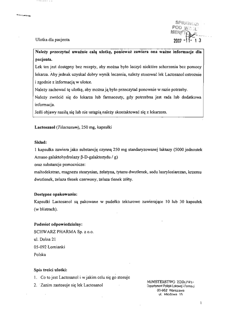 Ulotka dla pacjenta Nalezy przeczytac uwainie cala ulotke, poniewaz zawiera ona. wazne informacje dla pacjenta. Lek ten jest dostepny bez recepty, aby mozna bylo leczyc niektóre schorzenia bez pomocy lekarza. Aby jednak uzyskac dobry wynik leczenia, nalezy stosowac lek Lactosanol ostroznie i zgodnie z informacja w ulotce. Nalezy zachowac te ulotke, aby mozna ja bylo przeczytac ponownie w razie potrzeby. Nalezy zwrócic sie do lekarza lub farmaceuty, gdy potrzebna jest rada lub dodatkowa informacja. Jesli objawy nasila sie lub nie ustapia nalezy skontaktowac sie z lekarzem. Lactosanol (Tilactasum), 250 mg, kapsulki Sklad: 1 kapsulka zawiera jako substancje czynna 250 mg standaryzowanej laktazy (5000 jednostek Amano galaktohydrolazy (J-D-galaktozydu/ g) oraz substancje pomocnicze: maltodekstran, magnezu stearynian, zelatyna, tytanu dwutlenek, sodu laurylosiarczan, krzemu dwutlenek, zelaza tlenek czerwony, zelaza tlenek z6lty. Dostepne opakowania: Kapsulki Lactosanol sa pakowane w pudelko tekturowe zawierajace 10 lub 30 kapsulek (w blistrach). Podmiot odpowiedzialny: SCHWARZ PHARMA Sp. z 0.0. ul. Doma 21 05-092 Lomianki Polska Spis tresci ulotki: 1. Co to jest Lactosanol i w jakim celu sie go stosuje 2. . Zanimzastosujesie lek Lac~osanol MINISTERSTWO ZDROW}/< Departament Polityki Lekowej i Farmacji 00-952 Warszawa ul. Miodow;:}15 / 3. Jak stosowaclek Lactosanol 4. Mozliwe dzialania nieppzadane 5. Przechowywanie leku Lactosanol 6. Inne konieczne infonnacje dotyczace leku Lactosanol l. Co to jest lek Lactosanol i w jakbn celu sie go stosuje '. l kapsulka leku Lactosanol zawiera.250 mg laktazy, która jest odpowiednikiem naturalnego enzymu wystepujacego w organizmie. Enzym ten rozklada cukier zlozony (laktoze), obecny w mleku i jego przetworach, do latwo wchlanianych cukrów prostych: glukozy i galaktozy. Zdrowy organizm czlowieka wytwarza enzym laktaze w wystarczajacej ilosci. Jednak u niektórych osób ilosc produkowanego enzymu jest zmniejszona lub organizm nie wytwarzajej wcale. U tych osób laktoza nie ulega trawieniu. Po spozyciu mleka lub jego przetworów nierozkladana laktoza nasila perystaltyke jelit oraz staje sie pozywka dla bakteryjnej flory jelitowej. Powoduje to wystapienie dolegliwosci zwiazanych z nietolerancja laktozy: wzdec, biegunek i bólów brzucha. Dzialanie leku Lactosanol polega na ulatwianiu rozkladu laktozy do latwo przyswajalnych cukrów: glukozy i galaktozy. Wskazania do stosowania: Nietolerancja laktozy objawiajaca sie wzdeciami, bólami brzucha i biegunkami. 2. Zanim zastosuje sie lek Lactosanol Nie nalezy stosowac leku Lactosanol jesli wystepuje nadwrazliwosc na którykolwiek skladnik.preparatu. Przed rozpoczeciem leczenia zaleca sie konsultacje z lekarzem, w celu ustalenia przyczyn dolegliwosci. Nalezy pamietac, ze inne, powazne schorzenia moga wywolywac objawy podobne do tych, które towarzysza nietolerancji laktozy. Zachowac szczególna ostroznosc stosujac Lactosanol: u pacjentów z cukrzyca. MINISTERSTWOZDROWIA Oepartament PolitykilekowejI Farmacji 00-952 Warszawa ul. Miodowa 15 2 './ i / / Podczas stosowania leku Lactosanol zwieksza sie stezenie glukozy we krwi. Chorzy na cukrzyce powinni bezwzgJednie zasiegnac porady lekarskiej przed zastosowaniem leku. Nalezy skonsultowac sie z lekarzem, nawet jesli powyzsze ostrzezenia dotycza sytuacji wystepujacych w przeszlosci. Stosowanie leku Lactosanol z jedzeniem i piciem: Lek nalezy przyjmowac doustnie wraz z posilkiem zawierajacym mleko lub produkty mleczne. Zawartosc kapsulki mozna wsypac do mleka lub posypac nia spozywany produkt mleczny. Zachowanie szczególnej ostroznosci u niektórych szczególnych grup stosujacych lek: Ciaza: Lek moze byc stosowany w ciazy. Przed zastosowaniem leku nalezy poradzic sie lekarza. Karmienie piersia: Lek moze byc stosowany w czasie laktacji. . Przedzastosowaniemleku nalezyporadzicsie lekarza. Prowadzenie pojazdów i obsluga maszyn: Brak doniesien o uposledzaniu przez Lactosanol zdolnosci do prowadzenia pojazdów mechanicznych i obslugiwania urzadzen mechanicznych w ruchu. Wazne informacje o niektórych skladnikach leku Ladosanol: Stosowanieinnych leków: . Lactosanol moze zmniejszac efekt dzialania leków hipoglikemizujacych poprzez zwiekszanie stezenia glukozy we krwi. 3. Jak stosowac lek Ladosanol . Przed rozpoczeciem stosowania leku zaleca sie konsultacje z lekarzem. Lek nalezy przyjmowac doUstniew ilosci 1-2 kapsulki wraz z posilkiem zawierajacym mleko lub produkty mleczne. . . Stosowac do 6 kapsulek na dobe, chyba z~ lekarz zaleci inna~~DERSTWO ZDROWIA jepartament Polityki lekoweji Farmacji 00-952 Warszawa ul. Miodowa 15 3 I I Zawartosc kapsulki mozna wsypac do mleka lub posypac nia spozywany produkt mleczny. W przypadku cieZkiejnietolerancji laktozy 'konieczne moze byc zwiekszenie dawki leku. W przypadku wrazenia, ze dzialanie leku Lactosanol jest za mocne lub za slabe, nalezy zwrócic sie do lekarza. W przypadku zazycia wiekszej dawki leku Lactosanol niz zalecana: Brak doniesien o przypadkach przedawkowania leku Lactosanol. W przypadku pominiecia dawki leku Lactosanol: Nie nalezy stosowac dawki podwójnej w celu uzupelnienia pominietej dawki. Po przerwaniu leczenia lekiem Lactosanol moze wystapi~: Nawrót dolegliwosci zwiazanych z nietolerancja laktozy. 4. Mozliwedzialania niepozadane Brakdoniesieno dzialaniachniepozadanychlekuLactosanol. Wprzypadkuwystapieniaobjawówniepozadanych,nalezypoinformowaco nich lekarza. , 5. Przechowywanie leku Lactosanol Lek nalezy przechowywac w temperaturze ponizej 25°C. Lek nalezy przechowywac w miejscu niedostepnym i niewidocznym dla dzieci. Nie nalezy stosowac leku Lactosanol po uplywie terminu waznosci zamieszczonego na opakowaniu. 6. Inne informacje W celu uzyskania bardziej szczególowych informacji nalezy zwrócic sie do przedstawiciela podmiotu odpowiedzialnego. Polska Schwarz Pharma Sp. z 0.0. ul. Dolna 21 05-092 Lomianki Numer telefonu: + 22 751 13 28 MINISTERSTWO ZDROWIA Departament Polityki lekowejiFarmacji 00-952, Warszawa ul. 