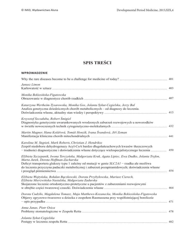 Developmental Period Medicine, 2015;XIX,4 399 © IMiD, Wydawnictwo Aluna SPIS TREŚCI WPROWADZENIE Why the rare diseases become to be a challenge for medicine of today? ............................................................................ 401 Janusz Limon Karłowatość w sztuce ........................................................................................................................................................................................ 403 Monika Bekiesińska-Figatowska Obrazowanie w diagnostyce chorób rzadkich ..................................................................................................................................... 407 Katarzyna Wertheim-Tysarowska, Monika Gos, Jolanta Sykut-Cegielska, Jerzy Bal Analiza genetyczna dziedzicznych chorób metabolicznych – od diagnozy do leczenia. Doświadczenia własne, aktualny stan wiedzy i perspektywy .................................................................................................... 413 Krzysztof Szczałuba, Robert Śmigiel Diagnostyka genetycznie uwarunkowanych wrodzonych zaburzeń rozwojowych u noworodków w świetle nowoczesnych technik cytogenetyczno-molekularnych ......................................................................................... 432 Martin Magner, Hana Kolářová, Tomáš Honzík, Ivana Švandová, Jiří Zeman Manifestacja kliniczna chorób mitochondrialnych ........................................................................................................................... 441 Karolina M. Stępień, Mark Roberts, Christian J. Hendriksz Zespół niedoboru dehydrogenazy Acyl-CoA bardzo długołańcuchowych kwasów tłuszczowych − trudności diagnostyczne i doświadczenia własne dotyczące wielospecjalistycznego leczenia ......................... 450 Elżbieta Szczepanik, Iwona Terczyńska, Małgorzata Kruk, Agata Lipiec, Ewa Dudko, Jolanta Tryfon, Marta Jurek, Dorota Hoffman-Zacharska Deficyt transportera glukozy typu 1 zależny od mutacji w genie SLC2A1 − rzadka ale możliwa do leczenia przyczyna padaczki metabolicznej i zaburzeń pozapiramidowych; doświadczenia własne i przegląd piśmiennictwa ................................................................................................................................................................................. 454 Elżbieta Wojtyńska, Bohdan Bączkowski, Dorota Przybyłowska, Mariusz Cierech, Elżbieta Mierzwińska-Nastalska, Małgorzata Zadurska Skojarzone leczenie ortodontyczno-protetyczne u pacjentów z zaburzeniami rozwojowymi w obrębie części twarzowej czaszki. Doświadczenia własne ..................................................................................................... 464 Dorota Cudziło, Magdalena Tomasz, Maja Matthews-Kozanecka, Monika Bekiesińska-Figatowska Objawy zgryzowo-twarzowe u dziecka z zespołem Rasmussena przy współistniejącej boreliozie − opis przypadku .................................................................................................................................................................................................. 471 Anna Janas, Piotr Osica Problemy stomatologiczne w Zespole Retta ........................................................................................................................................ 478 Jolanta Sykut-Cegielska Postępy w leczeniu zespołu Retta ............................................................................................................................................................... 482 400 Spis treści Agata Tuczyńska, Dariusz Bartosik, Yasmin Abu-Fillat, Anna Sołtysik, Teresa Matthews-Brzozowska Zębiak zestawny umiejscowiony w żuchwie – opis przypadku i przegląd piśmiennictwa ....................................... 484 Teresa Matthews-Brzozowska, Joanna Baranowska, Piotr Rogiński, Ewa Obersztyn, Dorota Cudziło Zaburzenia zgryzu i zmiany występujące w obrębie części twarzowej czaszki u dziecka z zespołem podniebienno-sercowo-twarzowym ................................................................................................................................ 490 Piotr Osica, Anna Janas Problemy stomatologiczne u pacjenta z typem klasycznym zespołu Ehlersa-Danlosa − opis przypadku ....... 496 Bogumił Lewandowski, Katarzyna Martula-Gala, Robert Brodowski, Barbara Zych Mnogie, dodatkowe zęby zatrzymane w przebiegu dysplazji czaszkowo-obojczykowej. Opis przypadku .... 503 Jolanta Sykut-Cegielska Alkaptonuria – pierwsza wrodzona wada metabolizmu znana od wieku i nowa metoda leczenia – doniesienie wstępne ........................................................................................................................................................................................ 508 Jolanta Wierzba, Maria Mazurkiewicz-Bełdzińska, Joanna Jabłońska-Brudło, Piotr Potaż, Piotr Banach Problemy opieki nad pacjentem z chorobą rzadką na przykładzie zespołu Cornelii de Lange ............................... 511 Anna Binkiewicz-Glińska, Katarzyna Ruckemann-Dziurdzińska Rehabilitacja u dzieci z chorobami rzadkimi – doniesienie wstępne ..................................................................................... 516 Joanna Taybert Problemy prokreacji w rodzinach obciążonych wrodzoną wadą metabolizmu – nowe zadania dla systemu opieki zdrowia ............................................................................................................................................................................ 519 Karolina M. Stępień, Christian J. Hendriksz Zasady procesu przejścia pacjenta ze szpitala dziecięcego pod opiekę lekarza dorosłych – doświadczenia własne ................................................................................................................................................................................... 523 Krzysztof Borski Aspekty ekonomiczne chorób 