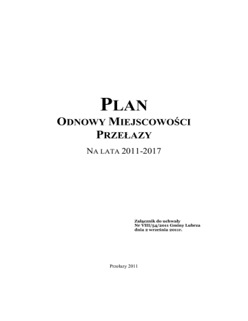 PLAN ODNOWY MIEJSCOWOŚCI PRZEŁAZY NA LATA 2011-2017 Załącznik do uchwały Nr VIII/54/2011 Gminy Lubrza dnia 2 września 2011r. Przełazy 2011 P l a n o d n o P w r y z e m i ł a e z j y s c o w o ś c i 1. Spis treści 1. Charakterystyka miejscowości……………………………………………………...3 2. Inwentaryzacja zasobów miejscowości……………………………………………..4 3. Elementy wyróżniające miejscowość……………………………………………….6 3.1 Ocena mocnych i słabych stron oraz szans i zagrożeń miejscowości Przełazy…………………………………………………………………………6 3.2 Analiza SWOT………………………………………………………………….9 4. Opis zadań do realizacji…………………………………………………………….10 5. Harmonogram realizacji projektu…………………………………………………..12 6. Koszty realizacji zadań……………………………………………………………..12 7. Opis i charakterystyka obszarów o szczególnym znaczeniu dla zaspokojenia potrzeb mieszkańców, sprzyjających nawiązywaniu kontaktów społecznych, ze względu na ich położenie oraz cechy funkcjonalno-przestrzenne………………..…13 2 P l a n o d n o P w r y z e m i ł a I. Charakterystyka miejscowości Przełazy: e z j y s c o w o ś c i położona w województwie lubuskim, w powiecie świebodzińskim, południowej części Gminy Lubrza, nad zachodnim brzegiem jeziora Niesłysz., pełniąca w ogromnej mierze funkcje turystyczne. Pałac w Przełazach Wizja Przełazy- turystyczna wieś z wypoczynkiem i wygodą nad czystą Niesłysza wodą. 3 P l a n o d n o P w r y z e m i ł a e z j y s c o w o ś c i II. Inwentaryzacja zasobów miejscowości: Zasoby- to wszelkie elementy materialne i niematerialne wsi i otaczającego ją obszaru, które mogą być wykorzystane obecnie bądź w przyszłości w budowaniu bądź realizacji publicznych lub prywatnych przedsięwzięć odnowy wsi. Analiza zasobów sołectwa Przełazy, gm. Lubrza Znaczenie zasobu Rodzaj zasobu małe średnie duże Środowisko przyrodnicze -walory krajobrazu X -walory klimatu X -walory szaty roślinnej X -cenne przyrodniczo obszary lub obiekty X -świat zwierzęcy X -osobliwości przyrodnicze X -wody powierzchniowe X -wody podziemne X -podłoże, warunki hydrogeologiczne X -gleby X -kopaliny X Środowisko kulturowe -walory architektury wiejskiej X -walory zagospodarowania przestrzennego X -osobliwości kulturowe X -zespoły artystyczne X Dziedzictwo religijne i historyczne -miejsca, osoby i przedmioty kultu X -święta, odpusty, pielgrzymki X -tradycje, obrzędy, gwara X -specyficzne potrawy X 4 P l a n o d n o P w r y z e m i ł a e z j y s -legendy, podania, fakty historyczne c o w o ś c X -ważne postacie historyczne X -specyficzne nazwy X -dawne zawody X Obiekty i tereny -działki pod zabudowę mieszkaniową X -działki pod domy letniskowe X -działki pod zakłady usługowe i przemysł X -pustostany mieszkaniowe X -pustostany magazynowe, poprzemysłowe X -tradycyjne obiekty gospodarskie wsi (spichlerze, X kuźnie, młyny, itp.) -place i miejsca publicznych spotkań X Gospodarka, rolnictwo X -miejsca pracy X -specyficzne zakłady produkcyjne X -specyficzne produkty X -specyficzne uprawy polowe i leśne X -specyficzne hodowle X -znane firmy produkcyjne i zakłady usługowe X -możliwe do wykorzystania odpady produkcyjne X -zasoby odnawialnych energii Mieszkańcy -autorytety i znane postacie wśród mieszkańców X -krajanie znani w regionie, w kraju i zagranicą X -osoby o specyficznej wiedzy i umiejętnościach X -przedsiębiorcy X -związki i stowarzyszenia X -kontakty i współpraca X i 5 P l a n o d n o P w r y z e m i ł a e z j y s c o w o ś c i 6 III. Elementy wyróżniające miejscowość: -położenie blisko trasy A2 -duże i czyste jezioro Niesłysz z trzema wyspami, bogate w różne gatunki ryb (szczupak, okoń, węgorz, leszcz, sielawa, płoć, lin i inn.); ptaków żyjących nad wodą (orzeł bielik, łabędź, czapla siwa, żurawi inn. ); dzikich zwierząt (żeremia bobrów) -ośrodki turystyczne z hotelami, ośrodek rehabilitacji, pensjonaty, gospodarstwa agroturystyczne, pola campingowe, namiotowe i biwakowe -sezonowe przystanie żeglarskie -wypożyczalnie sprzętu wodnego -dwie plaże wiejskie -zabytki architektury- kościół, neorenesansowy pałac, cmentarz poniemiecki -szlak rowerowy (21 km) dookoła jeziora wraz z oznakowaną ścieżką przyrodniczą -turystyka wodna- sporty wodne (żeglarstwo, nurkowanie, kajakarstwo, windsurfing, pływanie; zimą łyżwiarstwo i bojery i inn.) imprezy związane z tymi sportami (np. regaty), wędkarstwo, -boisko z placem zabaw -sezonowe punkty małej gastronomii -obozy, kolonie 3.1 Ocena mocnych i słabych stron miejscowości Przełazy: Mocne strony: 1. Bliskość trasy międzynarodowej A2 Poznań-Świecko- Berlin (4km). 2. Położenie wśród lasów nad jeziorem Niesłysz. 3. Zabytki architektury: - kościół rzymskokatolicki, pod wezwaniem "Podniesienia Krzyża". XIX-wieczna, neogotycka, budowla wzniesiona z granitu. -trzykondygnacyjny pałac neorenesansowy z XIX wieku. P l a n o d n o P w r y z e m i ł a e z j y s c o w o ś c i 4. Baza turystyczna: gospodarstwa agroturystyczne, pensjonaty, hotel, pola namiotowe. 5. turystka wodna: wędkarstwo, żeglarstwo, pływanie itp. 6. sezonowo działające punkty gastronomiczne. 7. Boisko sportowe, plac zabaw, plaża. 8. Kanalizacja. Słabe strony: 1. Brak miejsca spotkań mieszkańców. 2. Brak parkingu dla gości i turystów. 3. Słabe wyposażenie plaż wiejskich ( brak: utwardzonego zejścia, sanitariatów, pomostu, opieki ratownika.). 4. Niedostateczna komunikacja autobusowa ( PKS). 5. Brak kanalizacji burzowej. 6. Brak gazociągu. 7. Brak wodociągu. 8. Brak stacjonarnego połączenia telefonicznego oraz dostępu do stałego szerokopasmowego Internet