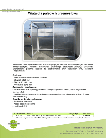 Wiata dla palących przemysłowa Zadaszona wiata wyznacza strefę dla osób palących chroniąc przed uciążliwymi warunkami atmosferycznymi. Niepełna konstrukcja gwarantuje odpowiedni przepływ powietrza. Ekonomiczna palarnia idealna do zastosowania przy siedzibach firm, fabrykach i magazynach. Struktura: - Rurki aluminiowe anodowane Ø50 mm - Długość: 2526 mm - Głębokość: 1861 mm - Wysokość: 2378 mm Zadaszenie i oszalowanie: - Panele wykonane z poliwęglanu komorowego o grubości 10 mm, odpornego na UV Montaż wiaty: - Nóżki wiaty mocowane są do podłoża za pomocą złączek z odlewu aluminium i śrub ze stali nierdzewnej Dodatkowo do wiaty polecamy: - Popielnicę ,,Papieros” - Kosze-popielnice Tremie - Ławki-podpórki Nr katalogowy 529380 Produkt WIATA DLA PALĄCYCH PRZEMYSŁOWA Waga (kg) 96 Cena netto* 5 688 zł *Podane ceny zawierają rabat 15%. W przypadku większych zamówień udzielamy korzystnych rabatów!
