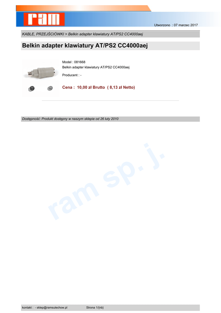 Utworzono : 07 marzec 2017 KABLE, PRZEJŚCIÓWKI > Belkin adapter klawiatury AT/PS2 CC4000aej Belkin adapter klawiatury AT/PS2 CC4000aej Model : 081668 Belkin adapter klawiatury AT/PS2 CC4000aej Producent : - Cena : 10,00 zł Brutto ( 8,13 zł Netto) Dostępność: Produkt dostępny w naszym sklepie od 26 luty 2010 . j . m a r kontakt : - [email protected] Strona 1/{nb} p s