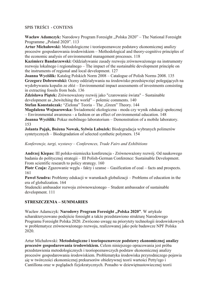 SPIS TREŚCI - CONTENS Wacław Adamczyk: Narodowy Program Foresight ,,Polska 2020” – The National Foresight Programme ,,Poland 2020”. 113 Artur Michałowski: Metodologiczne i teoriopoznawcze podstawy ekonomicznej analizy procesów gospodarowania środowiskiem – Methodological and theory-cognitive principles of the economic analysis of environmental management processes. 118 Kazimierz Bandarzewski: Oddziaływanie zasady rozwoju zrównoważonego na instrumenty rozwoju lokalnego i regionalnego – The impact of the sustainable development principle on the instruments of regional and local development. 127 Joanna Wyciślik: Katalog Polskich Norm 2008 – Catalogue of Polish Norms 2008. 135 Grzegorz Dobrowolski: Oceny oddziaływania na środowisko przedsięwzięć polegających na wydobywaniu kopalin ze złóż – Environmental impact assessments of investments consisting in extracting fossils from beds. 136 Zdzisława Piątek: Zrównoważony rozwój jako "czarowanie świata" – Sustainable development as „bewitching the world” – polemic comments. 140 Stefan Konstańczak: “Zielona” Teoria – The „Green” Theory. 144 Magdalena Wojnarowska: Świadomość ekologiczna - moda czy wynik edukacji społecznej – Environmental awareness - a fashion or an effect of environmental education. 148 Joanna Wyciślik: Pokaz mobilnego laboratorium – Demonstration of a mobile laboratory. 153 Jolanta Pająk, Bożena Nowak, Sylwia Łabużek: Biodegradacja wybranych polimerów syntetycznych – Biodegradation of selected synthetic polymers. 154 Konferencje, targi, wystawy – Conferences, Trade Fairs and Exhibitions Andrzej Kiepas: III polsko-niemiecka konferencja - Zrównoważony rozwój. Od naukowego badania do politycznej strategii – III Polish-German Conference: Sustainable Development. From scientific research to policy strategy. 160 Piotr Czaja: Zgazowanie węgla - fakty i szanse – Gasification of coal – facts and prospects. 161 Paweł Szudra: Problemy edukacji w warunkach globalizacji – Problems of education in the era of globalization. 164 Studencki ambasador rozwoju zrównoważonego – Student ambassador of sustainable development. 111 STRESZCZENIA – SUMMARIES Wacław Adamczyk: Narodowy Program Foresight ,,Polska 2020”. W artykule scharakteryzowano podejście foresight a także przedstawiono strukturę Narodowego Programu Foresight Polska 2020. Zwrócono uwagę na priorytety technologii środowiskowych w problematyce zrównoważonego rozwoju, realizowanej jako pole badawcze NPF Polska 2020. Artur Michałowski: Metodologiczne i teoriopoznawcze podstawy ekonomicznej analizy procesów gospodarowania środowiskiem. Celem niniejszego opracowania jest próba przedstawienia metodologicznych i teoriopoznawczych podstaw ekonomicznej analizy procesów gospodarowania środowiskiem. Problematyka środowiska przyrodniczego pojawia się w twórczości ekonomicznej prekursorów obiektywnej teorii wartości Petty'ego i Cantillona oraz w poglądach fizjokratycznych. Ponadto w dziewiętnastowiecznej teorii ekonomii powstały poglądy odbiegające od jej głównego nurtu. Reprezentowali je tacy przedstawiciele ekonomii, jak Mill i Say. Mill był pierwszym ekonomistą, który wyszedł poza tradycyjne pojmowanie środowiska przyrodniczego jako źródła zasobów naturalnych. Podkreślał ogólne znaczenie środowiska dla jakości życia człowieka. Jego zainteresowania dotyczyły w szczególności walorów rekreacyjnych, psychologicznych i estetycznych środowiska przyrodniczego. Z kolei Say wprowadza pojęcie usług produkcyjnych czynników naturalnych i jako pierwszy z przedstawicieli ekonomii klasycznej dostrzega problem zanieczyszczenia środowiska. Z czasem nastąpiły dalsze zmiany w obrębie ekonomii, które miały umożliwić jej lepsze rozpoznanie i analizę zjawisk oraz procesów powstających w systemie gospodarka-środowisko. Zmiany te miały umożliwić formułowanie metod i instrumentów za których pomocą można by ograniczać ekologiczne skutki działalności gospodarczej czy innych czynników społeczno-ekonomicznych. Szczególną rolę odegrały: • systemowe analizy zależności związków pomiędzy gospodarką i środowiskiem oparte na prawie zachowania masy i tablicach przepływów międzygałęziowych, a także analizie entropijno-energetycznej działalności gospodarczej, • zastosowanie teorii efektów zewnętrznych i teorii dóbr publicznych w analizie problemów ekologicznych. Wszechstronne harmonizowanie działań gospodarczych z możliwościami środowiska przyrodniczego warunkuje rozwijana obecnie teoria rozwoju zrównoważonego i trwałego. Strategia rozwoju zrównoważonego realizuje wymiar ekonomiczny, społeczny (kulturowy, demograficzny, etyczno-aksjologiczny, świadomościowy) i ekologiczny (środowiskowy). Na obecnym etapie badań przez pojęcie rozwoju zrównoważonego należy rozumieć taki sposób prowadzenia działalności gospodarczej, kształtowania i wykorzystania potencjału środowiska i taką organizację życia społecznego, które zapewnią trwałość użytkowania zasobów przyrodniczych, dynamiczny rozwój jakościowo nowych procesów produkcyjnych, systemów zarządzania oraz poprawę (w pierwszym okresie), a następnie zachowanie wysokiej jakości życia. Kazimierz Bandarzewski: Oddziaływanie zasady rozwoju zrównoważonego na instrumenty rozwoju lokalnego i regionalnego. Autor rozważa czy obowiązujące rozwiązania normatywne ustanawiają zasadę rozwoju zrównoważonego jako priorytet w odniesieniu do działań administracji publicznej, a w szczególności samorządowej, podejmowanych w zakresie rozwoju lokalnego i regionalnego. Artykuł obejmuje analizę najważniejszych instrumentów prawnych o charakterze abstrakcyjnym i generalnym, służących realizacji i określających znaczenie oraz sposób implementacji tej zasady. Grzegorz Dobrowolski: Oceny oddziaływania na środowisko przedsięwzięć polegających na wydobywaniu 