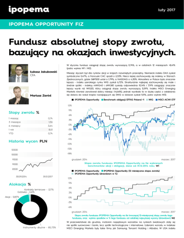 luty 2017 IPOPEMA OPPORTUNITY FIZ Fundusz absolutnej stopy zwrotu, bazujący na okazjach inwestycyjnych. W styczniu fundusz osiągnął stopę zwrotu wynoszącą 0,74%, a w ostatnich 12 miesiącach +8,41% (patrz wykres W1 i W2). Łukasz Jakubowski CFA Mariusz Zaród Miesiąc styczeń był dla rynków akcji w krajach rozwiniętych przeciętny. Niemiecki indeks DAX zyskał symboliczne 0,47%, a francuski CAC spadł o 2,33%. Nieco lepiej zachowywały się indeksy w Stanach Zjednoczonych, gdzie S&P500 urósł o 1,79%, a NASDAQ o 4,30%. Atmosfera w Polsce była znacznie lepsza - indeks szerokiego rynku WIG zyskał 6,72%. Strukturalnie najlepiej zachowywały się małe i średnie spółki - indeksy mWIG40 i sWIG80 zyskały odpowiednio 10,14% i 7,19% osiągając znacznie lepszy wynik niż WIG20, który osiągnął stopę zwrotu wynoszącą 5,59%. Indeks MSCI Emerging Markets również zanotował dobry miesiąc (+6,66%), jednak wynikało to w dużej części z osłabiania się dolara do walut krajów rozwijających się (WIG w dolarze zyskał 11,11%, patrz wykres W3). IPOPEMA Opportunity Benchmark obligacji EFFAS Poland >1 WIG MSCI ACWI ETF 12% 9% Stopy zwrotu % 6% 1 miesiąc 0,74 3 miesiące 1,56 6 miesięcy 3,64 3% 0% 1 rok 8,41 -3% YTD 0,74 -6% Historia wycen PLN4102.90.03 do 10500 00501 10000 00001 9500 0059 9000 -9% -12% -15% -18% grudzień 2014 0009 8500 IPOPEMA Opportunity IPOPEMA Opportunity (12 miesięczna stopa zwrotu) IPOPEMA Opportunity (drawdown w %) 0058 30.09.2014 31.01.2017 opportunity fiz alokacja Alokacja % Kontrakty terminowe - -3,17% Gotówka - 1,40% Akcje - 12,87% marzec 2017 Stopa zwrotu funduszu IPOPEMA Opportunity na tle wybranych benchmarków akcji i obligacji, dane od 31.12.2014 roku. W1 12% 9% 6% 3% 0% -3% -6% grudzień 2014 marzec 2017 Stopa zwrotu funduszu IPOPEMA Opportunity na tle kroczącej 12-miesięcznej stopy zwrotu tego funduszu, oraz wykres spadków w % tego funduszu od ostatniej najwyższej wyceny (drawdown). W2 Instrumenty dłużne - 85,73% global bonds fiz alokacja W przeciwieństwie do grudnia, motorem napędowym wzrostów na rynkach światowych stały się nie spółki surowcowe i banki, lecz spółki technologiczne i internetowe. Liderami wzrostu w indeksie MSCI Emerging Markets były takie firmy jak Samsung, Tencent Holding i Alibaba. W USA indeks luty 2017 IPOPEMA OPPORTUNITY FIZ Waluty % NASDAQ zachowywał się znacznie lepiej niż S&P500. Na przełomie miesiąca odbyło się posiedzenie FED, na którym, zgodnie z oczekiwaniami wszystkich analityków, stopy procentowe pozostały bez zmian. Co ciekawe, oświadczenie Janet Yellen było dość lakoniczne i nie odnosiło się przykładowo do zagadnienia zbliżania się gospodarki do pełnego zatrudnienia, co było często poruszane w publicznych wystąpieniach członków FED w ciągu ostatniego miesiąca. 15 lutego Janet Yellen wygłosi półroczny raport przez Kongresem, podczas którego może wspomnieć o planowanych zmianach w prowadzeniu polityki bilansowej FED. W chwili obecnej oczekiwania rynku wskazują, że polityka ta pozostanie bez zmian do połowy 2018 roku. Na rynku polskim istotnym wydarzeniem była deklaracja rządu o rezygnacji z mechanizmu suwaka bezpieczeństwa w strukturze nowego OFE. opportunity fiz waluty EUR - 5,78% USD - 16,29% PLN - 77,93% Ryzyko walutowe w pełni zabezpieczone Sektory % Informatyka 22,45 Handel 21,49 Nieruchomości 15,57 Dobra konsumpcyjne 12,23 Rynek kapitałowy 5,72 Ochrona zdrowia 5,31 Transport 4,87 Styczeń nie był zbyt udany dla obligacji skarbowych na świecie - indeks EFFAS 1+ dla niemieckich obligacji skarbowych stracił 1,24%, a indeks polskich obligacji skarbowych odnotował stopę zwrotu wynoszącą -0,18%. Amerykański EFFAS 1+ zyskał zaś symboliczne 0,25% (patrz wykres W4). Zaobserwowany w ostatnich miesiącach wzrost rentowności obligacji skarbowych na świecie jest istotnym czynnikiem ryzyka dla światowych rynków akcji, gdyż powinien się on przełożyć na bardziej konserwatywne modelowe wyceny spółek. Po stronie ryzyk dla rynków akcji należy również wspomnieć, że 1 lutego niższa izba brytyjskiego parlamentu poparła znaczącą większością projekt ustawy upoważniającej premier Theresę May do rozpoczęcia procedury wyjścia z Unii Europejskiej. Dane makroekonomiczne w Europie na początku roku należy uznać za niezłe. Opublikowane przez Komisję Europejską indeksy nastrojów przedsiębiorców i konsumentów pokazywały obraz rosnącej aktywności gospodarczej. Nieznacznie gorzej wypadły dane w USA, gdzie opublikowana dynamika wzrostu za 4Q okazała się być niższa od oczekiwań. W Polsce martwić może dynamika wzrostu PKB, która w 4Q wyniosła jedynie 2,8% - znacznie niżej, niż 3,9% w poprzednim kwartale. Na koniec stycznia zaangażowanie funduszu w akcje (uwzględniając instrumenty pochodne) wyniosło ok. 8,82%. Składały się na to inwestycje w wyselekcjonowane spółki, które były zabezpieczane przed spadkami przy wykorzystaniu kontraktów terminowych. DAX Index (Germany) IBEX35 Index (Spain) Recykling 3,31 Finanse – Inne 2,77 Media 2,46 Przemysł motoryzacyjny 1,95 Pozostałe 1,86 0% Struktura geograficzna % -10% Polska 80,68 USA 11,23 Francja 8,09 WIG Index (Poland) WIG20 Index (Poland) CAC40 Index (France) S&P500 Index (USA) Nasdaq Composite Index (USA) 20% 10% 31.12.2015 -20% czerwiec 2015 luty 2017 Zmiany wybranych indeksów akcji od 31.12.2015 roku W3 Polska USA Strefa Euro Czechy Węgry Niemcy Portugalia Hiszpania Japonia 6% 3% 31.12.2015 0% -3% -6% -9% marzec 2015 marzec 2017 Zmiany wybranych indeksów obligacji skarbowych (EFAS) od 31.12.2015 roku W4 Niniejszy dokument służy wyłącznie celom informacyjnym, nie stanowi rekomendacji czy doradztwa inwestycyjnego i nie może stanowić podstawy do podjęcia decyzji inwestycyjnej. Wszelkie informacje dotyczące planów, oczekiwań, strategii, czy polityki inwestycyjnej co do przyszłości, stanowią odzwierciedlenie wiedzy i oczekiwań zarządzającego 