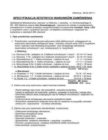 Oleśnica, 09.02.2017 r SPECYFIKACJA ISTOTNYCH WARUNKÓW ZAMÓWIENIA Spółdzielnia Mieszkaniowa „Zacisze” w Oleśnicy, z siedzibą : ul. Kochanowskiego 5; 56 - 400 Oleśnica zwana dalej Zamawiającym , zaprasza do udziału w postępowaniu prowadzonym w trybie przetargu nieograniczonego na wykonanie montażu lamp LED z czujnikiem ruchu i czujnikiem jasności na klatkach schodowych i wejściach do budynków w zasobach SM „Zacisze” . I. Opis przedmiotu zamówienia. 1. Przedmiotem zamówienia jest wykonanie robót elektrycznych polegających na wykonaniu demontażu istniejących lamp i montażu nowych lamp LED z czujnikiem ruchu i jasności oraz likwidacja przycisków oraz istniejącego sterowania (automatów schodowych i wył. instalacyjnych) w budynkach: w Oleśnicy: • • • • • • ul. Klonowa 5-5b - półpiętra na 3 klatkach schodowych + strych - 33 +9 =41 lamp ul. Klonowa 7-7b - półpiętra na 3 klatkach schodowych+ strych - 33 +9 =41 lamp ul. Rzemieślnicza 6- 1 klatka schodowa i wejście do bud. - 11 +1 =12 lamp ul. Rzemieślnicza 6a -1 klatka schodowa i wejście do bud. - 11 +1 = 12 lamp ul. Mościckiego 2-2a -2 klatki schodowe i wejścia do bud. -16+2 = 18 lamp ul. Mościckiego 4-4a -2 klatki schod.+półpiętra i wejścia do bud.-18+2 = 20 lamp RAZEM : 144 lampy w Bierutowie: • ul. Kolejowa 11-11b - 3 klatki schodowe i wejścia do bud. 15 +6 =21 lamp • ul. Mickiewicza 1-7 - 4 klatki schodowe i wejścia do bud. 20+8+4 = 32 lamp • ul. Rynek 1-2 - 2 klatki schodowe i wejścia do bud. 10+4+4 = 16 lamp RAZEM : 69 lampy OGÓŁEM 213 - lamp 2. Zakres prac przy wykonaniu części bazowej instalacji - Wybór jednego typu lamp dla wszystkich zespołów budynków. Lampy w wejściach do budynków powinny posiadać nr budynku i nazwę ulicy. - Demontaż starych lamp znajdujących się na klatkach schodowych i wejściach do budynków. - Unieczynnienie istniejącego sterowania oświetlenia klatek. - Wykonanie niezbędnych połączeń lamp dla ich zasilenia w przypadku potrzeby zmiany ich usytuowania na klatce schodowej. 3. Zakres prac przy wykonaniu standardowej modernizacji - Odłączenie istniejącego sterowania . - Demontaż istniejących lamp. - Montaż nowych lamp. - Zaprawki tynkarskie i malarskie - Sprawdzenie działania oświetlenia i regulacja czujników. - Pomiary powykonawcze instalacji oświetlenia klatek schodowych. - Dokumentacja powykonawcza. 4. Zakres opracowania dokumentacji technicznej. Dokumentacja techniczna powinna zawierać: - aktualny schemat instalacji oświetleniowej, - usytuowanie i parametry zamontowanych urządzeń, - certyfikaty zainstalowanych urządzeń, - pomiary instalacji oświetleniowej, - protokół przekazania instalacji oświetlenia klatek do eksploatacji. II. Termin wykonania umowy. Termin wykonania umowy : 31.05.2017 III. W konkursie ofert mogą wziąć udział: 1. Podmioty gospodarcze figurujące w ewidencji działalności gospodarczej bądź w rejestrze sądowym i zatrudniające pracowników posiadających wymagane uprawnienia do wykonywania powyższych robót. IV. Wymagane wadium. Warunkiem dopuszczenia do przetargu jest wpłata wadium w wysokości 1.500 zł (słownie: tysiąc pięćset złotych 00/100). Wadium należy wpłacić gotówką na konto SM „Zacisze” nr Bank PKO BP Oleśnica 43 1020 5297 0000 1202 0000 0067, a kopię dowodu wpłaty dołączyć do oferty. Zwrot wadium nastąpi po podpisaniu umowy z wybranym w postępowaniu przetargowym Wykonawcą. Wadium Wykonawcy, który złożył najkorzystniejszą ofertę, zostanie zaliczone na poczet zabezpieczenia należytego wykonania zadania. V. Czas związania ofertą: 30 dni. VI. Sposób opracowania oferty. Ofertę należy złożyć w zamkniętej kopercie, z napisem : „Przetarg na wykonanie montażu lamp LED z czujnikiem ruchu oświetlenia klatek schodowych oraz bram wejściowych budynków mieszkalnych wielorodzinnych w Oleśnicy i Bierutowie ” w sekretariacie SM „Zacisze” przy ul. Kochanowskiego 5 w Oleśnicy. Oferta powinna zawierać wypełniony i podpisany przez Oferenta formularz ofertowy oraz: • Załącznik nr 1 – oświadczenie o sytuacji prawno – finansowej firmy • Załącznik nr 2 – wykaz wykonanych robót, referencje • Załącznik nr 3 - parafowany przez Oferenta wzór umowy • informację czy Oferent jest płatnikiem podatku VAT, • aktualny tj. nie starszy niż 3 miesiące, wyciąg z rejestru ( zawierający przedmiot działalności, osoby upoważnione do reprezentacji i wysokość kapitału zakładowego ) lub wypis z ewidencji działalności gospodarczej stwierdzający, że profil działalności oferenta odpowiada przedmiotowi zamówienia , • kopię polisy ubezpieczeniowej od odpowiedzialności cywilnej ( w zakresie OC delikt oraz OC kontrakt ) lub inny dokument zaświadczający, że Oferent jest ubezpieczony od odpowiedzialności cywilnej w związku z prowadzeniem działalności gospodarczej. W przypadku przedkładania kopii jakichkolwiek dokumentów, muszą one być potwierdzone za zgodność z oryginałem przez osobę podpisującą ofertę. Dopuszcza się możliwość złożenia oferty na wybrane zadanie. VII. Osoby upoważnione do kontaktu z oferentami. Dział Techniczny SM „Zacisze” : Marian Forenc – tylko w wtorek i czwartek tel. 798 20 37 ; VIII. Przebieg przetargu. 1. Zamkniętą kopertę zawierającą ofertę należy złożyć w sekretariacie SM, pok. 106 do dnia 22 lutego 2017 r. do godz. 9 30. 2. Komisyjne otwarcie ofert nastąpi w dniu 22 lutego 2017 r. o godz. 10 00 w siedzibie Spółdzielni przy ul. Kochanowskiego 5 w małej sali widowiskowej na I piętrze . 3. Komisja, w trakcie rozpatrywania złożonych ofert, może prowadzić rozmowy z oferentami w celu wyjaśnienia ewentualnych wątpliwości zawartych w ofercie, a także w celu określenia ostatecznej ceny ofertowej zgłoszonej przez oferenta. 4. Spółdzielnia zastrzega sobie prawo swobodnego wyboru oferenta lub unieważnienia przetargu bez podania przyczyn. 5. Przet