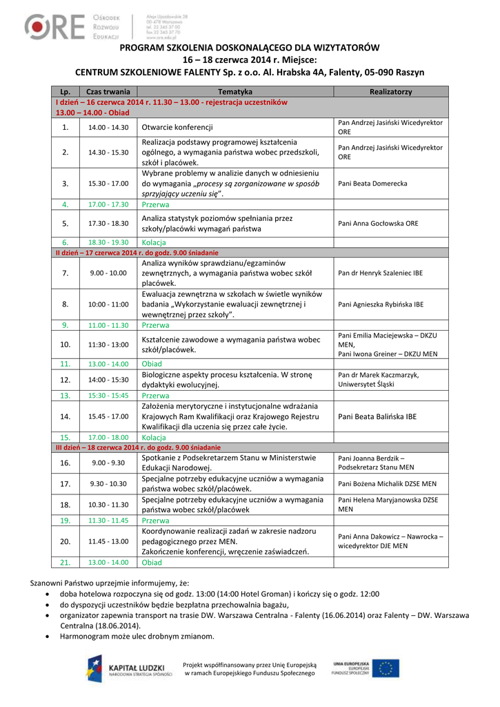 PROGRAM SZKOLENIA DOSKONALĄCEGO DLA WIZYTATORÓW 16 – 18 czerwca 2014 r. Miejsce: CENTRUM SZKOLENIOWE FALENTY Sp. z o.o. Al. Hrabska 4A, Falenty, 05-090 Raszyn Lp. Czas trwania Tematyka I dzień – 16 czerwca 2014 r. 11.30 – 13.00 - rejestracja uczestników 13.00 – 14.00 - Obiad 1. 14.00 - 14.30 2. 14.30 - 15.30 3. 15.30 - 17.00 4. 17.00 - 17.30 5. 17.30 - 18.30 Otwarcie konferencji Realizacja podstawy programowej kształcenia ogólnego, a wymagania państwa wobec przedszkoli, szkół i placówek. Wybrane problemy w analizie danych w odniesieniu do wymagania „procesy są zorganizowane w sposób sprzyjający uczeniu się”. Przerwa Analiza statystyk poziomów spełniania przez szkoły/placówki wymagań państwa Realizatorzy Pan Andrzej Jasiński Wicedyrektor ORE Pan Andrzej Jasiński Wicedyrektor ORE Pani Beata Domerecka Pani Anna Gocłowska ORE 18.30 - 19.30 6. Kolacja II dzień – 17 czerwca 2014 r. do godz. 9.00 śniadanie 7. 9.00 - 10.00 8. 10:00 - 11:00 9. 11.00 - 11.30 10. 11:30 - 13:00 11. 13.00 - 14.00 12. 14:00 - 15:30 13. 15:30 - 15:45 14. 15.45 - 17.00 Analiza wyników sprawdzianu/egzaminów zewnętrznych, a wymagania państwa wobec szkół placówek. Ewaluacja zewnętrzna w szkołach w świetle wyników badania „Wykorzystanie ewaluacji zewnętrznej i wewnętrznej przez szkoły”. Przerwa Kształcenie zawodowe a wymagania państwa wobec szkół/placówek. Obiad Biologiczne aspekty procesu kształcenia. W stronę dydaktyki ewolucyjnej. Przerwa Założenia merytoryczne i instytucjonalne wdrażania Krajowych Ram Kwalifikacji oraz Krajowego Rejestru Kwalifikacji dla uczenia się przez całe życie. Kolacja Pan dr Henryk Szaleniec IBE Pani Agnieszka Rybińska IBE Pani Emilia Maciejewska – DKZU MEN, Pani Iwona Greiner – DKZU MEN Pan dr Marek Kaczmarzyk, Uniwersytet Śląski Pani Beata Balińska IBE 17.00 - 18.00 15. III dzień – 18 czerwca 2014 r. do godz. 9.00 śniadanie 16. 9.00 - 9.30 17. 9.30 - 10.30 18. 10.30 - 11.30 19. 11.30 - 11.45 20. 11.45 - 13.00 21. 13.00 - 14.00 Spotkanie z Podsekretarzem Stanu w Ministerstwie Edukacji Narodowej. Specjalne potrzeby edukacyjne uczniów a wymagania państwa wobec szkół/placówek. Specjalne potrzeby edukacyjne uczniów a wymagania państwa wobec szkół/placówek Przerwa Koordynowanie realizacji zadań w zakresie nadzoru pedagogicznego przez MEN. Zakończenie konferencji, wręczenie zaświadczeń. Obiad Pani Joanna Berdzik – Podsekretarz Stanu MEN Pani Bożena Michalik DZSE MEN Pani Helena Maryjanowska DZSE MEN Pani Anna Dakowicz – Nawrocka – wicedyrektor DJE MEN Szanowni Państwo uprzejmie informujemy, że: doba hotelowa rozpoczyna się od godz. 13:00 (14:00 Hotel Groman) i kończy się o godz. 12:00, do dyspozycji uczestników będzie bezpłatna przechowalnia bagażu, organizator zapewnia transport na trasie DW. Warszawa Centralna - Falenty (16.06.2014) oraz Falenty – DW. Warszawa Centralna (18.06.2014). Harmonogram może ulec drobnym zmianom. Projekt współfinansowany przez Unię Europejską w ramach Europejskiego Funduszu Społecznego TRANSPORT 16 czerwca 2014 roku Trasa: Dworzec Warszawa Centralna – Centrum Szkoleniowe Falenty Autokary będą oczekiwać od 11:30 na parkingu pod Kinoteką (południowa strona Pałacu Kultury i Nauki) – mapka poniżej. Odjazd: 11:45 Czas przejazdu od 30 do 45 min (w zależności od natężenia ruchu). 18 czerwca 2014 roku Trasa: Centrum Szkoleniowe Falenty – Dworzec Warszawa Centralna Odjazd: 14:15 Projekt współfinansowany przez Unię Europejską w ramach Europejskiego Funduszu Społecznego INFORMACJA DLA OSÓB ZAKWATEROWANYCH W HOTELU GROMAN W związku z organizowanym spotkaniem w dniach 16-18 czerwca br. w Centrum Konferencyjnym Falenty uprzejmie informujemy, że został dla części z Państwa zarezerwowany nocleg w Hotelu Groman - Aleja Krakowska 76, 05-090 Sękocin Stary. Hotel Groman oddalony jest od Centrum Konferencyjnego Falenty o 5,8 km, a czas przejazdu zajmuje ok 10-25 minut (w zależności od godziny przejazdu). Hotel Groman: Poniżej przedstawiamy harmonogram transportu autokarowego. Autokary oczekiwać będą na Państwa pól godziny przed planowanym odjazdem oraz będą oznakowane logotypem ORE i trasą przejazdu. Data: 16.06 Godzina odjazdu: 11.45 16.06 16.06 17.06 17.06. 18.06 18.06 12.20 19.45 08.15 18.15 08.15 14.15 Miejsce zbiórki: Parking pod Kinoteką przy Pałacu Kultury Hotel Groman Centrum Falenty Hotel Groman Centrum Falenty Hotel Groman Centrum Falenty Przyjazd do: Hotel Groman Centrum Falenty Hotel Groman Centrum Falenty Hotel Groman Centrum Falenty Dworzec Centralny Warszawa Hotel Groman jest obiektem trzygwiazdkowym. Wszystkie pokoje są z łazienkami oraz posiadają bezprzewodowy dostęp do Internetu. Doba Hotelowa w Hotelu Groman rozpoczyna się o godzinie 14.00. Pokoje będą udostępniane w miarę możliwości już od godziny 11.30. Jak sprawdzić w którym obiekcie Państwo nocujecie? Ta informacja jest w indywidualnym mailu, który Państwo dostaliście, w treści - w sekcji „Nocleg”: Projekt współfinansowany przez Unię Europejską w ramach Europejskiego Funduszu Społecznego