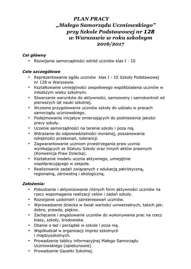 PLAN PRACY „Małego Samorządu Uczniowskiego” przy Szkole Podstawowej nr 128 w Warszawie w roku szkolnym 2016/2017 Cel główny • Rozwijanie samorządności wśród uczniów klas I - III Cele szczegółowe • Reprezentowanie ogółu uczniów klas I - III Szkoły Podstawowej nr 128 w Warszawie. • Kształtowanie umiejętności zespołowego współdziałania uczniów w młodszym wieku szkolnym. • Stwarzanie warunków do aktywności, samooceny i samokontroli od pierwszych lat nauki szkolnej. • Wczesne przygotowanie uczniów szkoły do udziału w pracach samorządu uczniowskiego. • Podejmowanie inicjatyw zmierzających do podniesienia jakości pracy szkoły. • Uczenie samorządności na terenie szkoły i poza nią. • Wdrażanie do odpowiedzialności moralnej, poszanowania odrębności przekonań, tolerancji. • Zagwarantowanie uczniom przestrzegania praw ucznia wynikających ze Statutu Szkoły oraz innych aktów prawnych (Konwencja Praw Dziecka). • Kształcenie modelu ucznia aktywnego, umiejętnie współpracującego w zespole. • Realizowanie zadań związanych z edukacją patriotyczną, regionalną, zdrowotną i ekologiczną. Założenia: • Pobudzanie i aktywizowanie różnych form aktywności uczniów na rzecz wspomagania realizacji celów i zadań szkoły. • Rozwijanie uzdolnień i zainteresowań uczniów. • Wprowadzenie dziecka w świat wartości uniwersalnych, takich jak: dobro, prawda, piękno. • Zachęcanie i angażowanie uczniów do wykonywania prac na rzecz klasy, szkoły, środowiska. • Dbanie o ład i porządek w szkole i poza nią. • Współudział w organizacji imprez szkolnych i międzyszkolnych. • Prowadzenie tablicy informacyjnej Małego Samorządu Uczniowskiego (opiekunowie). • Prowadzenie Gazetki Szkolnej. • Organizacja i udział w akcjach charytatywnych. • Organizacja konkursów. Formy realizacji: • Przygotowanie imprez i uroczystości szkolnych. • Prowadzenie gazetek szkolnych. • Bieżąca aktualizacja tablicy informacyjnej (opiekun). • Zapoznanie uczniów z Konwencją Praw Dziecka. • Organizowanie akcji charytatywnych. • Zorganizowanie i przeprowadzenie konkursów dla uczniów klas I - III. Metody pracy: • Rozmowa, dyskusja, pogadanka. • Praktyczne działania. Plan pracy Małego Samorządu Uczniowskiego w klasach I–III w roku szkolnym 2016/2017 LP. ZADANIA ODPOWIEDZIALNI Wrzesień Kampania wyborcza - wybory do Rady MSU (klasy 2 i 3). Wyłonienie przedstawicieli Małego Samorządu 1. Uczniowskiego. Wykonanie pamiątkowego zdjęcia członków samorządu K. Wołoszyn E. Wertelecka 2. Dzień Chłopca- zabawa przy muzyce w przerwach wychowawcy klas 3. Pomoc zwierzętom ze schroniska – zbiórka karmy wychowawcy klas wychowawcy klas 4. Zbiórka nakrętek Październik 5. Konkurs plastyczny „ Światowy dzień zwierząt” K. Wołoszyn E. Wertelecka Święto Edukacji Narodowej. Konkurs literacki 6. „ Wiersze i rymowanki dla Nauczycieli” przygotowanie kartek okolicznościowych. wychowawcy klas 7. Zważ swoje serce – udział w akcji „ Góra grosza” K. Wołoszyn wspólnie z opiekunem Dużego Samorządu Uczniowskiego Listopad 8. 9. 10. Gazetka przybliżająca miejsca pamięci narodowej znajdujące się na naszym terenie K. Wołoszyn Organizacja wspólnych Andrzejek szkolnych, wieczoru wróżb i zabawy wychowawcy klas „W trosce o ptaki”- założenie klasowych stołówek dla ptaków. wychowawcy klas Grudzień 12. Mikołajki „W czapce Mikołaja każdemu do twarzy”. K. Wołoszyn 13. „Święta tuż, tuż” – konkurs na najlepiej udekorowaną salę. K. Wołoszyn Styczeń 14. Baliki karnawałowe- I-III 15. wychowawcy klas Udział w Ogólnopolskiej Akcji Wielka Orkiestra Świątecznej Pomocy K. Wołoszyn E. Wertelecka Luty „Walentynkowe niespodzianki” 16. liścik dla ulubionej koleżanki i kolegi K. Wołoszyn Marzec 17. Dzień Kobiet – „Kwiatek dla mojej Pani” wykonanie upominków dla wszystkich pań pracujących w szkole wychowawcy klas Pierwszy Dzień Wiosny. „Wiosna wokół nas” Konkurs literacki na najpiękniejszy wiersz o 18. wiośnie K. Wołoszyn E. Wertelecka 19. Konkurs czytelniczy w klasach III K. Wołoszyn E. Wertelecka Kwiecień 20. Prima aprilis w naszej szkole, dzień szkolnych żartów 21. Święto Ziemi. Plakat. Pogadanka o recyklingu K. Wołoszyn Wychowawcy klas Maj 22. Organizacja Dnia Matki wg pomysłu wychowawców wychowawcy klas 23. Konkurs ortograficzny „ Zabawy z ortografią” K. Wołoszyn E. Wertelecka Czerwiec 24. Dzień Dziecka wychowawcy klas 25. Przeprowadzenie rozmów nt. bezpiecznego spędzania wakacji wychowawcy klas Zakończenie roku szkolnego- podsumowanie pracy uczniów Mały Samorząd Uczniowski będzie podejmował również działania we współpracy z Samorządem Szkolnym i biblioteką oraz wynikające z bieżącej działalności szkoły. Opiekun zastrzega sobie prawo do wprowadzenia zmian w planie działań Małego Samorządu Uczniowskiego. Opiekun Małego Samorządu Uczniowskiego: Ø Ø Karolina Wołoszyn Elżbieta Wertelecka