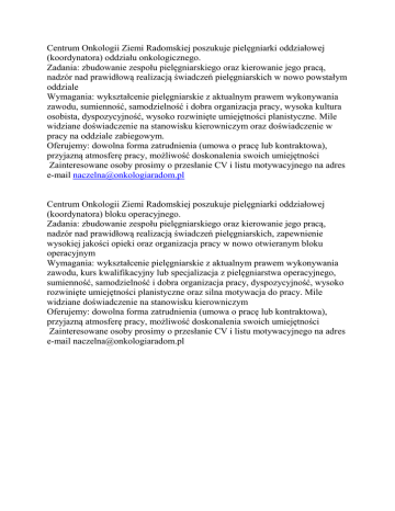 Centrum Onkologii Ziemi Radomskiej poszukuje pielęgniarki oddziałowej (koordynatora) oddziału onkologicznego. Zadania: zbudowanie zespołu pielęgniarskiego oraz kierowanie jego pracą, nadzór nad prawidłową realizacją świadczeń pielęgniarskich w nowo powstałym oddziale Wymagania: wykształcenie pielęgniarskie z aktualnym prawem wykonywania zawodu, sumienność, samodzielność i dobra organizacja pracy, wysoka kultura osobista, dyspozycyjność, wysoko rozwinięte umiejętności planistyczne. Mile widziane doświadczenie na stanowisku kierowniczym oraz doświadczenie w pracy na oddziale zabiegowym. Oferujemy: dowolna forma zatrudnienia (umowa o pracę lub kontraktowa), przyjazną atmosferę pracy, możliwość doskonalenia swoich umiejętności Zainteresowane osoby prosimy o przesłanie CV i listu motywacyjnego na adres e-mail [email protected] Centrum Onkologii Ziemi Radomskiej poszukuje pielęgniarki oddziałowej (koordynatora) bloku operacyjnego. Zadania: zbudowanie zespołu pielęgniarskiego oraz kierowanie jego pracą, nadzór nad prawidłową realizacją świadczeń pielęgniarskich, zapewnienie wysokiej jakości opieki oraz organizacja pracy w nowo otwieranym bloku operacyjnym Wymagania: wykształcenie pielęgniarskie z aktualnym prawem wykonywania zawodu, kurs kwalifikacyjny lub specjalizacja z pielęgniarstwa operacyjnego, sumienność, samodzielność i dobra organizacja pracy, dyspozycyjność, wysoko rozwinięte umiejętności planistyczne oraz silna motywacja do pracy. Mile widziane doświadczenie na stanowisku kierowniczym Oferujemy: dowolna forma zatrudnienia (umowa o pracę lub kontraktowa), przyjazną atmosferę pracy, możliwość doskonalenia swoich umiejętności Zainteresowane osoby prosimy o przesłanie CV i listu motywacyjnego na adres e-mail [email protected]