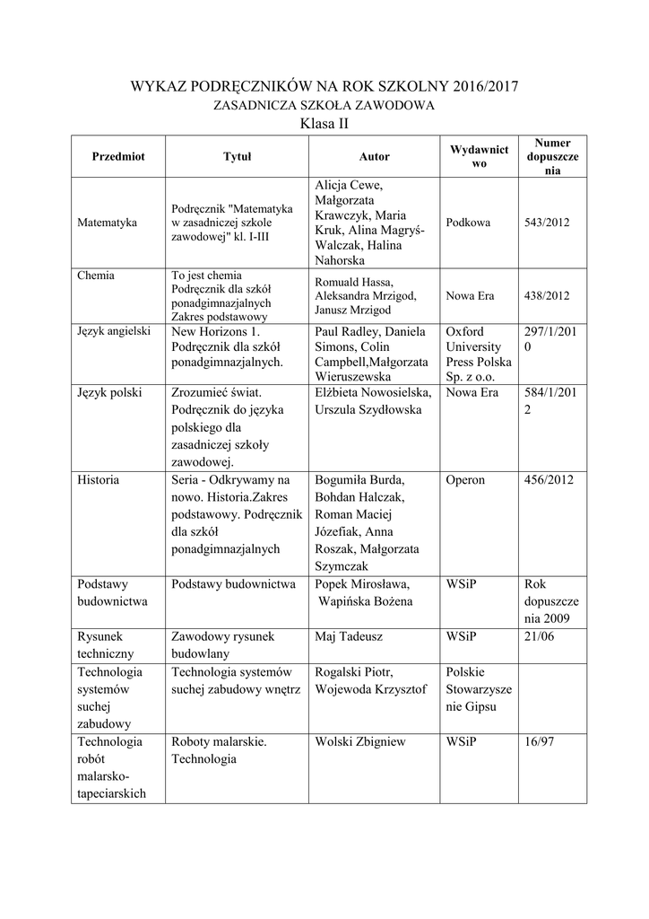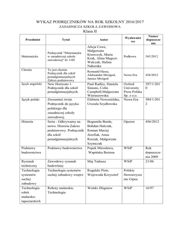 WYKAZ PODRĘCZNIKÓW NA ROK SZKOLNY 2016/2017 ZASADNICZA SZKOŁA ZAWODOWA Klasa II Przedmiot Matematyka Chemia Tytuł Wydawnict wo Numer dopuszcze nia Podręcznik "Matematyka w zasadniczej szkole zawodowej" kl. I-III Alicja Cewe, Małgorzata Krawczyk, Maria Kruk, Alina MagryśWalczak, Halina Nahorska Podkowa 543/2012 To jest chemia Podręcznik dla szkół ponadgimnazjalnych Zakres podstawowy Romuald Hassa, Aleksandra Mrzigod, Janusz Mrzigod Nowa Era 438/2012 Paul Radley, Daniela Simons, Colin Campbell,Małgorzata Wieruszewska Elżbieta Nowosielska, Urszula Szydłowska Oxford 297/1/201 University 0 Press Polska Sp. z o.o. Nowa Era 584/1/201 2 Bogumiła Burda, Bohdan Halczak, Roman Maciej Józefiak, Anna Roszak, Małgorzata Szymczak Popek Mirosława, Wapińska Bożena Operon 456/2012 WSiP Rok dopuszcze nia 2009 21/06 Język angielski New Horizons 1. Podręcznik dla szkół ponadgimnazjalnych. Język polski Zrozumieć świat. Podręcznik do języka polskiego dla zasadniczej szkoły zawodowej. Seria - Odkrywamy na nowo. Historia.Zakres podstawowy. Podręcznik dla szkół ponadgimnazjalnych Historia Autor Podstawy budownictwa Podstawy budownictwa Rysunek techniczny Technologia systemów suchej zabudowy Technologia robót malarskotapeciarskich Zawodowy rysunek budowlany Technologia systemów suchej zabudowy wnętrz Maj Tadeusz WSiP Rogalski Piotr, Wojewoda Krzysztof Polskie Stowarzysze nie Gipsu Roboty malarskie. Technologia Wolski Zbigniew WSiP 16/97