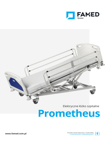 Elektryczne łóżko szpitalne Prometheus www.famed.com.pl Produkt został wykonany z materiałów, o właściwościach antybakteryjnych. Prometheus Elektryczne łóżko szpitalne Prometheus jest mobilnym, w pełni elektrycznym łóżkiem szpitalnym, charakteryzującym się minimalną wysokością leża od podłogi poniżej pułapu 29 cm. Bardzo dobre parametry techniczne produktu, w połączeniu z przystępną ceną, powodują że jest on atrakcyjną alternatywą dla klasycznych łóżek szpitalnych. Kluczowe właściwości: Nanotechnologia srebra została wprowadzona do części tworzywowych m.in. szczytów i podwójnych barierek bocznych oraz do farby, którą pomalowane są metalowe części łóżka, co nadaje produktowi właściwości anty drobnoustrojowe oraz zapobiega infekcjom. Minimalna wysokość leża od podłogi poniżej 30 cm zmniejsza ryzyko upadku oraz ułatwia schodzenie z łóżka. Wybrane pozycje łóżka: Niska pozycja łóżka Wyposażenie standardowe: • 4 siłowniki elektryczne • indywidualna blokada kół • pilot z kluczykiem • szczyty z plastiku • panel sterujący • centralna blokada kół • autoregresja • wydłużenie leża • lampka do czytania Poręcze boczne: Alternatywna wersja łóżka: Pozycja Fowlera Poręcze boczne chromowane, składane Pozycja Trendelenburga • uchwyt na woreczki na płyny fizjologiczne • wieszak kroplówki • uchwyt ręki • łóżko wyposażone w szczyty i poręcze boczne pokryte antybakteryjną miedzią Cu+ Poręcze boczne lakierowane, składane Pozycja Anty-Trendelenburga Akcesoria i opcje: Dane techniczne Długość łóżka 2085 (± 6) mm Szerokość łóżka 970 mm Regulacja wysokości 290 – 835 mm Pozycja Trendelenburga 14° Pozycja anty-Trendelenburga 18° Minimalną wysokością leża od podłogi 290 mm Dopuszczalne obciążenie 215 kg Famed Żywiec Sp. z o.o. ul. Fabryczna 1 34-300 Żywiec, Polska Centrala: tel.: +48 33 866 62 00 fax: +48 33 475 58 90 Dział Handlowy: tel.: +48 33 866 63 08 tel.: +48 33 866 63 10 tel.: +48 33 866 63 12 tel.: +48 33 866 63 17 fax: +48 33 861 30 79 Oferowana kolorystyka szczytów: [email protected] www.famed.com.pl 6 5 4 3 2 1 1. RAL 5002 2. RAL 5024 3. RAL 6027 4. RAL 1015 5. RAL 6019 6. RAL 1018 Szeroki wachlarz ustawień z poziomu pilota przewodowego: Regulacja oparcia pleców Regulacja oparcia pleców Regulacja segmentu uda Regulacja segmentu uda Pozycja Fowlera Pozycja Fowlera Pozycja do badań Regulacja wysokości Pozycja Trendelenburga A ZY J ST SZA P ODUKC R C Edycja 04/2016/01. Zastrzega się możliwość modyfikacji w wyniku postępu technicznego. RODUCTIO RP N NE EWORK AM FR Produkt spełnia wymogi Europejskiej Dyrektywy MDD 93/42/EEC dotyczącej wyrobów medycznych oraz Ustawy o wyrobach medycznych UNEP IE CLE A Pozycja anty-Trendelenburga