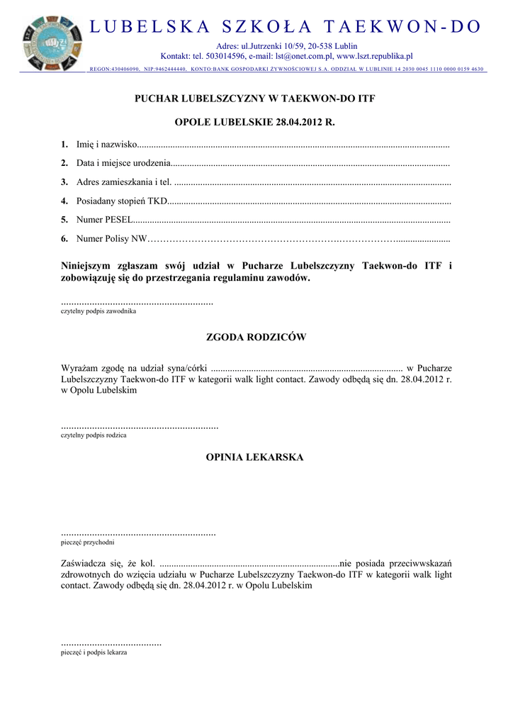 LUBELSKA SZKOŁA TAEKWON-DO Adres: ul.Jutrzenki 10/59, 20-538 Lublin Kontakt: tel. 503014596, e-mail: [email protected], www.lszt.republika.pl REGON:43 040609 0, NIP:9462444440, KONTO:BANK GOSPODARKI ŻYWNOŚ CIOWE J S.A. ODDZI AŁ W LUBLINIE 14 2030 0045 1110 00 00 0159 4630 PUCHAR LUBELSZCYZNY W TAEKWON-DO ITF OPOLE LUBELSKIE 28.04.2012 R. 1. Imię i nazwisko.................................................................................................................................... 2. Data i miejsce urodzenia...................................................................................................................... 3. Adres zamieszkania i tel. ..................................................................................................................... 4. Posiadany stopień TKD........................................................................................................................ 5. Numer PESEL...................................................................................................................................... 6. Numer Polisy NW…………………………………………………….………………....................... Niniejszym zgłaszam swój udział w Pucharze Lubelszczyzny Taekwon-do ITF i zobowiązuję się do przestrzegania regulaminu zawodów. ........................................................... czytelny podpis zawodnika ZGODA RODZICÓW Wyrażam zgodę na udział syna/córki ................................................................................. w Pucharze Lubelszczyzny Taekwon-do ITF w kategorii walk light contact. Zawody odbędą się dn. 28.04.2012 r. w Opolu Lubelskim ............................................................. czytelny podpis rodzica OPINIA LEKARSKA ............................................................ pieczęć przychodni Zaświadcza się, że kol. ............................................................................nie posiada przeciwwskazań zdrowotnych do wzięcia udziału w Pucharze Lubelszczyzny Taekwon-do ITF w kategorii walk light contact. Zawody odbędą się dn. 28.04.2012 r. w Opolu Lubelskim ....................................... pieczęć i podpis lekarza