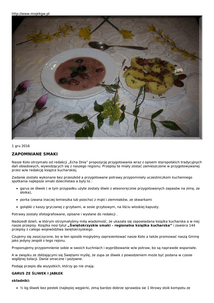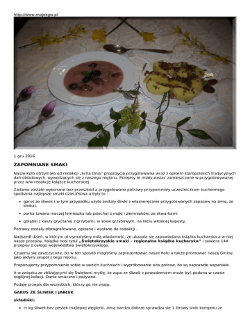 http://www.mojekgw.pl 1 gru 2016 ZAPOMNIANE SMAKI Nasze Koło otrzymało od redakcji „Echa Dnia” propozycję przygotowania wraz z opisem staropolskich tradycyjnych dań obiadowych, wywodzących się z naszego regionu. Przepisy te miały zostać zamieszczone w przygotowywanej przez w/w redakcję książce kucharskiej. Zadanie zostało wykonane bez przeszkód a przygotowane potrawy przypomniały uczestniczkom kuchennego spotkania najlepsze smaki dzieciństwa a były to : garus ze śliwek ( w tym przypadku użyte zostały śliwki z własnoręcznie przygotowanych zapasów na zimę, ze słoika), porka (zwana inaczej lemieszka lub psiocha) z mąki i ziemniaków, ze skwarkami gołąbki z kaszy gryczanej z grzybami, w sosie grzybowym, na liściu włoskiej kapusty. Potrawy zostały sfotografowane, opisane i wysłane do redakcji . Nadszedł dzień, w którym otrzymałyśmy miłą wiadomość, że ukazała się zapowiadana książka kucharska a w niej nasze przepisy. Książka nosi tytuł „Świętokrzyskie smaki - regionalna książka kucharska” i zawiera 144 przepisy z całego województwa świętokrzyskiego. Czujemy się zaszczycone, bo w ten sposób mogłyśmy zaprezentować nasze Koło a także promować naszą Gminę jako jedyny zespół z tego rejonu. Proponujemy przypomnienie sobie w swoich kuchniach i wypróbowanie w/w potraw, bo są naprawde wspaniałe. A w związku ze zbliżającymi się Świętami myślę, że zupa ze śliwek z powodzeniem może być podana w czasie wigilijnej kolacji. Danie smaczne i pożywne. Podaję przepis dla wszystkich, którzy go nie znają: GARUS ZE ŚLIWEK I JABŁEK składniki: ½ kg śliwek bez pestek (najlepiej węgierki, zimą bardzo dobrze sprawdza sie 1 litrowy słoik kompotu ze sliwkami), 2 – 3 winne jabłka, cukier do smaku, kilka goździków, szczypta cynamonu lub kawałek laski, rodzynki, ½ szkl mleka, 2 łyżki mąki, sok z cytryny. Wykonanie : Wypestkowane śliwki, jabłka pokrojone w ósemki, mogą być ze skórką, wrzucamy do garnka i zalewamy 2 litrami wody, gotujemy do miękkości owoców. Dodajemy cukier, goździki, cynamon, rodzynki, sok z cytryny (do smaku). Mleko mieszamy z mąką i zawiesiną podprawiamy zupę do zagęstnienia. Podajemy z ugotowanymi całymi ziemniakami pokraszonymi skwarkami i posypanymi koperkiem, bądź cebulką zesmażoną na złoty kolor na dwóch łyżkach masła. Smacznego. W imieniu Koleżanek z Koła Przewodnicząca KGW, Halina Dragan. Halina D. z Koło Gospodyń wiejskich Wyszmontów