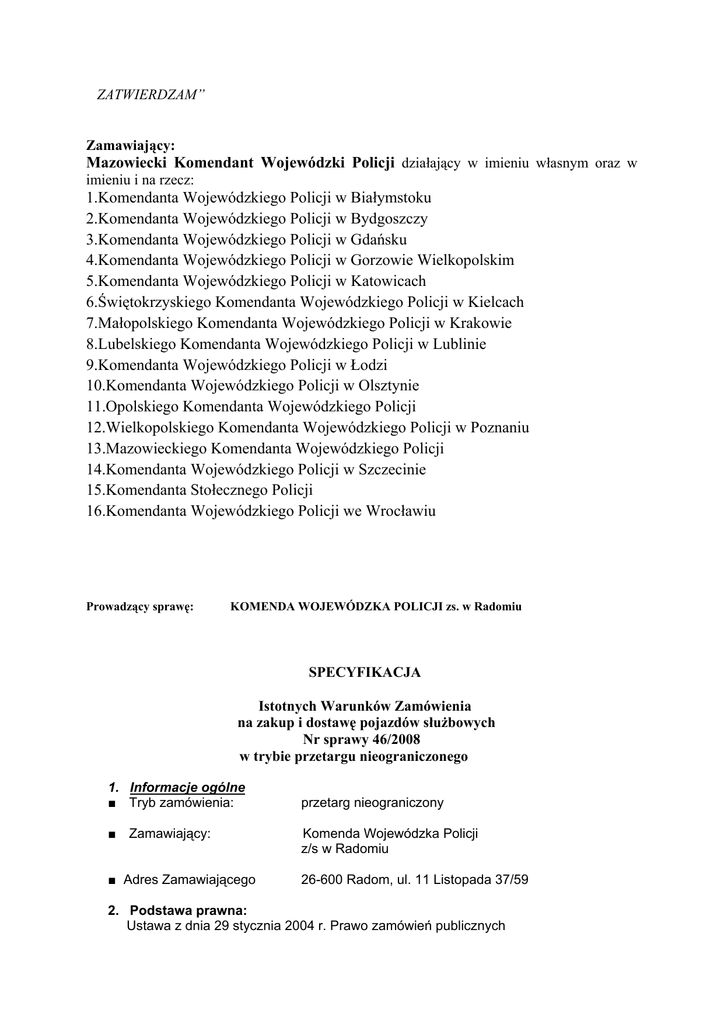 ZATWIERDZAM” Zamawiający: Mazowiecki Komendant Wojewódzki Policji działający w imieniu własnym oraz w imieniu i na rzecz: 1.Komendanta Wojewódzkiego Policji w Białymstoku 2.Komendanta Wojewódzkiego Policji w Bydgoszczy 3.Komendanta Wojewódzkiego Policji w Gdańsku 4.Komendanta Wojewódzkiego Policji w Gorzowie Wielkopolskim 5.Komendanta Wojewódzkiego Policji w Katowicach 6.Świętokrzyskiego Komendanta Wojewódzkiego Policji w Kielcach 7.Małopolskiego Komendanta Wojewódzkiego Policji w Krakowie 8.Lubelskiego Komendanta Wojewódzkiego Policji w Lublinie 9.Komendanta Wojewódzkiego Policji w Łodzi 10.Komendanta Wojewódzkiego Policji w Olsztynie 11.Opolskiego Komendanta Wojewódzkiego Policji 12.Wielkopolskiego Komendanta Wojewódzkiego Policji w Poznaniu 13.Mazowieckiego Komendanta Wojewódzkiego Policji 14.Komendanta Wojewódzkiego Policji w Szczecinie 15.Komendanta Stołecznego Policji 16.Komendanta Wojewódzkiego Policji we Wrocławiu Prowadzący sprawę: KOMENDA WOJEWÓDZKA POLICJI zs. w Radomiu SPECYFIKACJA Istotnych Warunków Zamówienia na zakup i dostawę pojazdów służbowych Nr sprawy 46/2008 w trybie przetargu nieograniczonego 1. Informacje ogólne ■ Tryb zamówienia: przetarg nieograniczony ■ Zamawiający: Komenda Wojewódzka Policji z/s w Radomiu ■ Adres Zamawiającego 26-600 Radom, ul. 11 Listopada 37/59 2. Podstawa prawna: Ustawa z dnia 29 stycznia 2004 r. Prawo zamówień publicznych (Dz. U. Nr 19 poz.177 z dnia 09.02.2004 r.( z późn. zm. ) 3. Przedmiot zamówienia: Zakup i dostawa pojazdów osobowych nieoznakowanych – 258 sztuk. Zamawiający dopuszcza zaoferowanie pojazdów przez wykonawcę tylko jednej marki oraz modelu z wyposażeniem zgodnie z załącznikiem nr1.1 pkt.5 ppkt.3. Zamawiający przewiduje udzielenie zamówień uzupełniających, zgodnie z art. 67 ust 1 pkt 7, stanowiących nie więcej niż 20 % zamówienia podstawowego i polegających na rozszerzeniu dostawy. Wykonawca zobowiązuje się do dostarczenia własnym transportem i na koszt własny przedmiotów zamówienia do siedzib jednostek Policji, wymienionych poniżej : . L.p Jednostka Policji Miejsce dostawy pojazdów Wydział Transportu KWP w Białymstoku ul. Hajnowska 8/10, Białystok Wydział Transportu KWP w Bydgoszczy ul. Iławska 1, Bydgoszcz 1 KWP Białystok (woj. podlaskie) 2 KWP Bydgoszcz (woj. kujawsko pomorskie) 3 KWP Gdańsk (woj. pomorskie) 4 KWP Gorzów Wielkopolski (woj. lubuskie) 5 KWP Katowice (woj. śląskie) 6 KWP Kielce (woj. świętokrzyskie) 7 KWP Kraków (woj. małopolskie) 8 KWP Lublin (woj. lubelskie) Wydział Transportu KWP w Lublinie ul. Grenadierów 3, Lublin 9 KWP Łódź (woj. łódzkie) Wydział Transportu KWP w Łodzi ul. Stokowska 21/25, Łódź KWP Olsztyn 10 (woj. warmińsko mazurskie) Komenda Wojewódzka Policji w Olsztynie ul. Pstrowskiego 3, Olsztyn Wydział Transportu KWP w Gdańsku ul. 3-go Maja 7, Gdańsk Komenda Wojewódzka Policji w Gorzowie Wielkopolskim ul. Kwiatowa 10, Gorzów Wielkopolski Komenda Wojewódzka Policji w Katowicach ul. Lompy 19, Katowice Wydział Transportu KWP w Kielcach ul. Kusocińskiego 51, Kielce Komenda Wojewódzka Policji w Krakowie ul. Mogilska 109, Kraków 11 KWP Opole (woj. opolskie) Stacja Obsługi ul. Oleska 95, Opole 12 KWP Poznań (woj. wielkopolskie) Garaż KWP ul. Mansfelda 8, Poznań 13 KWP zs. w Radomiu (woj. mazowieckie) Wydział Transportu KWP z s. w Radomiu ul. Energetyków 14, Radom 14 KWP Szczecin (woj. zachodniopomorskie) 15 KSP Warszawa (woj. mazowieckie) Wydział Transportu KSP ul. Karolkowa 46, Warszawa 16 KWP Wrocław (woj. dolnośląskie) Wydział Transportu KWP we Wrocławiu ul. Połbina 1, Wrocław Wydział Transportu KWP w Szczecinie ul. Wernyhory 5, Szczecin Kod CPV – Wspólny Słownik Zamówień Główny przedmiot – 34000000-7 Dodatkowy przedmiot – 34114200-1 4. Termin realizacji zamówienia : do 12 grudnia 2008 5. Zamawiający nie dopuszcza składania ofert wariantowych , częściowych oraz nie przewiduje zastosowania aukcji elektronicznej. 6. Forma porozumiewania się zamawiającego z wykonawcami. 1). Oświadczenia, wnioski, zawiadomienia oraz informacje zamawiający i wykonawcy przekazują pisemnie. 2). Jeżeli Zamawiający lub Wykonawca przekazuje oświadczenia, wnioski, zawiadomienia oraz informacje faksem, każda ze stron na żądanie drugiej niezwłocznie potwierdza fakt ich otrzymania. Ogłoszenie o zamówieniu przekazano drogą elektroniczną Urzędowi Oficjalnych Publikacji Wspólnot Europejskich w dniu 30.05.2008 Specyfikacja Istotnych Warunków Zamówienia dostępna będzie na stronie internetowej – www.mazowiecka.policja.gov.pl od dnia publikacji w Dzienniku Urzędowym 7. Osobami uprawnionymi do kontaktów z Wykonawcami są : Sprawy formalno – prawne – Leszek Jaczyński Sekcja Zamówień Publicznych KWP z s. w Radomiu – tel. 48 345 – 31 – 03 Sprawy techniczne - Paweł Skrzek, Jacek Górka - Wydział Transportu KWP zs. w Radomiu – tel. 0 48 345 – 32 – 19 8. O udzielenie zamówienia publicznego mogą ubiegać się Wykonawcy, którzy: 1 ) posiadają uprawnienia do wykonywania określonej działalności lub czynności, jeżeli ustawy nakładają obowiązek posiadania takich uprawnień, 2 ) posiadają niezbędną wiedzę i doświadczenie oraz dysponują potencjałem technicznym i osobami zdolnymi do wykonania zamówienia, 3 ) znajdują się w sytuacji ekonomicznej i finansowej zapewniającej wykonanie zamówienia, 4 ) nie podlegają wykluczeniu z postępowania o udzielenie zamówienia na podstawie art. 24. oraz złożą oświadczenie o nie podleganiu przez Wykonawcę wykluczeniu z postępowania na mocy art. 24 Ustawy Prawo zamówień publicznych i spełnieniu warunków art.22 ust 1 cyt. Ustawy ( wzór stanowi Załącznik Nr 2 ). Oświadczenie musi być podpisane przez osobę ( osoby ) upoważnione do reprezentowania Wykonawcy. Zamawiający dokona oceny spełnienia przez Wykonawców warunków udziału w postępowaniu na podstawie załączonych dokumentów i