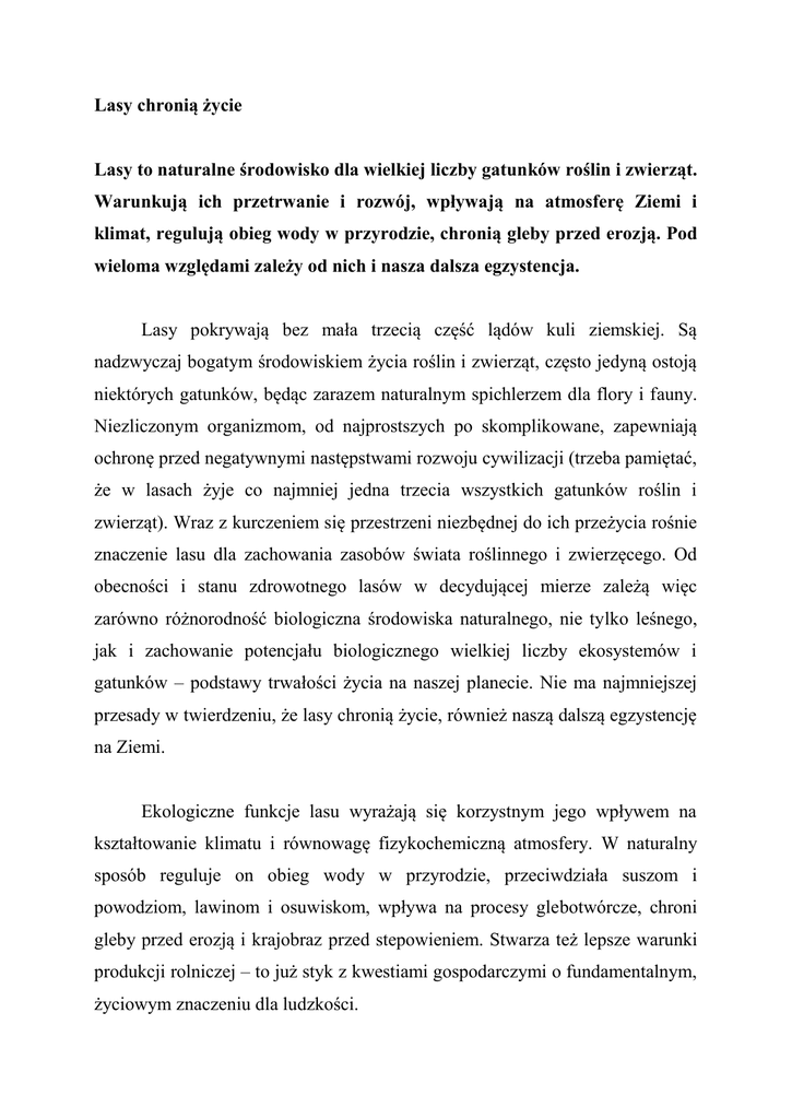 Lasy chronią życie Lasy to naturalne środowisko dla wielkiej liczby gatunków roślin i zwierząt. Warunkują ich przetrwanie i rozwój, wpływają na atmosferę Ziemi i klimat, regulują obieg wody w przyrodzie, chronią gleby przed erozją. Pod wieloma względami zależy od nich i nasza dalsza egzystencja. Lasy pokrywają bez mała trzecią część lądów kuli ziemskiej. Są nadzwyczaj bogatym środowiskiem życia roślin i zwierząt, często jedyną ostoją niektórych gatunków, będąc zarazem naturalnym spichlerzem dla flory i fauny. Niezliczonym organizmom, od najprostszych po skomplikowane, zapewniają ochronę przed negatywnymi następstwami rozwoju cywilizacji (trzeba pamiętać, że w lasach żyje co najmniej jedna trzecia wszystkich gatunków roślin i zwierząt). Wraz z kurczeniem się przestrzeni niezbędnej do ich przeżycia rośnie znaczenie lasu dla zachowania zasobów świata roślinnego i zwierzęcego. Od obecności i stanu zdrowotnego lasów w decydującej mierze zależą więc zarówno różnorodność biologiczna środowiska naturalnego, nie tylko leśnego, jak i zachowanie potencjału biologicznego wielkiej liczby ekosystemów i gatunków – podstawy trwałości życia na naszej planecie. Nie ma najmniejszej przesady w twierdzeniu, że lasy chronią życie, również naszą dalszą egzystencję na Ziemi. Ekologiczne funkcje lasu wyrażają się korzystnym jego wpływem na kształtowanie klimatu i równowagę fizykochemiczną atmosfery. W naturalny sposób reguluje on obieg wody w przyrodzie, przeciwdziała suszom i powodziom, lawinom i osuwiskom, wpływa na procesy glebotwórcze, chroni gleby przed erozją i krajobraz przed stepowieniem. Stwarza też lepsze warunki produkcji rolniczej – to już styk z kwestiami gospodarczymi o fundamentalnym, życiowym znaczeniu dla ludzkości. Ocenia się, że do dziś na Ziemi zachowało się już tylko 60 proc. pierwotnej powierzchni lasów. Niestety, nie zawsze i nie wszędzie w dobrym stanie. Nawet w Europie, gdzie stan zielonych zasobów jest przedmiotem szczególnej troski społecznej, połowa lasów wykazuje mniejszy lub większy stopień uszkodzenia koron. A osłabienie i zamieranie zielonych ostępów przekłada się na zubożenie różnorodności biologicznej świata roślin i zwierząt, zmniejszając szanse jego przetrwania. Światowa Unia Ochrony Przyrody (IUCN) ocenia, że właśnie z tego powodu poważnie zagrożonych jest 12,5 proc. gatunków roślin i aż 75 proc. gatunków ssaków na naszym globie. Różnorodność biologiczna to nie tylko bogactwo puli genowej wszystkich żyjących populacji, ale również wielka mozaika gatunków oraz różnorodność ekosystemów i krajobrazów. Trzeba jednak mieć na uwadze, że na ów skomplikowany, pełen wzajemnych powiązań, przyrodniczy sezam w tej samej mierze składają się zarówno systemy zróżnicowane i bogate, jak i ubogie, które niegdyś zwykło się uważać za mniej cenne i istotne lub zgoła bezwartościowe. To nakłada na nas obowiązek zachowania jednych i drugich, związki bowiem zachodzące pomiędzy nimi sięgają głębiej niż można by sądzić. Właśnie dlatego z wielkim naciskiem podkreśla się, że nowoczesna gospodarka leśna musi być trwale zrównoważona i wielofunkcyjna – tylko taka uwzględnia powyższą zasadę na co dzień. Pod względem reprezentowanej różnorodności biologicznej polskie lasy, na tle wielu krajów europejskich, wypadają całkiem dobrze. Jest to ocena nie tylko polskich ekspertów. Są one składową różnorodności biologicznej zasobów przyrodniczych naszego kraju, ale też istotną częścią zasobów europejskich. Trwale zrównoważonej, wielofunkcyjnej i proekologicznej gospodarce leśnej przyświeca formuła zawarta w ustawie o lasach – najważniejszym dla polskiego leśnictwa akcie prawnym. Zgodnie z nią jest to „działalność zmierzająca do ukształtowania struktury lasów i ich wykorzystania w sposób i tempie zapewniającym trwałe zachowanie ich bogactwa biologicznego”. Takie przesłanki znajdziemy w codziennej praktyce Lasów Państwowych, zarządzających prawie 80 proc. lasów w Polsce. O jej powodzeniu świadczą najlepiej: dobry stan rodzimych lasów i postępujący wzrost lesistości kraju, a także zachowanie i rozwój ich różnorodności biologicznej. W środowisku leśnym naszego kraju występuje aż 32 tys. gatunków, czyli ok. 65 proc. wszystkich gatunków spotykanych w Polsce. Ponad 60 proc. gatunków kręgowców, 80 proc. gatunków grzybów wielkoowocnikowych, przytłaczająca większość mchów, paproci, skrzypów i widłaków, wielka grupa roślin kwiatowych czy owadów bytuje wyłącznie w lasach lub w jakimś stopniu związana jest z ekosystemami leśnymi. Trudno sobie wyobrazić, by tak ogromne bogactwo zachowało się, gdyby ludzie przez setki lat prowadzący gospodarkę w lasach nie czynili tego rozsądnie. Lasy Państwowe, organizacja powstała w 1924 r. do zarządzania przyrodniczym majątkiem Skarbu Państwa, ma w tej mierze poważne osiągnięcia. To właśnie leśnicy położyli w przeszłości ogromne zasługi w dziele ochrony różnorodności biologicznej. Inaczej nie mielibyśmy dziś dorodnych lasów, wielu rezerwatów, a niektóre gatunki flory i fauny oglądalibyśmy pewnie tylko na starych rycinach czy fotografiach. Wśród zielonych ostępów nie brak licznych świadectw mądrej, szanującej zasoby przyrodnicze, polityki prowadzonej przez pokolenia leśników. To także dzięki nim mamy dziś w Polsce prawie półtora tysiąca rezerwatów przyrody. W lwiej części utworzono je na gruntach pozostających pod zarządem Lasów Państwowych, a ponad połowa to rezerwaty leśne. W Lasach Państwowych jest też bez mała 11 tys. pomników przyrody, tysiąc użytków ekologicznych, są setki stanowisk dokumentacyjnych i zespołów przyrodniczo-krajobrazowych. Ponadto utworzono w nich prawie 3 tys. stref ochronnych o łącznej powierzchni prawie 160 tys. ha (w