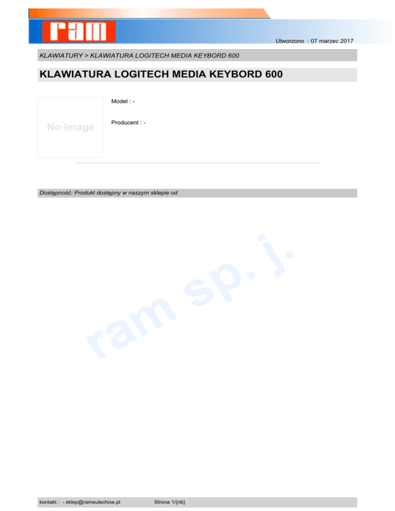 Utworzono : 07 marzec 2017 KLAWIATURY > KLAWIATURA LOGITECH MEDIA KEYBORD 600 KLAWIATURA LOGITECH MEDIA KEYBORD 600 Model : - No image Producent : - Dostępność: Produkt dostępny w naszym sklepie od . j . m a r kontakt : - [email protected] Strona 1/{nb} p s