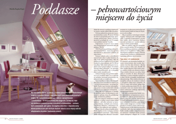 Monika Kupska-Kupis Poddasze Kto raz zamieszkał na poddaszu, z trudem odnajdzie się w standardowym wnętrzu o płaskim stropie i rygorystycznych podziałach funkcjonalnych wnętrz. Bo rzeczywiście poddasze – dobrze zaprojektowane i zrealizowane – to miejsce prawdziwie magiczne. Zazwyczaj staje się ulubionym pomieszczeniem wszystkich użytkowników – zarówno tych codziennych, jak i gości. Szczególna atmosfera i niepowtarzalny klimat pomieszczeń pod skośnym dachem skłania coraz więcej osób do adaptowania strychów i budowania nowych. 10 KREATOR–PROJEKTY • 6/2008 – pełnowartościowym miejscem do życia Jednak aby stworzyć na poddaszu niepowtarzalne wnętrze, musimy spełnić kilka warunków. Pierwszą podstawową sprawą jest oczywiście doświetlenie strychu. W niczym bowiem nie może on przypominać mrocznego, opuszczonego pomieszczenia. Światło, powietrze, przestrzeń są niezbędne do życia i w związku z tym poddasze musi być ich pełne. Najprostszym i w gruncie rzeczy najtańszym rozwiązaniem jest zastosowanie okien do poddaszy VELUX. VELUX jest firmą produkującą okna połaciowe już ponad 60 lat – mamy więc ogromne doświadczenie w doświetlaniu poddaszy na całym świecie. Pamiętać jednak trzeba o prawidłowym zamontowaniu okien w połaci dachowej, bo tylko wtedy spełnią swoją funkcję. Okno do poddaszy powinno znajdować się na tej samej wysokości co okno tradycyjne, tzn. 90–100 cm od podłogi. Tylko wtedy można przez nie wyglądać nawet w pozycji siedzącej. Ta wysokość zapewnia dobrą widoczność i nie powoduje uczuć klaustrofobicznych, jak w przypadku okien wysoko zainstalowanych. Uchwyt otwierający okno powinien znajdować się na wysokości około 2 m, co pozwala na swobodne otwieranie, zamontowanie dodatkowych rolet czy umycie szyby. Ogromną zaletą stosowania okien do podddaszy jest prostota zauważana we wnętrzu oraz – co jest nie do przecenienia – na zewnątrz budynku. Bardzo często bowiem nieskomplikowany, prosty w swoim rysunku dach z oknami połaciowymi jest najlepszym rozwiązaniem. Okna takie nie są agresywne w stosunku do całej bryły dachu, nie deformują jej, a jednocześnie spełniają swoją rolę, powiększając zasoby mieszkaniowe poddasza. Poza tym mogą być instalowane w sposób swobodny w każdym niemal miejscu połaci dachowej – jeśli tylko zachowane są wymogi konstrukcyjne, niezbędne przy montażu. Umożliwiają efektywne i równomierne doświetlenie nawet głębszych części poddasza. Długość okna jest zależna od spadku dachu. Dachy bardziej strome wymagają instalacji okien krótszych i przeciwnie – dachy bardziej płaskie wymagają okien dłuższych. Generalnie przyjmuje się, że płaszczyzna powierzchni szyb powinna stanowić około nie mniej niż 10 proc. powierzchni podłogi. Okna do poddaszy można łączyć w dowolne grupy. Umieszczać jedne nad drugimi, obok siebie, co pozwala na wprowadzenie znacznej ilości światła, słońca i powietrza. Poddasze optycznie powiększa się i zaczyna oddychać razem ze swoimi użytkownikami. Okna do poddaszy mają tyle zastosowań, ile jest stromych dachów. Od mieszkania czy biura na poddaszu po oranżerię czy domek letniskowy na wsi. Są dyskretne i lekkie, podkreślają elegancję architektury wnętrza. Otwierają nieograniczone możliwości architektoniczne i pozwalają realizować skryte marzenia. Typy okien i ich zastosowanie W sytuacjach, gdy konstrukcja budynku wymusza umiejscowienie okna wysoko alternatywą może być okno obrotowe z klamką umiejscowioną w dolej części skrzydła lub okno uchylno-obrotowe, które można otwierać uchylnie od dołu oraz obrotowo od góry. Okno uchylno-obrotowe ma jedną ważną zaletę w stosunku do okien obrotowych. Otwierając je, można swobodnie wychylić się za okno, tak jak w przypadku standardowego okna pionowego. Okna uchylno-obrotowe są szczególnie polecane do instalacji w dachach o stosunkowo niskim kącie nachylenia, od 20 do 55 stopni. Jeśli wymiary takiego okna w świetle przekraczają rozmiar 80 cm w obu wymiarach, może ono również służyć jako wyjście ewakuacyjne, spełniając odpowiednie wymogi bezpieczeństwa. Gdy okna są umiejscowione bardzo wysoko, odpowiednim rozwiązaniem jest sterowanie elektryczne. Oknem operować można przy pomocy pilota lub przycisku umocowanego w ścianie. Jeśli decyzje o sterowaniu elektrycznym zostawiamy na później, przy zakupie należy zwrócić uwagą na to, czy dany model pozwala na instalację systemu elektrycznego. Niektóre prostsze modele okien nie mają takiej możliwości. Jeśli okno jest umiejscowione bardzo wysoko i rzadko z niego korzystamy, do otwierania i zamykania można stosować drążek teleskopowy o długości ok. 2 m lub KREATOR–PROJEKTY • 6/2008 11 jest z grafitowej lub brązowej siateczki z polichlorku winylu, pochłania promienie słoneczne, redukując ilość ciepła przedostającego się do pomieszczenia nawet o 65 proc. Największą grupę akcesoriów stanowią rolety montowane wewnątrz pomieszczeń. Zapewniają prywatność oraz podstawową ochronę przed słońcem i ciepłem. Niektóre rolety zostały wyposażone w specjalną powłokę, która zapewnia najlepszą ochronę przed nadmiarem lub utratą ciepła. specjalny sznur o długości 5 m. Warto jeszcze przed zakupem i wyborem okna zastanowić się, jaki sposób otwierania będzie dla nas najwygodniejszy. Do pomieszczeń szczególnie wilgotnych jak kuchnie lub łazienki przeznaczone są okna o podwyższonej odporności na wilgoć. Okno wykonane jest z drewna pokrytego warstwą poliuretanu malowanego na kolor biały. Warstwa ta chroni drewno i ułatwia utrzymanie okna w czystości. Inną ciekawostką jest możliwość skonstruowania balkonu na dachu budynku. Efektem traktowania przez firmę VELUX poddasza jako pełnowartościowego miejsca do życia jest wprowadzenie na rynek unikalnego na rynku rozwiązania: okna-balkonu VELUX GDL Carbio, które mo