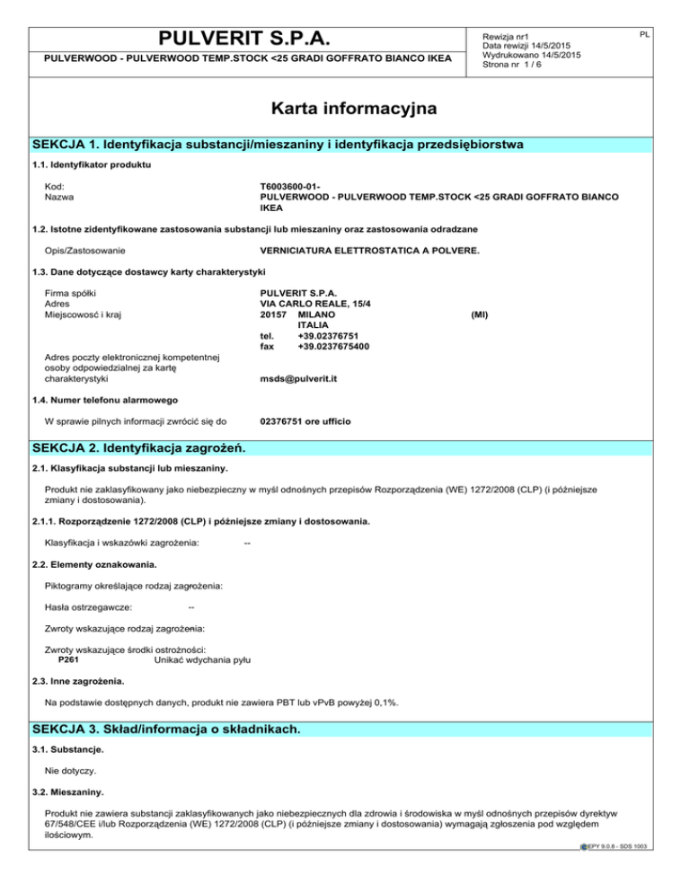PULVERIT S.P.A. PL Rewizja nr1 Data rewizji 14/5/2015 Wydrukowano 14/5/2015 Strona nr 1 / 6 PULVERWOOD - PULVERWOOD TEMP.STOCK <25 GRADI GOFFRATO BIANCO IKEA Karta informacyjna SEKCJA 1. Identyfikacja substancji/mieszaniny i identyfikacja przedsiębiorstwa 1.1. Identyfikator produktu Kod: Nazwa T6003600-01PULVERWOOD - PULVERWOOD TEMP.STOCK <25 GRADI GOFFRATO BIANCO IKEA 1.2. Istotne zidentyfikowane zastosowania substancji lub mieszaniny oraz zastosowania odradzane Opis/Zastosowanie VERNICIATURA ELETTROSTATICA A POLVERE. 1.3. Dane dotyczące dostawcy karty charakterystyki Firma spółki Adres Miejscowosć i kraj PULVERIT S.P.A. VIA CARLO REALE, 15/4 20157 MILANO ITALIA tel. +39.02376751 fax +39.0237675400 Adres poczty elektronicznej kompetentnej osoby odpowiedzialnej za kartę charakterystyki (MI) [email protected] 1.4. Numer telefonu alarmowego W sprawie pilnych informacji zwrócić się do 02376751 ore ufficio SEKCJA 2. Identyfikacja zagrożeń. 2.1. Klasyfikacja substancji lub mieszaniny. Produkt nie zaklasyfikowany jako niebezpieczny w myśl odnośnych przepisów Rozporządzenia (WE) 1272/2008 (CLP) (i późniejsze zmiany i dostosowania). 2.1.1. Rozporządzenie 1272/2008 (CLP) i późniejsze zmiany i dostosowania. Klasyfikacja i wskazówki zagrożenia: -- 2.2. Elementy oznakowania. -Piktogramy określające rodzaj zagrożenia: Hasła ostrzegawcze: -- -Zwroty wskazujące rodzaj zagrożenia: Zwroty wskazujące środki ostrożności: P261 Unikać wdychania pyłu 2.3. Inne zagrożenia. Na podstawie dostępnych danych, produkt nie zawiera PBT lub vPvB powyżej 0,1%. SEKCJA 3. Skład/informacja o składnikach. 3.1. Substancje. Nie dotyczy. 3.2. Mieszaniny. Produkt nie zawiera substancji zaklasyfikowanych jako niebezpiecznych dla zdrowia i środowiska w myśl odnośnych przepisów dyrektyw 67/548/CEE i/lub Rozporządzenia (WE) 1272/2008 (CLP) (i późniejsze zmiany i dostosowania) wymagają zgłoszenia pod względem ilościowym. EPY 9.0.8 - SDS 1003 PULVERIT S.P.A. PULVERWOOD - PULVERWOOD TEMP.STOCK <25 GRADI GOFFRATO BIANCO IKEA PL Rewizja nr1 Data rewizji 14/5/2015 Wydrukowano 14/5/2015 Strona nr 2 / 6 SEKCJA 4. Środki pierwszej pomocy. 4.1. Opis środków pierwszej pomocy. Nie są wymagane. W kazdym razie, zaleca się przestrzegać przepisów higieny pracy. 4.2. Najważniejsze ostre i opóźnione objawy oraz skutki narażenia. Nie są znane przypadki ujemnego skutkowania produktu na zdrowie. 4.3. Wskazania dotyczące wszelkiej natychmiastowej pomocy lekarskiej i szczególnego postępowania z poszkodowanym. Brak. SEKCJA 5. Postępowanie w przypadku pożaru. 5.1. Środki gaśnicze. ZALECANE ŚRODKI GAŚNICZE Zwykłe środki gaśnicze: dwutlenek węgla, piana, proszki gaśnicze i mgła chłodziwa. NIE ZALECANE ŚRODKI GAŚNICZE Żaden. 5.2. Szczególne zagrożenia związane z substancją lub mieszaniną. ZAGROŻENIA ZWIĄZANE Z EKSPOZYCJĄ NA POŻAR Unikać wdychania produktów rozkładu. Produkt jest łatwopalny, dane stężenie pyłu rozproszonego w powietrzu ze źródłem zapłonu w pobliżu może wytworzyć z powietrzem mieszaniny wybuchowe. Produkt stały, w przypadku niezamierzonego wydostania się z pojemnika, narażony na wysokie temperatury lub w kontakcie źródła zapłonu, może wywołać lub rozprzestrzenić pożar. 5.3. Informacje dla straży pożarnej. WSKAZÓWKI OGÓLNE Pojemniki chłodzić strumieniami wody, aby zapobiec rozkładowi produktu i powstaniu substancji potencjalnie szkodliwych dla zdrowia. Wyposażenie ochrony przeciwpożarowej należy stosować zawsze w komplecie. Zebrać mieszaninę gaśniczą nie odprowadzając do kanalizacji. Zanieczyszczoną wodę i pozostałości gaśnicze skierować do zniszczenia zgodnie z obowiązującymi normami. WYPOSAŻENIE OCHRONNE Stosowna odzież przeznaczona do akcji przeciwpożarowej, tj aparat powietrzny butlowy ze sprężonym powietrzem i otwartym obwodem (EN 137), odzież ognioodporna (EN469), rękawice ognioodporne (EN659) i obuwie wysokie dla strażaków (HO A29 lub A30). SEKCJA 6. Postępowanie w przypadku niezamierzonego uwolnienia do środowiska. 6.1. Indywidualne środki ostrożności, wyposażenie ochronne i procedury w sytuacjach awaryjnych. W przypadku par lub pyłu rozproszonych w powietrzu stosować ochronę dróg oddechowych. Niniejsze wskazówki odnoszą się do osób uczestniczących w obrocie substancją, jak również w przypadku sytuacji awaryjnej. 6.2. Środki ostrożności w zakresie ochrony środowiska. Unikać przedostania się produktu do kanalizacji, do wód powierzchniowych i do wód gruntowych. 6.3. Metody i materiały zapobiegające rozprzestrzenianiu się skażenia i służące do usuwania skażenia. Potraktować ziemią lub kruszywem. Zebrać większość materiału i usunąć pozostałości za pomocą strumieni wody. Likwidacja zanieczyszczonego materiału winna się odbywać zgodnie z wytycznymi zawartymi w punkcie 13. 6.4. Odniesienia do innych sekcji. Ewentualne informacje odnośnie do ochrony indywidualnej i postępowaniem z odpadami podano w punktach 8 i 13. SEKCJA 7. Postępowanie z substancjami i mieszaninami oraz ich magazynowanie. 7.1. Środki ostrożności dotyczące bezpiecznego postępowania. Przed manipulowowaniem produktu należy zapoznać się ze wszelkimi wskazówkami zawartymi w niniejszej karcie charakterystyki. Unikać uwolnienia produktu do środowiska. Podczas stosowania nie palić tytoniu, nie pić, nie jeść. 7.2. Warunki bezpiecznego magazynowania, łącznie z informacjami dotyczącymi wszelkich wzajemnych niezgodności. Przechowywać produkt w odpowiednio oznaczonych pojemnikach. Przechowywać pojemniki z dala od materiałów nie kompatybilnych, postępując zgodnie ze wskazówkami zawartymi w sekcji 10. 7.3. Szczególne zastosowanie(-a) końcowe. Brak. EPY 9.0.8 - SDS 1003 PULVERIT S.P.A. PULVERWOOD - PULVERWOOD TEMP.STOCK <25 GRADI GOFFRATO BIANCO IKEA PL Rewizja nr1 Data rewizji 14/5/2015 Wydrukowano 14/5/2015 Strona nr 3 / 6 SEKCJA 8. Kontrola narażenia/środki ochro