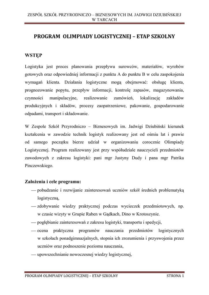 ZESPÓŁ SZKÓŁ PRZYRODNICZO – BIZNESOWYCH IM. JADWIGI DZIUBIŃSKIEJ W TARCACH PROGRAM OLIMPIADY LOGISTYCZNEJ – ETAP SZKOLNY WSTĘP Logistyka jest proces planowania przepływu surowców, materiałów, wyrobów gotowych oraz odpowiedniej informacji z punktu A do punktu B w celu zaspokojenia wymagań klienta. Działania logistyczne mogą obejmować: obsługę klienta, prognozowanie popytu, przepływ informacji, kontrolę zapasów, magazynowania, czynności manipulacyjne, realizowanie zamówień, lokalizację zakładów produkcyjnych i składów, procesy zaopatrzeniowe, pakowanie, gospodarowanie odpadami, transport i składowanie. W Zespole Szkół Przyrodniczo – Biznesowych im. Jadwigi Dziubiński kierunek kształcenia w zawodzie technik logistyk realizowany jest od ośmiu lat i prawie od samego początku bierze udział w organizowaniu corocznie Olimpiady Logistycznej. Program realizowany jest przy współudziale nauczycieli przedmiotów zawodowych z zakresu logistyki: pani mgr Justyny Dudy i pana mgr Patrika Pinczewskiego. Założenia i cele programu: pobudzanie i rozwijanie zainteresowań uczniów szkół średnich problematyką logistyczną, zdobywanie wiedzy praktycznej podczas wycieczek przedmiotowych, np. w czasie wizyty w Grupie Raben w Gądkach, Dino w Krotoszynie. pogłębianie zainteresowań z zakresu logistyki, transportu i spedycji, ocena praktyczna programów nauczania przedmiotów logistycznych w szkołach ponadgimnazjalnych, stopnia ich zrozumienia i przyswojenia przez uczniów oraz podnoszenie poziomu nauczania, upowszechnianie nowoczesnej wiedzy logistycznej, PROGRAM OLIMPIADY LOGISTYCZNEJ – ETAP SZKOLNY STRONA 1 ZESPÓŁ SZKÓŁ PRZYRODNICZO – BIZNESOWYCH IM. JADWIGI DZIUBIŃSKIEJ W TARCACH pozyskiwanie na studia w szkołach wyższych wartościowych intelektualnie i silnie umotywowanych kandydatów. Organizatorzy oraz partnerzy Olimpiady Logistycznej: a) Organizator Główny: Wyższa Szkoła Logistyki z siedzibą w Poznaniu, b) Patronat Merytoryczny: Instytut Logistyki i Magazynowania, Polskie Towarzystwo Logistyczne, c) Patronat Honorowy: Minister Edukacji Narodowej. Uczestnicy: w olimpiadzie mogą brać udział uczniowie wszystkich klas kształcących się w zawodzie technik logistyk. Przebieg olimpiady z szczegółowym opisem etapu szkolnego: Etapy: I etap – szkolny: jednodniowy – organizowany na terenie szkoły, II etap – okręgowy: jednodniowy – organizowany w okręgach obejmujących jedno lub kilka województw, w których szkoły zgłosiły kandydatów. Miejscem rozgrywania II etapu jest wybrana szkoła ponadgimnazjalna, III etap – ogólnopolski: jednodniowy – odbywa się w siedzibie organizatora Etap szkolny: Szkoła odpowiada za organizację i przeprowadzenie zawodów I stopnia. Do zadań Komitetu Szkolnego należy: współpraca z Komitetem Naukowym i Komitetem Organizacyjnym w zakresie przygotowania i przeprowadzenia zawodów I stopnia, PROGRAM OLIMPIADY LOGISTYCZNEJ – ETAP SZKOLNY STRONA 2 ZESPÓŁ SZKÓŁ PRZYRODNICZO – BIZNESOWYCH IM. JADWIGI DZIUBIŃSKIEJ W TARCACH zapewnienie miejsca i warunków do przeprowadzenia zawodów I stopnia, przeprowadzenie zawodów I stopnia oraz przekazanie ich wyników Komitetowi Naukowemu. archiwizowanie prac konkursowych uczestników przez okres 2 lat. Zawody polegają na przeprowadzeniu sprawdzianu wiedzy w formie pisemnej. W zawodach I stopnia uczestnik w czasie 40 min. rozwiązuje test jednokrotnego wyboru, składający się z 25 pytań. Organizatorzy zawodów zapewniają uczestnikom warunki do samodzielnego wykonania zadań konkursowych. Nieprzestrzeganie zasady samodzielności stanowi podstawę dyskwalifikacji uczestnika. Formy realizacji programu: zajęcia przedmiotowe teoretyczne i praktyczne z następujących kwalifikacji: A.30. Organizacja i monitorowanie przepływu zasobów i informacji w procesach produkcji, dystrybucji i magazynowania, A.31. Zarządzanie środkami technicznymi A.32.Organizacja i podczas monitorowanie realizacji procesów przepływu zasobów transportowych, i informacji w jednostkach organizacyjnych i administracyjnych, zajęcia dodatkowe z zakresu tematyki jaka występuje w danym roku na olimpiadzie, wyjazdy studyjne, np. do Wyższej Szkoły Logistyki w Poznaniu (połączone ze zwiedzaniem magazynu), Grupy Raben w Gądkach, Dino w Krotoszynie. Efekty programu: pogłębienie zainteresowań wśród uczniów z magazynowania, transportu, dystrybucji, produkcji, wzbogacenie warsztatu pracy ucznia poprzez dodatkowe materiały takie jak: dodatkowe książki, czasopisma, wydruki komputerowe z zakresu TSL, wymiana doświadczeń pomiędzy uczniami na kierunku technik logistyk i technik spedytor, PROGRAM OLIMPIADY LOGISTYCZNEJ – ETAP SZKOLNY STRONA 3 ZESPÓŁ SZKÓŁ PRZYRODNICZO – BIZNESOWYCH IM. JADWIGI DZIUBIŃSKIEJ W TARCACH zapoznanie się z Wyższą Szkołą Logistyki, zapoznanie się z potencjalnymi pracodawcami w czasie wizyt studyjnych, utrwalenie wiadomości logistycznych wykorzystanych podczas egzaminu zawodowego. PROGRAM OLIMPIADY LOGISTYCZNEJ – ETAP SZKOLNY STRONA 4