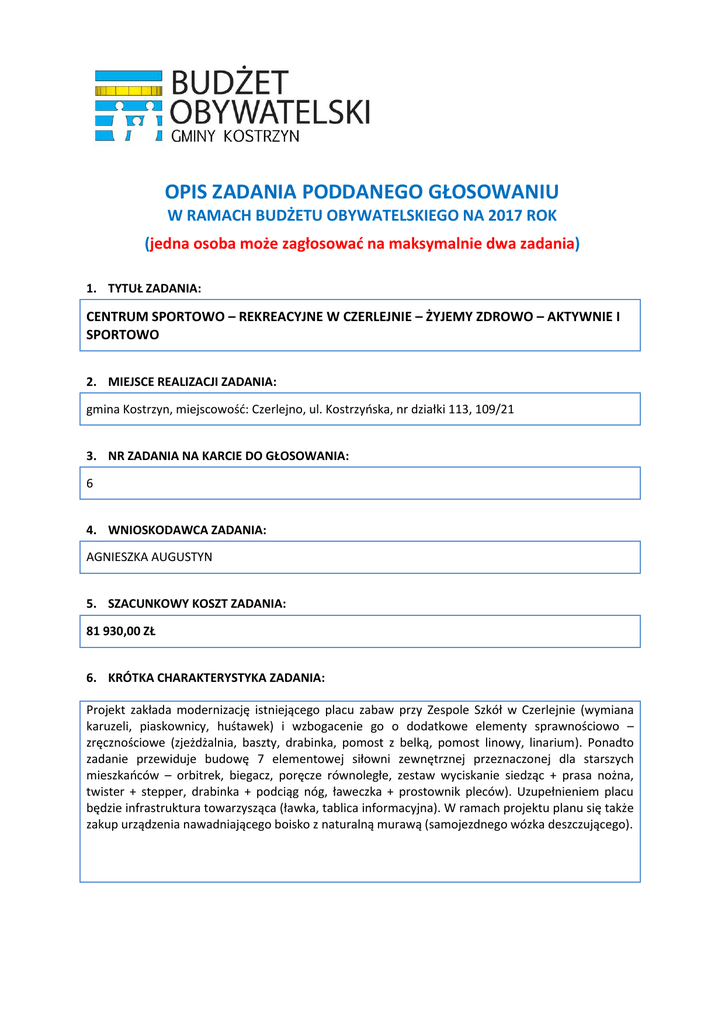 OPIS ZADANIA PODDANEGO GŁOSOWANIU W RAMACH BUDŻETU OBYWATELSKIEGO NA 2017 ROK (jedna osoba może zagłosować na maksymalnie dwa zadania) 1. TYTUŁ ZADANIA: CENTRUM SPORTOWO – REKREACYJNE W CZERLEJNIE – ŻYJEMY ZDROWO – AKTYWNIE I SPORTOWO 2. MIEJSCE REALIZACJI ZADANIA: gmina Kostrzyn, miejscowość: Czerlejno, ul. Kostrzyńska, nr działki 113, 109/21 3. NR ZADANIA NA KARCIE DO GŁOSOWANIA: 6 4. WNIOSKODAWCA ZADANIA: AGNIESZKA AUGUSTYN 5. SZACUNKOWY KOSZT ZADANIA: 81 930,00 ZŁ 6. KRÓTKA CHARAKTERYSTYKA ZADANIA: Projekt zakłada modernizację istniejącego placu zabaw przy Zespole Szkół w Czerlejnie (wymiana karuzeli, piaskownicy, huśtawek) i wzbogacenie go o dodatkowe elementy sprawnościowo – zręcznościowe (zjeżdżalnia, baszty, drabinka, pomost z belką, pomost linowy, linarium). Ponadto zadanie przewiduje budowę 7 elementowej siłowni zewnętrznej przeznaczonej dla starszych mieszkańców – orbitrek, biegacz, poręcze równoległe, zestaw wyciskanie siedząc + prasa nożna, twister + stepper, drabinka + podciąg nóg, ławeczka + prostownik pleców). Uzupełnieniem placu będzie infrastruktura towarzysząca (ławka, tablica informacyjna). W ramach projektu planu się także zakup urządzenia nawadniającego boisko z naturalną murawą (samojezdnego wózka deszczującego).