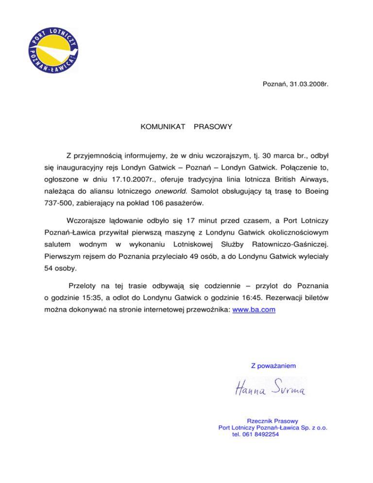 Poznań, 31.03.2008r. KOMUNIKAT PRASOWY Z przyjemnością informujemy, że w dniu wczorajszym, tj. 30 marca br., odbył się inauguracyjny rejs Londyn Gatwick – Poznań – Londyn Gatwick. Połączenie to, ogłoszone w dniu 17.10.2007r., oferuje tradycyjna linia lotnicza British Airways, należąca do aliansu lotniczego oneworld. Samolot obsługujący tą trasę to Boeing 737-500, zabierający na pokład 106 pasażerów. Wczorajsze lądowanie odbyło się 17 minut przed czasem, a Port Lotniczy Poznań-Ławica przywitał pierwszą maszynę z Londynu Gatwick okolicznościowym salutem wodnym w wykonaniu Lotniskowej Służby Ratowniczo-Gaśniczej. Pierwszym rejsem do Poznania przyleciało 49 osób, a do Londynu Gatwick wyleciały 54 osoby. Przeloty na tej trasie odbywają się codziennie – przylot do Poznania o godzinie 15:35, a odlot do Londynu Gatwick o godzinie 16:45. Rezerwacji biletów można dokonywać na stronie internetowej przewoźnika: www.ba.com Z poważaniem Rzecznik Prasowy Port Lotniczy Poznań-Ławica Sp. z o.o. tel. 061 8492254