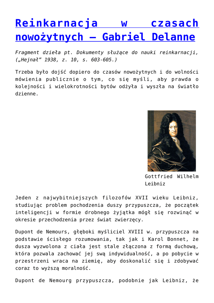 Reinkarnacja w czasach nowożytnych – Gabriel Delanne Fragment dzieła pt. Dokumenty służące do nauki reinkarnacji, („Hejnał” 1938, z. 10, s. 603-605.) Trzeba było dojść dopiero do czasów nowożytnych i do wolności mówienia publicznie o tym, co się myśli, aby prawda o kolejności i wielokrotności bytów odżyła i wyszła na światło dzienne. Gottfried Wilhelm Leibniz Jeden z najwybitniejszych filozofów XVII wieku Leibniz, studiując problem pochodzenia duszy przypuszcza, że początek inteligencji w formie drobnego żyjątka mógł się rozwinąć w okresie przechodzenia przez świat zwierzęcy. Dupont de Nemours, głęboki myśliciel XVIII w. przypuszcza na podstawie ścisłego rozumowania, tak jak i Karol Bonnet, że dusza wyzwolona z ciała jest stale złączona z formą duchową, która pozwala zachować jej swą indywidualność, a po pobycie w przestrzeni wraca na ziemię, aby doskonalić się i zdobywać coraz to wyższą moralność. Dupont de Nemourg przypuszcza, podobnie jak Leibniz, że pierwiastek inteligencji przeszedł przez wszystkie organizmy żyjące, zanim doszedł do człowieka. Leibniz pisze tak: „Co przeszkadza, aby każdy człowiek żył wiele razy na świecie? Czy ta najstarsza hipoteza jest aż tak dziwna?… Dlaczego nie miałbym przejść wszystkich stopni doskonalenia się w świecie, stanowiących dla człowieka czasowe nagrody lub kary?” Podobne myśli wyrażają Ballanche, Schlegel, Saint-Martin, z których każdy na swój sposób zgadza się co do palingenezy z Dupont de Nemours. Dupont de Nemours Pierre Samuel Konstanty Savy, który żył na początku XIX w., nie wierzy w wiekuiste piekło, gdyż kara ta byłaby ślepą, nierozumną zemstą, karałaby bowiem wiecznością mąk [za] błędy życia, które choć byłoby najdłuższe, jest chwilą wobec wieczności. Wierzy w kolejność bytów, gdyż mówi, że nieśmiertelność człowieka polega na stopniowym postępie. [Człowiek] przygotowuje sobie życie, do którego ma przejść poprzez życie, które opuszcza, a ponieważ są dwa światy, jeden materialny a drugi intelektualny, to oba muszą harmonizować z obecnym życiem, gdyż są zawiązkiem przyszłego żywota. Każdy zaś człowiek postępujący naprzód powoduje postęp świata. Filozofowie szkoły spirytualistycznej, tacy jak Piotr Leroux i Fourier, stwierdzali także mnogość egzystencji duszy. Ale Fourier, umysł systematyczny, lecz awanturniczy, wyobraża sobie okresy bytów ludzkich i pozaziemskich w sposób zagmatwany. Według niego byłoby ściśle 810 istnień, podzielonych na pięć o nierównej rozpiętości okresów, obejmujących razem 80000 lat. Esquiros zapewnia, że każdy z nas jest kowalem wykuwającym swe przyszłe byty. Istoty nieoświecone i cofające się, które nie umiały rozwinąć swej duszy, wchodzą w łono kobiety, aby przyoblec się w nowe ciało i rozpocząć nowe ziemskie życie. Reinkarnacja ta jest zasadą prawa równowagi, prowadzącą przez kary lub nagrody, zależnie od postępowania, wszystkie istoty żyjące. Odradzanie się na ziemi ma swoje granice i dusza oczyszczona zamieszkuje następnie w wyższych światach. W swej pięknej książce „Ziemia i niebo” Jan Reynaud wspaniale przedstawia konieczność powtarzania istnień, najpierw tu na Ziemi, potem na innych rozsianych w Kosmosie światach. Choć nie pamiętamy naszych przeszłych egzystencji, zawsze jesteśmy „sobą”, zawsze nosimy w sobie pierwiastki tego, czym będziemy później i ciągle postępujemy naprzód. Przypuszcza on, że w życiu doskonałym odzyskamy całkowitą pamięć naszej minionej przeszłości i będzie to dla nas przepiękny widok, obejmujący całokształt naszego zdobywania wiadomości i dający obraz tylu istnień. Rodzić się zatem, to nie znaczy rozpoczynać od nowa, ale zmieniać tylko kształt. Uczniami jego byli Pelletan i Henryk Martin. Camille Flammarion Jeżeli zgodzimy się na to, w co wierzyli druidzi, że ewolucja wstępująca duszy ma miejsce w nieskończoności Kosmosu, to mnogość zamieszkałych światów staje się logicznym dodatkiem do mnogości egzystencji. I to właśnie wyciągnął na światło dzienne mój znakomity przyjaciel Camille Flammarion w połowie ubiegłego stulecia. Pisze on tak: „Jeżeli świat intelektualny i świat fizyczny tworzą absolutną jedność, a połączona ludzkość gwiezdna tworzy jedną rozwojową serię istot myślących, począwszy od najniższych inteligencji, które dopiero co wyszły z pieluch materii, aż do potęg boskich, które mogą podziwiać Boga w Jego chwale i zrozumieć Jego najwspanialsze dzieła – to wtedy wszystko się wyjaśnia, wszystko [ze sobą] harmonizuje; ziemska ludzkość znajduje swe miejsce na niższym stopniu tej szerokiej hierarchii i jedność (zgodność) planu Boskiego jest ustalona”. W 1857 r. Allan Kardec ogłosił swą „Księgę Duchów”. Podał w niej wszystkie filozoficzne powody, które doprowadziły go do uznania kolejności i mnogości bytów i jego jest właśnie zasługą rozpropagowanie tej wielkiej prawdy w krajach łacińskich. […] Należy też zanotować, że nauka o kolejnych bytach została spopularyzowana w ostatnim stuleciu przez powieściopisarzy, takich jak Balzac, Teofil Gautier, George Sand i Wiktora Hugo.