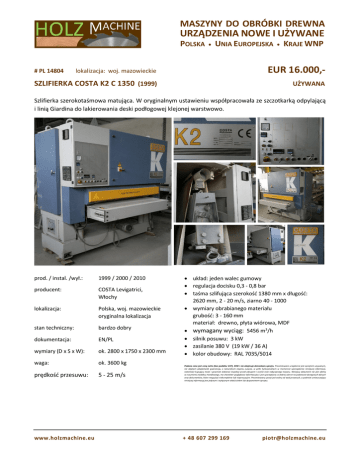 MASZYNY DO OBRÓBKI DREWNA URZĄDZENIA NOWE I UŻYWANE POLSKA  UNIA EUROPEJSKA  KRAJE WNP lokalizacja: woj. mazowieckie EUR 16.000,- SZLIFIERKA COSTA K2 C 1350 (1999) UŻYWANA # PL 14804 Szlifierka szerokotaśmowa matująca. W oryginalnym ustawieniu współpracowała ze szczotkarką odpylającą i linią Giardina do lakierowania deski podłogowej klejonej warstwowo. prod. / instal. /wył.: 1999 / 2000 / 2010 producent: COSTA Levigatrici, Włochy lokalizacja: Polska, woj. mazowieckie oryginalna lokalizacja stan techniczny: bardzo dobry dokumentacja: EN/PL wymiary (D x S x W): ok. 2800 x 1750 x 2300 mm waga: ok. 3600 kg prędkość przesuwu: 5 - 25 m/s www.holzmachine.eu  układ: jeden walec gumowy  regulacja docisku 0,3 - 0,8 bar  taśma szlifująca szerokość 1380 mm x długość: 2620 mm, 2 - 20 m/s, ziarno 40 - 1000  wymiary obrabianego materiału grubość: 3 - 160 mm materiał: drewno, płyta wiórowa, MDF  wymagany wyciąg: 5456 m3/h  silnik posuwu: 3 kW  zasilanie 380 V (19 kW / 36 A)  kolor obudowy: RAL 7035/5014 Podana cena jest ceną netto (bez podatku VAT), EXW i nie obejmuje demontażu sprzętu. Prezentowane urządzenie jest sprzętem używanym, nie objętym jakąkolwiek gwarancją, o naturalnym stopniu zużycia, w pełni funkcjonalnym w momencie sporządzenia niniejszej informacji, natomiast kupujący może i powinien dokonać inspekcji przed zakupem i ocenić stan nabywanego towaru. Niniejszy dokument nie jest ofertą w rozumieniu Kodeksu Handlowego, ma charakter poglądowo-informacyjny i jest sporządzony w dobrej wierze na podstawie dostępnych danych oraz dokumentów, które mogą być niekompletne lub nieprecyzyjne. Prezentowany sprzęt jest wolny od wad prawnych, a podmiot umieszczający niniejszą informację jest jedynym i wyłącznym właścicielem lub dysponentem sprzętu. + 48 607 299 169 [email protected]