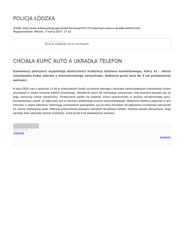 POLICJA ŁÓDZKA Źródło: http://www.lodzka.policja.gov.pl/ld/informacje/4127,Chciala-kupic-auto-a-ukradla-telefon.html Wygenerowano: Wtorek, 7 marca 2017, 17:31 Strona znajduje się w archiwum. CHCIAŁA KUPIĆ AUTO A UKRADŁA TELEFON Kutnowscy policjanci wyjaśniają okoliczności kradzieży telefonu komórkowego, który 41 – letnia mieszkanka Łodzi zabrała z niezamkniętego samochodu. Kobiecie grozi kara do 5 lat pozbawienia wolności. 6 lipca 2016 roku o godzinie 11.40 w miejscowości Dudki na terenie jednego z komisów samochodowych mieszkaniec Kutna pozostawił w swoim nissanie telefon komórkowy. Wszedł do biura nie zamykając samochodu. Gdy powrócił okazało się, że jego samsung został skradziony. Podejrzenie padło na kobietę, która spacerowała w okolicy okradzionego auta. Poszkodowany ustalił, że odjechała ona w kierunku pobliskiego komisu samochodowego. Właściciel telefonu pojechał w tym kierunku o całym zdarzeniu informując kutnowskich policjantów. Już po kilku minutach od zgłoszenia mundurowi zatrzymali 41- letnią mieszkankę Łodzi. Podczas przeszukania policjanci odnaleźli skradziony telefon. Kobieta została zatrzymana. Tego samego dnia usłyszała zarzuty kradzieży. Grozi jej do 5 lat pozbawienia wolności. Ocena: 0/5 (0) Tweetnij kradzież