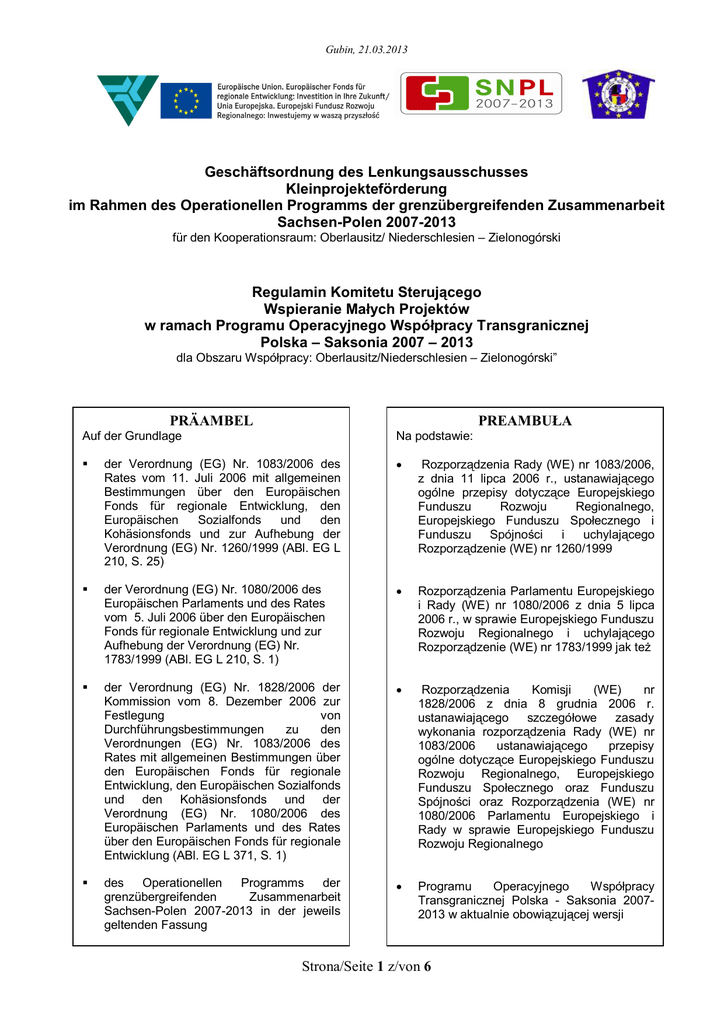 Gubin, 21.03.2013 Geschäftsordnung des Lenkungsausschusses Kleinprojekteförderung im Rahmen des Operationellen Programms der grenzübergreifenden Zusammenarbeit Sachsen-Polen 2007-2013 für den Kooperationsraum: Oberlausitz/ Niederschlesien – Zielonogórski Regulamin Komitetu Sterującego Wspieranie Małych Projektów w ramach Programu Operacyjnego Współpracy Transgranicznej Polska – Saksonia 2007 – 2013 dla Obszaru Współpracy: Oberlausitz/Niederschlesien – Zielonogórski” PRÄAMBEL PREAMBUŁA Auf der Grundlage Na podstawie: der Verordnung (EG) Nr. 1083/2006 des Rates vom 11. Juli 2006 mit allgemeinen Bestimmungen über den Europäischen Fonds für regionale Entwicklung, den Europäischen Sozialfonds und den Kohäsionsfonds und zur Aufhebung der Verordnung (EG) Nr. 1260/1999 (ABl. EG L 210, S. 25) Rozporządzenia Rady (WE) nr 1083/2006, z dnia 11 lipca 2006 r., ustanawiającego ogólne przepisy dotyczące Europejskiego Funduszu Rozwoju Regionalnego, Europejskiego Funduszu Społecznego i Funduszu Spójności i uchylającego Rozporządzenie (WE) nr 1260/1999 der Verordnung (EG) Nr. 1080/2006 des Europäischen Parlaments und des Rates vom 5. Juli 2006 über den Europäischen Fonds für regionale Entwicklung und zur Aufhebung der Verordnung (EG) Nr. 1783/1999 (ABl. EG L 210, S. 1) Rozporządzenia Parlamentu Europejskiego i Rady (WE) nr 1080/2006 z dnia 5 lipca 2006 r., w sprawie Europejskiego Funduszu Rozwoju Regionalnego i uchylającego Rozporządzenie (WE) nr 1783/1999 jak też der Verordnung (EG) Nr. 1828/2006 der Kommission vom 8. Dezember 2006 zur Festlegung von Durchführungsbestimmungen zu den Verordnungen (EG) Nr. 1083/2006 des Rates mit allgemeinen Bestimmungen über den Europäischen Fonds für regionale Entwicklung, den Europäischen Sozialfonds und den Kohäsionsfonds und der Verordnung (EG) Nr. 1080/2006 des Europäischen Parlaments und des Rates über den Europäischen Fonds für regionale Entwicklung (ABl. EG L 371, S. 1) Rozporządzenia Komisji (WE) nr 1828/2006 z dnia 8 grudnia 2006 r. ustanawiającego szczegółowe zasady wykonania rozporządzenia Rady (WE) nr 1083/2006 ustanawiającego przepisy ogólne dotyczące Europejskiego Funduszu Rozwoju Regionalnego, Europejskiego Funduszu Społecznego oraz Funduszu Spójności oraz Rozporządzenia (WE) nr 1080/2006 Parlamentu Europejskiego i Rady w sprawie Europejskiego Funduszu Rozwoju Regionalnego des Operationellen Programms der grenzübergreifenden Zusammenarbeit Sachsen-Polen 2007-2013 in der jeweils geltenden Fassung Programu Operacyjnego Współpracy Transgranicznej Polska - Saksonia 20072013 w aktualnie obowiązującej wersji Strona/Seite 1 z/von 6 Gubin, 21.03.2013 des Gemeinsamen Umsetzungsdokumentes zum Operationellen Programm der grenzübergreifenden Zusammenarbeit Sachsen - Polen 2007 - 2013 in der jeweils geltenden Fassung des Gemeinsamen Umsetzungsdokumentes für den Kleinprojektefonds im Rahmen des Operationellen Programms der grenzübergreifenden Zusammenarbeit Sachsen - Polen 2007 - 2013 in der jeweils geltenden Fassung wird für die Realisierung der Kleinprojekteförderung im Kooperationsraum im o. g. Projekt ein Lenkungsausschuss (LaK) arbeiten. Wspólne Uszczegółowienia Programu Operacyjnego Współpracy Transgranicznej Polska – Saksonia 2007-2013 w aktualnie obowiązującej wersji Wspólny Dokument Wdrożeniowy dla Funduszu Małych Projektów w ramach programu Operacyjnego Współpracy Transgranicznej Polska-Saksonia 20072013 w aktualnie obowiązującej wersji pracował będzie Komitet Sterujący przy realizacji Wsparcia Małych Projektów w obszarze współpracy. Artikel 1 Artykuł 1 Zweck / Zuständigkeitsbereich Cel / Zakres kompetencji 1) Diese Geschäftsordnung (GO) regelt die Arbeit des LaK als verantwortliches Gremium für die Projektauswahl im Rahmen o. g. Kleinprojektefonds. 1. Niniejszy Regulamin reguluje pracę KS jako gremium odpowiedzialnego za wybór projektów w ramach w/w Funduszu Małych Projektów. Artikel 2 Artykuł 2 Vorsitz und Mitglieder Przewodnictwo i Członkowie (1) Für die Zusammensetzung des LaK gelten die Partnerschaftsprinzipien gemäß Artikel 11 der Verordnung (EG) Nr. 1083/2006. (1) Przy składzie KS znaczenie mają zasady partnerstwa zgodnie z artykułem 11 rozporządzenia (WE) nr 1083/2006. (2) Der LaK hat stimmberechtigte Mitglieder von polnischer und deutscher Seite. (2) W skład KS wchodzą członkowie z prawem głosu ze strony polskiej i niemieckiej. a) stimmberechtigte Mitglieder polnischerseits sind: - zwei Personen aus dem Fördergebiet auf polnischer Seite, die durch die Euroregion SNB delegiert werden - die Direktorin der polnischen Seite der Euroregion SNB als geborenes Mitglied a) Członkami z prawem głosu ze strony polskiej są: - dwie osoby z obszaru wsparcia po polskiej stronie, delegowane przez Euroregion SNB - dyrektor polskiej strony Euroregionu SNB jako członek z urzędu b) stimmberechtigte Mitglieder deutscherseits sind: - zwei Personen aus dem Fördergebiet auf deutscher Seite, die durch die Euroregion Neisse e. V. delegiert werden - der Geschäftsführer der Euroregion Neisse e. V. als geborenes Mitglied b) Członkami z prawem głosu ze strony niemieckiej są: - dwie osoby z obszaru wsparcia po niemieckiej stronie, delegowane przez Euroregion Neisse e.V. - kierownik Euroregionu Neisse e.V. jako członek z urzędu. Strona/Seite 2 z/von 6 Gubin, 21.03.2013 (3) An den Sitzungen können Vertreter der Verwaltungsbehörde und Prüfbehörden (Artikel 16-Prüfer), der Leiter des Verbindungsbüros Breslau des Freistaates Sachsen, Vertreter der Landesdirektion Sachsen und der Nationale Programmkoordinator als beobachtendes Mitglied teilnehmen. (4) Vorsitz und Co- Vorsitz haben die Direktorin der polnischen Seite der Euroregion SNB bzw. der Geschäftsführer der Euroregion Neisse e. V abhängig vom Durchführungsort des Ausschusses. Bei Verhinderung der/ des Vorsitzenden übernimmt ein stimmberechtigtes Mitglieder der gastgebenden Seite den Vor