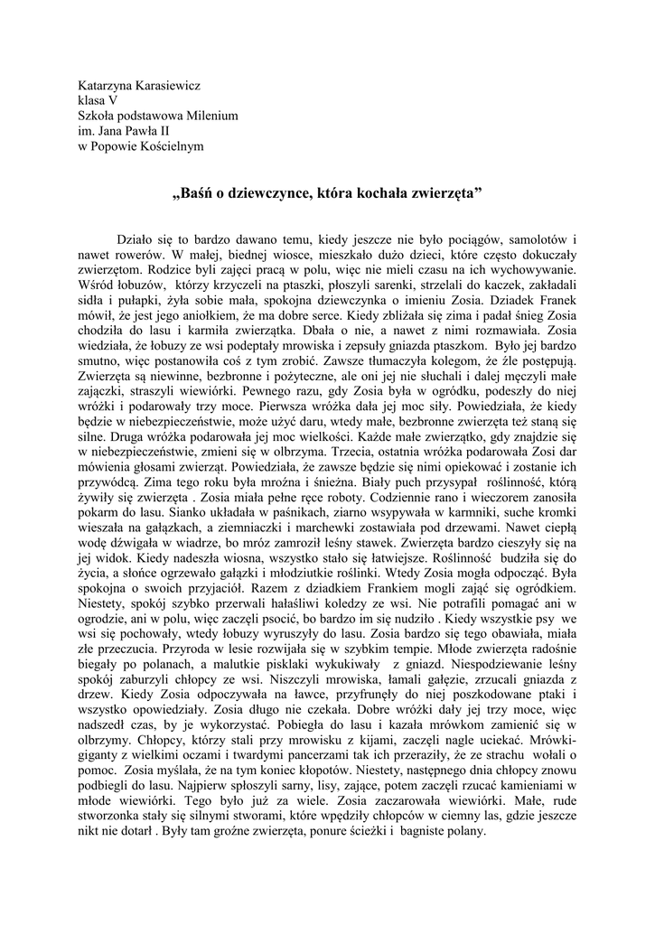 Katarzyna Karasiewicz klasa V Szkoła podstawowa Milenium im. Jana Pawła II w Popowie Kościelnym „Baśń o dziewczynce, która kochała zwierzęta” Działo się to bardzo dawano temu, kiedy jeszcze nie było pociągów, samolotów i nawet rowerów. W małej, biednej wiosce, mieszkało dużo dzieci, które często dokuczały zwierzętom. Rodzice byli zajęci pracą w polu, więc nie mieli czasu na ich wychowywanie. Wśród łobuzów, którzy krzyczeli na ptaszki, płoszyli sarenki, strzelali do kaczek, zakładali sidła i pułapki, żyła sobie mała, spokojna dziewczynka o imieniu Zosia. Dziadek Franek mówił, że jest jego aniołkiem, że ma dobre serce. Kiedy zbliżała się zima i padał śnieg Zosia chodziła do lasu i karmiła zwierzątka. Dbała o nie, a nawet z nimi rozmawiała. Zosia wiedziała, że łobuzy ze wsi podeptały mrowiska i zepsuły gniazda ptaszkom. Było jej bardzo smutno, więc postanowiła coś z tym zrobić. Zawsze tłumaczyła kolegom, że źle postępują. Zwierzęta są niewinne, bezbronne i pożyteczne, ale oni jej nie słuchali i dalej męczyli małe zajączki, straszyli wiewiórki. Pewnego razu, gdy Zosia była w ogródku, podeszły do niej wróżki i podarowały trzy moce. Pierwsza wróżka dała jej moc siły. Powiedziała, że kiedy będzie w niebezpieczeństwie, może użyć daru, wtedy małe, bezbronne zwierzęta też staną się silne. Druga wróżka podarowała jej moc wielkości. Każde małe zwierzątko, gdy znajdzie się w niebezpieczeństwie, zmieni się w olbrzyma. Trzecia, ostatnia wróżka podarowała Zosi dar mówienia głosami zwierząt. Powiedziała, że zawsze będzie się nimi opiekować i zostanie ich przywódcą. Zima tego roku była mroźna i śnieżna. Biały puch przysypał roślinność, którą żywiły się zwierzęta . Zosia miała pełne ręce roboty. Codziennie rano i wieczorem zanosiła pokarm do lasu. Sianko układała w paśnikach, ziarno wsypywała w karmniki, suche kromki wieszała na gałązkach, a ziemniaczki i marchewki zostawiała pod drzewami. Nawet ciepłą wodę dźwigała w wiadrze, bo mróz zamroził leśny stawek. Zwierzęta bardzo cieszyły się na jej widok. Kiedy nadeszła wiosna, wszystko stało się łatwiejsze. Roślinność budziła się do życia, a słońce ogrzewało gałązki i młodziutkie roślinki. Wtedy Zosia mogła odpocząć. Była spokojna o swoich przyjaciół. Razem z dziadkiem Frankiem mogli zająć się ogródkiem. Niestety, spokój szybko przerwali hałaśliwi koledzy ze wsi. Nie potrafili pomagać ani w ogrodzie, ani w polu, więc zaczęli psocić, bo bardzo im się nudziło . Kiedy wszystkie psy we wsi się pochowały, wtedy łobuzy wyruszyły do lasu. Zosia bardzo się tego obawiała, miała złe przeczucia. Przyroda w lesie rozwijała się w szybkim tempie. Młode zwierzęta radośnie biegały po polanach, a malutkie pisklaki wykukiwały z gniazd. Niespodziewanie leśny spokój zaburzyli chłopcy ze wsi. Niszczyli mrowiska, łamali gałęzie, zrzucali gniazda z drzew. Kiedy Zosia odpoczywała na ławce, przyfrunęły do niej poszkodowane ptaki i wszystko opowiedziały. Zosia długo nie czekała. Dobre wróżki dały jej trzy moce, więc nadszedł czas, by je wykorzystać. Pobiegła do lasu i kazała mrówkom zamienić się w olbrzymy. Chłopcy, którzy stali przy mrowisku z kijami, zaczęli nagle uciekać. Mrówkigiganty z wielkimi oczami i twardymi pancerzami tak ich przeraziły, że ze strachu wołali o pomoc. Zosia myślała, że na tym koniec kłopotów. Niestety, następnego dnia chłopcy znowu podbiegli do lasu. Najpierw spłoszyli sarny, lisy, zające, potem zaczęli rzucać kamieniami w młode wiewiórki. Tego było już za wiele. Zosia zaczarowała wiewiórki. Małe, rude stworzonka stały się silnymi stworami, które wpędziły chłopców w ciemny las, gdzie jeszcze nikt nie dotarł . Były tam groźne zwierzęta, ponure ścieżki i bagniste polany. Zosia z przyjaciółmi zgodnie stwierdzili, że to dla łobuzów dobra nauczka. Długo będą szukać drogi powrotnej i pamiętać, ile zła wyrządzili.