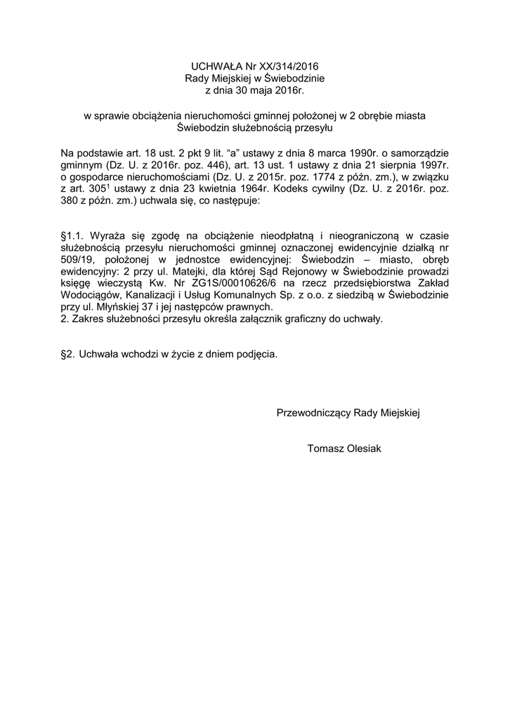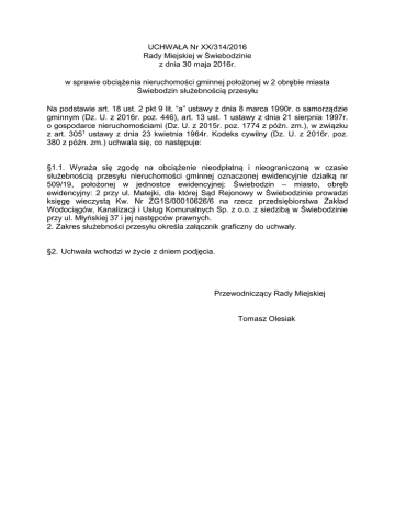 UCHWAŁA Nr XX/314/2016 Rady Miejskiej w Świebodzinie z dnia 30 maja 2016r. w sprawie obciążenia nieruchomości gminnej położonej w 2 obrębie miasta Świebodzin służebnością przesyłu Na podstawie art. 18 ust. 2 pkt 9 lit. “a” ustawy z dnia 8 marca 1990r. o samorządzie gminnym (Dz. U. z 2016r. poz. 446), art. 13 ust. 1 ustawy z dnia 21 sierpnia 1997r. o gospodarce nieruchomościami (Dz. U. z 2015r. poz. 1774 z późn. zm.), w związku z art. 3051 ustawy z dnia 23 kwietnia 1964r. Kodeks cywilny (Dz. U. z 2016r. poz. 380 z późn. zm.) uchwala się, co następuje: §1.1. Wyraża się zgodę na obciążenie nieodpłatną i nieograniczoną w czasie służebnością przesyłu nieruchomości gminnej oznaczonej ewidencyjnie działką nr 509/19, położonej w jednostce ewidencyjnej: Świebodzin – miasto, obręb ewidencyjny: 2 przy ul. Matejki, dla której Sąd Rejonowy w Świebodzinie prowadzi księgę wieczystą Kw. Nr ZG1S/00010626/6 na rzecz przedsiębiorstwa Zakład Wodociągów, Kanalizacji i Usług Komunalnych Sp. z o.o. z siedzibą w Świebodzinie przy ul. Młyńskiej 37 i jej następców prawnych. 2. Zakres służebności przesyłu określa załącznik graficzny do uchwały. §2. Uchwała wchodzi w życie z dniem podjęcia. Przewodniczący Rady Miejskiej Tomasz Olesiak UZASADNIENIE DO PROJEKTU UCHWAŁY RADY MIEJSKIEJ W ŚWIEBODZINIE Nieruchomość gminna oznaczona ewidencyjnie działką nr 509/19 położona w 2 obrębie miasta Świebodzin przy ul. Matejki jest przeznaczona do zbycia w drodze ustnego przetargu nieograniczonego. Na nieruchomości tej znajduje się sieć wodociągowa ø100 i ø250, której właścicielem jest Zakład Wodociągów, Kanalizacji i Usług Komunalnych Sp. z o.o. w Świebodzinie. Celem uregulowanie stanu prawnego w zakresie dostępu do ww. sieci wodociągowej, właściwym będzie ustanowienie na rzecz przedsiębiorstwa nieodpłatnej i nieograniczonej w czasie służebności przesyłu, z chwilą zbycia przedmiotowej nieruchomości gminnej.