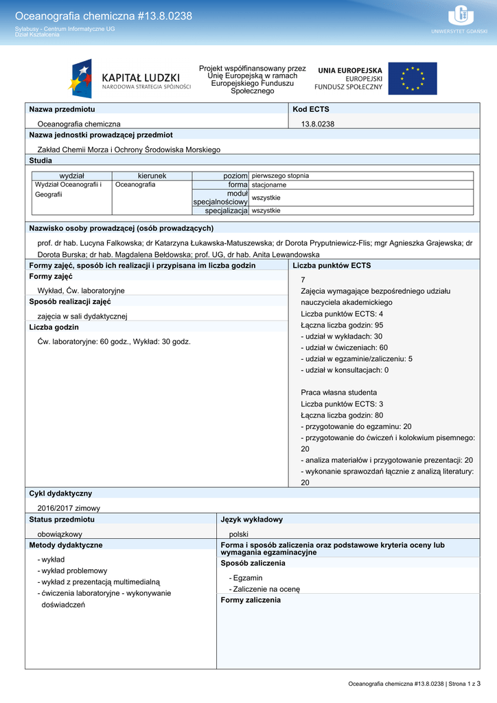 Oceanografia chemiczna #13.8.0238 Sylabusy - Centrum Informatyczne UG Dział Kształcenia Projekt współfinansowany przez Unię Europejską w ramach Europejskiego Funduszu Społecznego Nazwa przedmiotu Kod ECTS Oceanografia chemiczna Nazwa jednostki prowadzącej przedmiot 13.8.0238 Zakład Chemii Morza i Ochrony Środowiska Morskiego Studia wydział Wydział Oceanografii i Geografii kierunek Oceanografia poziom forma moduł specjalnościowy specjalizacja pierwszego stopnia stacjonarne wszystkie wszystkie Nazwisko osoby prowadzącej (osób prowadzących) prof. dr hab. Lucyna Falkowska; dr Katarzyna Łukawska-Matuszewska; dr Dorota Pryputniewicz-Flis; mgr Agnieszka Grajewska; dr Dorota Burska; dr hab. Magdalena Bełdowska; prof. UG, dr hab. Anita Lewandowska Formy zajęć, sposób ich realizacji i przypisana im liczba godzin Liczba punktów ECTS Formy zajęć 7 Wykład, Ćw. laboratoryjne Sposób realizacji zajęć Zajęcia wymagające bezpośredniego udziału nauczyciela akademickiego Liczba punktów ECTS: 4 Łączna liczba godzin: 95 - udział w wykładach: 30 - udział w ćwiczeniach: 60 - udział w egzaminie/zaliczeniu: 5 - udział w konsultacjach: 0 zajęcia w sali dydaktycznej Liczba godzin Ćw. laboratoryjne: 60 godz., Wykład: 30 godz. Praca własna studenta Liczba punktów ECTS: 3 Łączna liczba godzin: 80 - przygotowanie do egzaminu: 20 - przygotowanie do ćwiczeń i kolokwium pisemnego: 20 - analiza materiałów i przygotowanie prezentacji: 20 - wykonanie sprawozdań łącznie z analizą literatury: 20 Cykl dydaktyczny 2016/2017 zimowy Status przedmiotu obowiązkowy Metody dydaktyczne - wykład - wykład problemowy - wykład z prezentacją multimedialną - ćwiczenia laboratoryjne - wykonywanie doświadczeń Język wykładowy polski Forma i sposób zaliczenia oraz podstawowe kryteria oceny lub wymagania egzaminacyjne Sposób zaliczenia - Egzamin - Zaliczenie na ocenę Formy zaliczenia Oceanografia chemiczna #13.8.0238 | Strona 1 z 3 Oceanografia chemiczna #13.8.0238 Sylabusy - Centrum Informatyczne UG Dział Kształcenia Wykład: - egzamin pisemny z pytaniami (zadaniami) otwartymi; - egzamin pisemny (dłuższa wypowiedź pisemna/ rozwiązanie problemu); - egzamin ustny. Ćwiczenia: - ocena zaliczeniowa na podstawie średniej ważonej z ocen cząstkowych otrzymywanych w trakcie trwania zajęć (sprawdziany bieżące, sprawozdania, prezentacja, ocena ciągła, kolokwium). Podstawowe kryteria oceny Wykład - Uzyskanie minimum 51% liczy punktów z egzaminu zgodnie z Regulaminem Studiów UG Ćwiczenia - Teoretyczne przygotowanie do ćwiczeń, umiejętność wykonania doświadczeń wchodzących w zakres ćwiczeń i krytyczna ocena uzyskanych wyników, porównanie literaturowe, umiejętność prezentacji ustnej i graficznej uzyskanych wyników. - Średnia ważona z ocen cząstkowych otrzymywanych w trakcie trwania zajęć (sprawdzian, ocena ciągła, sprawozdanie, kolokwium) Sposób weryfikacji założonych efektów kształcenia Określenie przedmiotów wprowadzających wraz z wymogami wstępnymi A. Wymagania formalne chemia ogólna B. Wymagania wstępne umiejętność posługiwania się pakietem programów MS Office w zakresie podstawowym, znajomość języka angielskiego na poziomie średnim Cele kształcenia Poznanie i zrozumienie procesów chemicznych zachodzących w oceanie na tle globalnej cyrkulacji mas wodnych, a także wymiany masy i energii między oceanem i atmosferą oraz między osadami morskimi a wodą naddenną, czy lądem a strefą przybrzeżną. Przedstawienie wzajemnych zależności między fizycznymi, biologicznymi i chemicznymi procesami w morzu. Treści programowe A. Problematyka wykładu A.1 Skład chemiczny wody morskiej – zasolenie – właściwości decydujące o procesach fizycznych, biologicznych i chemicznych. A.2 Migracje pierwiastków i związków chemicznych, podział pierwiastków w wodzie morskiej, równowagi jonowe. A.3 Podział wód oceanicznych determinowany chemizmem i stratyfikacją gęstościową uwzględniający oświetlenie (warstwa eufo-tyczna i afotyczna), odległość od lądu (estuaria, zatoki, wody otwarte), zasolenie (wody słonawe i słone). A.4 Gazy w wodzie morskiej (tlen, azot, ditlenek węgla, amoniak, tlenki azotu, gazowe związki siarki). Procesy rozpuszczalności, dyfuzji w wodzie morskiej i na granicy rozdziału woda-powietrze. Fizyczne i chemiczne aspekty wzajemnego oddziaływania morza i atmosfery. Regionalna i sezonowa zmienność strumieni emisji i imisji substancji chemicznych. A.5 Cykle biogeochemiczne tlenu, węgla, azotu, fosforu, krzemu oraz wybranych metali np. Fe, Hg (formy występowania i procesy zachodzące w atmosferze, biosferze, wodzie morskiej, osadach). Wpływ warunków tlenowych na przebieg cykli. Zmiany w krążeniu pierwiastków w morzu wywołane działalnością człowieka. A.6 Materia organiczna (rozpuszczona, zawieszona i lotna) – skład chemiczny, powstawanie, utlenianie - znaczenie procesów asy-milacji i destrukcji w cyklach sezonowych i dobowych zachodzących przy współudziale mikroorganizmów. Równowaga węglanowa, zasadowość wody morskiej, pH wody morskiej. A.7 Najważniejsze problemy środowiskowe w Bałtyku: eutrofizacja; zanieczyszczenie; wymiana wód z Morzem Północnym; straty-fikacja termiczno zasileniowa warunkująca pionową wymianę i dyfuzję pierwiastków i związków chemicznych. B. Problematyka ćwiczeń B.1 Metod spektrofotometryczne w analizie substancji chemicznych (prawo Lamberta Beera, metody kalibracji, kalibracja punk-towa, liniowa) B.2 Wykonanie kalibracji w oparciu o wzorce chemiczne i oznaczanie substancji biogenicznych w próbkach wody morskiej w strefie brzegowej Zatoki Gdańskiej (pobieranie próbek, analiza chemiczna, metody matematyczne, analiza błędu) B.3 Opracowanie uzyskanych wyników analiz z zastosowaniem metod statystycznych i graficznych oraz interpretacją uzyskanych wyników środowiskowych (źródła: raportów rejsowych, modelu hydrodynamicznego, ra