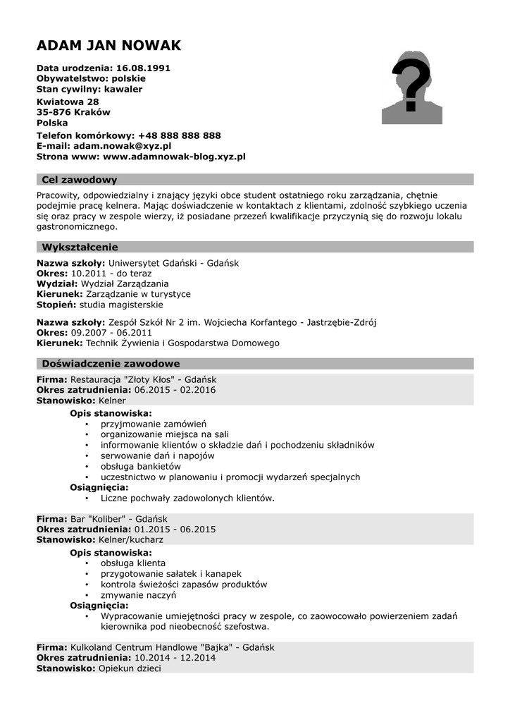 ADAM JAN NOWAK Data urodzenia: 16.08.1991 Obywatelstwo: polskie Stan cywilny: kawaler Kwiatowa 28 35-876 Kraków Polska Telefon komórkowy: +48 888 888 888 E-mail: [email protected] Strona www: www.adamnowak-blog.xyz.pl Cel zawodowy Pracowity, odpowiedzialny i znający języki obce student ostatniego roku zarządzania, chętnie podejmie pracę kelnera. Mając doświadczenie w kontaktach z klientami, zdolność szybkiego uczenia się oraz pracy w zespole wierzy, iż posiadane przezeń kwalifikacje przyczynią się do rozwoju lokalu gastronomicznego. Wykształcenie Nazwa szkoły: Uniwersytet Gdański - Gdańsk Okres: 10.2011 - do teraz Wydział: Wydział Zarządzania Kierunek: Zarządzanie w turystyce Stopień: studia magisterskie Nazwa szkoły: Zespół Szkół Nr 2 im. Wojciecha Korfantego - Jastrzębie-Zdrój Okres: 09.2007 - 06.2011 Kierunek: Technik Żywienia i Gospodarstwa Domowego Doświadczenie zawodowe Firma: Restauracja "Złoty Kłos" - Gdańsk Okres zatrudnienia: 06.2015 - 02.2016 Stanowisko: Kelner Opis stanowiska: • przyjmowanie zamówień • organizowanie miejsca na sali • informowanie klientów o składzie dań i pochodzeniu składników • serwowanie dań i napojów • obsługa bankietów • uczestnictwo w planowaniu i promocji wydarzeń specjalnych Osiągnięcia: • Liczne pochwały zadowolonych klientów. Firma: Bar "Koliber" - Gdańsk Okres zatrudnienia: 01.2015 - 06.2015 Stanowisko: Kelner/kucharz Opis stanowiska: • obsługa klienta • przygotowanie sałatek i kanapek • kontrola świeżości zapasów produktów • zmywanie naczyń Osiągnięcia: • Wypracowanie umiejętności pracy w zespole, co zaowocowało powierzeniem zadań kierownika pod nieobecność szefostwa. Firma: Kulkoland Centrum Handlowe "Bajka" - Gdańsk Okres zatrudnienia: 10.2014 - 12.2014 Stanowisko: Opiekun dzieci Opis stanowiska: • opieka nad dziećmi klientów centrum handlowego • przygotowywanie grafika gier i zabaw • współpraca z rodzicami • dbanie o czystość i bezpieczeństwo sprzętu na placu zabaw Osiągnięcia: • Liczne pochwały od rodziców dzieci oraz - dzięki odpowiedzialnemu wykonywaniu pracy - wypracowanie umiejętności pozyskiwania zaufania klientów. Szkolenia 03.2015 - Kurs barmański I-go stopnia. Bacardi-Martini Sp. z o. o. Certyfikaty i uprawnienia 01.2012 - Prawo jazdy kat. B 12.2014 - Książeczka sanitarno - epidemiologiczna Umiejętności Społeczne: nienaganna prezencja (3), umiejętność rozwiązywania problemów (3), łatwość w nawiązywaniu kontaktów (3) Techniczne: obsługa pakietu MS Office (4), obsługa kasy fiskalnej (4) Inne: umiejętności barmańskie (3), umiejętności kucharskie (1) (*) poziom umiejętności: 1 - początkujący, 2 - średniozaawansowany, 3 - zaawansowany, 4 - biegły Informacje dodatkowe Języki: angielski - średniozaawansowany niemiecki - początkujący Hobby: podróże, gastronomia, kuchnia fusion, sporty zespołowe Wyrażam zgodę na przetwarzanie moich danych osobowych dla potrzeb procesu rekrutacji zgodnie z ustawą z dnia 29.08.1997r. Dz. U. z 2002 r., Nr 101, poz. 926 ze zm.