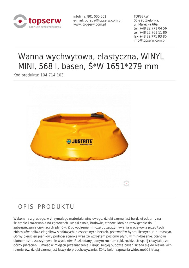 infolinia: 801 000 501 e-mail: [email protected] www: topserw.com.pl TOPSERW 05-220 Zielonka, ul. Marecka 66a tel. +48 22 771 04 56 tel. +48 22 761 11 80 fax +48 22 771 93 80 [email protected] Wanna wychwytowa, elastyczna, WINYL MINI, 568 l, basen, Ś*W 1651*279 mm Kod produktu: 104.714.103 OPIS PRODUKTU Wykonany z grubego, wytrzymałego materiału winylowego, dzięki czemu jest bardziej odporny na ścieranie i rozerwanie na zgrzewach. Dzięki swojej budowie, stanowi idealne rozwiązanie do zabezpieczania cieknących płynów. Z powodzeniem może do zatrzymywania wycieków z przebitych zbiorników paliwa ciągników siodłowych, nieszczelnych beczek, przewodów hydraulicznych, rur i maszyn. Górny pierścień piankowy podnosi ściankę wraz ze wzrostem poziomu płynu w mini-basenie. Stanowi ekonomiczne zatrzymywanie wycieków. Rozkładany jednym ruchem ręki, rozłóż, strząśnij chwytając za górny pierścień i umieść w miejscu przeznaczenia. Dzięki swojej budowie basen składa się do niewielkich rozmiarów, dzięki czemu jest łatwy do przechowywania. Żółty kolor zapewnia widoczność i łatwą identyfikację. Wymiary po rozłożeniu (wewnętrzne) Ś*W 1651*279 mm, wymiary po (złożeniu) S*D*W 610*610*127 mm, pojemność wychwytowa 568 l, waga 6,4 kg, kolor żółty. DANE TECHNICZNE Wymiary D*S*W 1651*279 mm Pojemność wychwytowa 568 l Waga 6,4 kg Kolor Żółty Materiał Winyl POWIĄZANE Produkt Wanna wychwytowa, elastyczna, WINYL MINI, 76 l, basen, Ś*W 711*279 mm Wanna wychwytowa, elastyczna, WINYL MINI, 250 l, basen, Ś*W 1295*279 mm Wanna wychwytowa, elastyczna, WINYL MINI, 379 l, basen, Ś*W 1372*279 mm Wanna wychwytowa, elastyczna, WINYL MINI, 568 l, basen, Ś*W 1651*279 mm