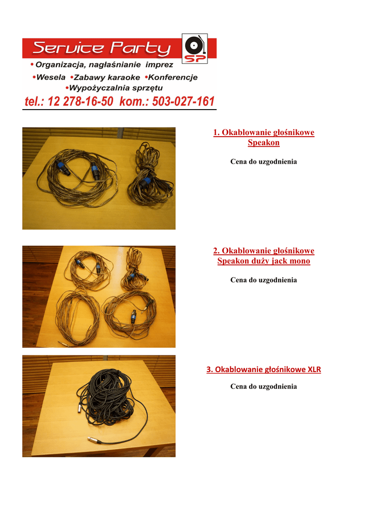 1. Okablowanie głośnikowe Speakon Cena do uzgodnienia 2. Okablowanie głośnikowe Speakon duży jack mono Cena do uzgodnienia 3. Okablowanie głośnikowe XLR Cena do uzgodnienia 4. Listwy zasilające przejściówki Cena do uzgodnienia 5. Okablowanie SVGA Cena do uzgodnienia 6. Okablowanie Sygnałowe Cena do uzgodnienia
