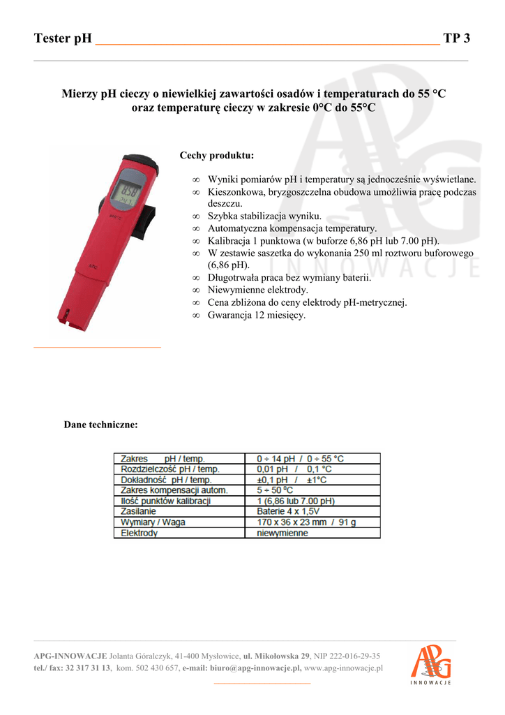 Tester pH __________________________________________________________ TP 3 ________________________________________________________________ Mierzy pH cieczy o niewielkiej zawartości osadów i temperaturach do 55 °C oraz temperaturę cieczy w zakresie 0°C do 55°C Cechy produktu: • • • • • • • • • • Wyniki pomiarów pH i temperatury są jednocześnie wyświetlane. Kieszonkowa, bryzgoszczelna obudowa umożliwia pracę podczas deszczu. Szybka stabilizacja wyniku. Automatyczna kompensacja temperatury. Kalibracja 1 punktowa (w buforze 6,86 pH lub 7.00 pH). W zestawie saszetka do wykonania 250 ml roztworu buforowego (6,86 pH). Długotrwała praca bez wymiany baterii. Niewymienne elektrody. Cena zbliżona do ceny elektrody pH-metrycznej. Gwarancja 12 miesięcy. _________________________ Dane techniczne: ___________________________________________________________________________________ APG-INNOWACJE Jolanta Góralczyk, 41-400 Mysłowice, ul. Mikołowska 29, NIP 222-016-29-35 tel./ fax: 32 317 31 13, kom. 502 430 657, e-mail: [email protected], www.apg-innowacje.pl ___________________