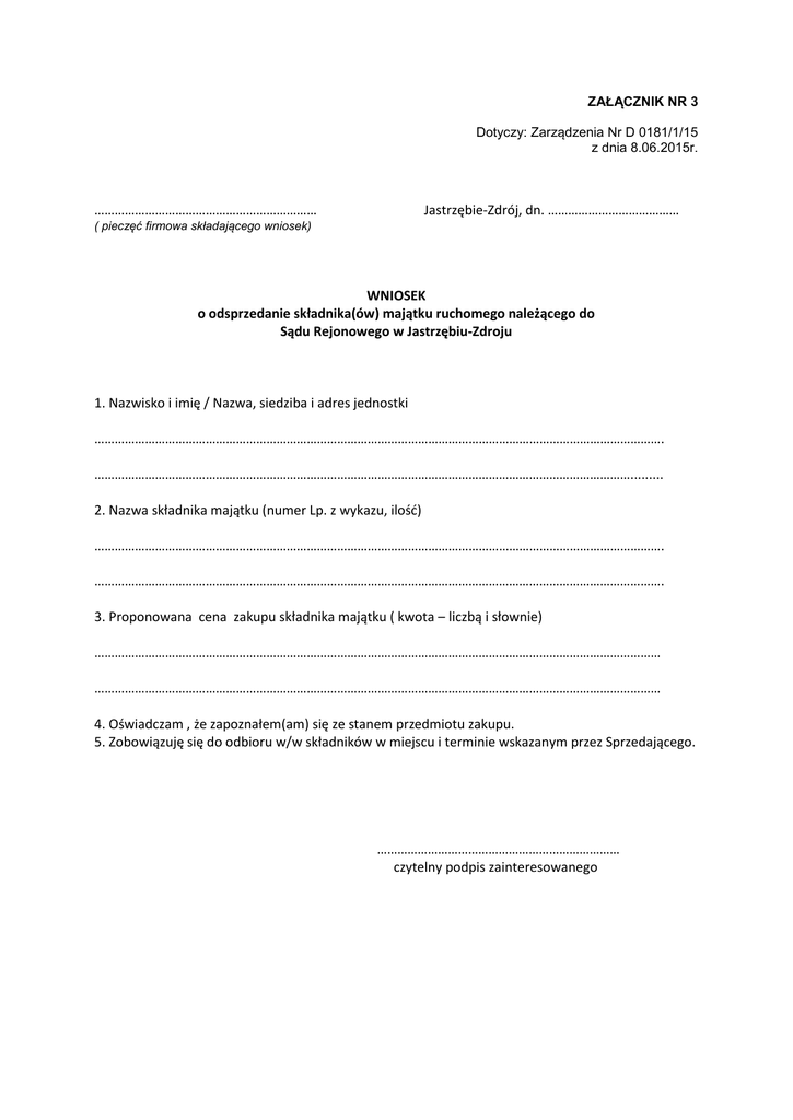 ZAŁĄCZNIK NR 3 Dotyczy: Zarządzenia Nr D 0181/1/15 z dnia 8.06.2015r. ………………………………………………………… Jastrzębie-Zdrój, dn. ………………………………… ( pieczęć firmowa składającego wniosek) WNIOSEK o odsprzedanie składnika(ów) majątku ruchomego należącego do Sądu Rejonowego w Jastrzębiu-Zdroju 1. Nazwisko i imię / Nazwa, siedziba i adres jednostki ……………………………………………………………………………………………………………………………………………………. ……………………………………………………………………………………………………………………………………………......... 2. Nazwa składnika majątku (numer Lp. z wykazu, ilość) ……………………………………………………………………………………………………………………………………………………. ……………………………………………………………………………………………………………………………………………………. 3. Proponowana cena zakupu składnika majątku ( kwota – liczbą i słownie) …………………………………………………………………………………………………………………………………………………… …………………………………………………………………………………………………………………………………………………… 4. Oświadczam , że zapoznałem(am) się ze stanem przedmiotu zakupu. 5. Zobowiązuję się do odbioru w/w składników w miejscu i terminie wskazanym przez Sprzedającego. ……………………………………………………………… czytelny podpis zainteresowanego