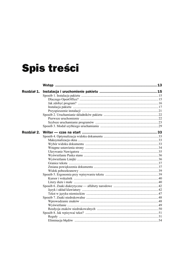 Wstęp ............................................................................................ 13 Rozdział 1. Instalacja i uruchomienie pakietu .................................................... 15 Sposób 1. Instalacja pakietu .............................................................................................15 Dlaczego OpenOffice? ...............................................................................................15 Jak zdobyć program? .................................................................................................16 Instalacja pakietu .......................................................................................................17 Przyspieszenie instalacji ............................................................................................21 Sposób 2. Uruchamianie składników pakietu ..................................................................22 Pierwsze uruchomienie ..............................................................................................22 Szybsze uruchamianie programów ............................................................................23 Sposób 3. Moduł szybkiego uruchamiania ......................................................................29 Rozdział 2. Writer — czas na start .................................................................... 33 Sposób 4. Optymalizacja widoku dokumentu ..................................................................33 Maksymalizacja okna .................................................................................................33 Wybór widoku dokumentu ........................................................................................33 Wstępne ustawienia strony ........................................................................................34 Ukrywanie Nawigatora ..............................................................................................35 Wyświetlanie Paska stanu ..........................................................................................36 Wyświetlanie Linijki ..................................................................................................36 Granice tekstu ............................................................................................................37 Zmiana powiększenia dokumentu ..............................................................................37 Widok pełnoekranowy ...............................................................................................39 Sposób 5. Ergonomia przy wpisywaniu tekstu ................................................................39 Kursor i wskaźnik ......................................................................................................40 Litery duże i małe ......................................................................................................40 Sposób 6. Znaki diakrytyczne — alfabety narodowe ......................................................42 Język i układ klawiatury ............................................................................................42 Tekst w języku niemieckim .......................................................................................47 Sposób 7. Znaki niedrukowalne .......................................................................................48 Wprowadzanie znaków ..............................................................................................48 Wyświetlanie ..............................................................................................................49 Reedycja znaków niedrukowalnych ..........................................................................50 Sposób 8. Jak wpisywać tekst? ........................................................................................51 Reguły ........................................................................................................................51 Eliminacja błędów .....................................................................................................54 4 122 sposoby na OpenOffice.ux.pl 2.0 Sposób 9. Uwagi przydatne przy pisaniu tekstu ..............................................................56 Kursor bezpośredni ....................................................................................................56 Tryb wprowadzania tekstu — wstawianie lub zastępowanie znaków .......................59 Cofnij, ponów, powtórz .............................................................................................60 Sposób 10. Zapisywanie dokumentów .............................................................................62 Nazwa i lokalizacja zapisywanych dokumentów ......................................................62 Zmiana dotychczasowej nazwy lub lokalizacji dokumentu .......................................66 Sposób 11. Otwieranie istniejących dokumentów i zakładanie nowych .........................67 Otwieranie dokumentów bezpośrednio z okna folderu .............................................67 Otwieranie dokumentów z poziomu programu ..........................................................68 Tworzenie nowych dokumentów ...............................................................................70 Rozdział 3. Konfiguracja środowiska pracy ........................................................ 73 Sposób 12. Dostosowywanie pasków narzędzi ................................................................73 Wyświetlanie i ukrywanie pasków narzędzi ..............................................................74 Aranżacja pasków narzędzi ........................................................................................75 Zablokowanie paska narzędzi ....................................................................................77 Sposób 13. Paski narzędzi o niestandardowej zawartości ......................................