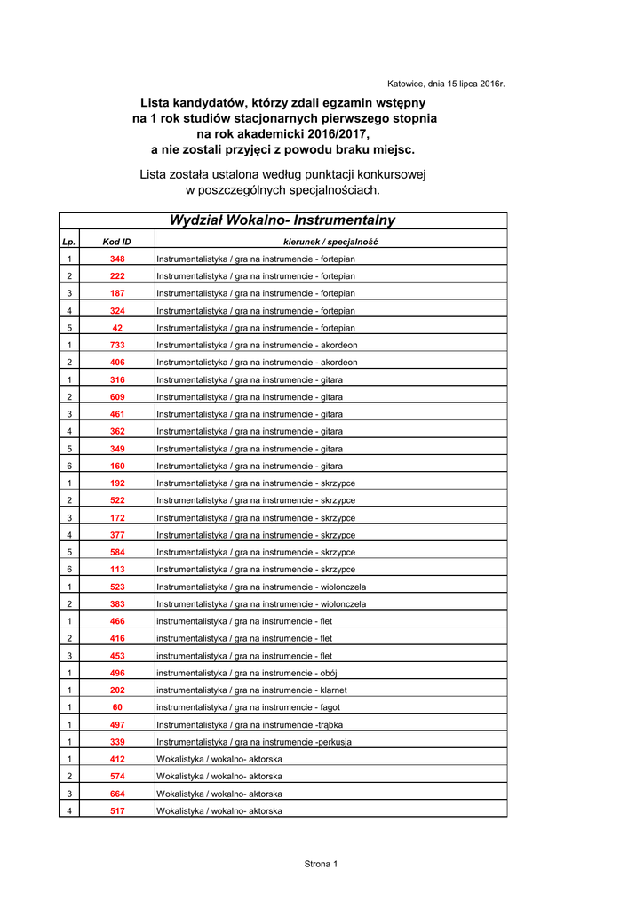 Katowice, dnia 15 lipca 2016r. Lista kandydatów, którzy zdali egzamin wstępny na 1 rok studiów stacjonarnych pierwszego stopnia na rok akademicki 2016/2017, a nie zostali przyjęci z powodu braku miejsc. Lista została ustalona według punktacji konkursowej w poszczególnych specjalnościach. Wydział Wokalno- Instrumentalny kierunek / specjalność Lp. Kod ID 1 348 Instrumentalistyka / gra na instrumencie - fortepian 2 222 Instrumentalistyka / gra na instrumencie - fortepian 3 187 Instrumentalistyka / gra na instrumencie - fortepian 4 324 Instrumentalistyka / gra na instrumencie - fortepian 5 42 Instrumentalistyka / gra na instrumencie - fortepian 1 733 Instrumentalistyka / gra na instrumencie - akordeon 2 406 Instrumentalistyka / gra na instrumencie - akordeon 1 316 Instrumentalistyka / gra na instrumencie - gitara 2 609 Instrumentalistyka / gra na instrumencie - gitara 3 461 Instrumentalistyka / gra na instrumencie - gitara 4 362 Instrumentalistyka / gra na instrumencie - gitara 5 349 Instrumentalistyka / gra na instrumencie - gitara 6 160 Instrumentalistyka / gra na instrumencie - gitara 1 192 Instrumentalistyka / gra na instrumencie - skrzypce 2 522 Instrumentalistyka / gra na instrumencie - skrzypce 3 172 Instrumentalistyka / gra na instrumencie - skrzypce 4 377 Instrumentalistyka / gra na instrumencie - skrzypce 5 584 Instrumentalistyka / gra na instrumencie - skrzypce 6 113 Instrumentalistyka / gra na instrumencie - skrzypce 1 523 Instrumentalistyka / gra na instrumencie - wiolonczela 2 383 Instrumentalistyka / gra na instrumencie - wiolonczela 1 466 instrumentalistyka / gra na instrumencie - flet 2 416 instrumentalistyka / gra na instrumencie - flet 3 453 instrumentalistyka / gra na instrumencie - flet 1 496 instrumentalistyka / gra na instrumencie - obój 1 202 instrumentalistyka / gra na instrumencie - klarnet 1 60 instrumentalistyka / gra na instrumencie - fagot 1 497 Instrumentalistyka / gra na instrumencie -trąbka 1 339 Instrumentalistyka / gra na instrumencie -perkusja 1 412 Wokalistyka / wokalno- aktorska 2 574 Wokalistyka / wokalno- aktorska 3 664 Wokalistyka / wokalno- aktorska 4 517 Wokalistyka / wokalno- aktorska Strona 1 5 551 Wokalistyka / wokalno- aktorska 6 421 Wokalistyka / wokalno- aktorska 7 504 Wokalistyka / wokalno- aktorska 8 180 Wokalistyka / wokalno- aktorska 9 385 Wokalistyka / wokalno- aktorska 10 127 Wokalistyka / wokalno- aktorska 11 418 Wokalistyka / wokalno- aktorska 12 254 Wokalistyka / wokalno- aktorska 13 427 Wokalistyka / wokalno- aktorska 14 591 Wokalistyka / wokalno- aktorska 15 552 Wokalistyka / wokalno- aktorska 16 616 Wokalistyka / wokalno- aktorska 17 575 Wokalistyka / wokalno- aktorska 18 10 Wokalistyka / wokalno- aktorska 19 627 Wokalistyka / wokalno- aktorska 20 668 Wokalistyka / wokalno- aktorska 21 389 Wokalistyka / wokalno- aktorska 22 193 Wokalistyka / wokalno- aktorska 23 571 Wokalistyka / wokalno- aktorska 24 286 Wokalistyka / wokalno- aktorska 25 336 Wokalistyka / wokalno- aktorska 26 23 Wokalistyka / wokalno- aktorska 27 765 Wokalistyka / wokalno- aktorska 28 480 Wokalistyka / wokalno- aktorska 29 467 Wokalistyka / wokalno- aktorska 30 579 Wokalistyka / wokalno- aktorska 31 444 Wokalistyka / wokalno- aktorska 32 299 Wokalistyka / wokalno- aktorska 33 177 Wokalistyka / wokalno- aktorska 34 741 Wokalistyka / wokalno- aktorska Kandydaci na I rok studiów stacjonarnych, którzy zdali egzamin wstępny, a nie zostali przyjęci z powodu braku miejsc, mają prawo ubiegać się o przyjęcie na I rok studiów niestacjonarnych (płatnych) bez dodatkowych egzaminów, pod warunkiem wyboru tego samego kierunku / specjalności studiów. W takim przypadku wymagana jest pisemna deklaracja kandydata złożona w Dziale Nauki i Nauczania Akademii Muzycznej w terminie do 14 dni od daty ogłoszenia listy przyjętych na studia stacjonarne. Decyzję podejmuje Wydziałowa Komisja Rekrutacyjna. Od decyzji Wydziałowej Komisji Rekrutacyjnej Kandydatowi przysługuje odwołanie do Uczelnianej Komisji Rekrutacyjnej w terminie 14 dni od daty doręczenia decyzji. Podstawą odwołania może być jedynie wskazanie naruszenia warunków i trybu rekrutacji na studia. Przewodniczący Wydziałowej Komisji Rekrutacyjnej prof.dr hab. Władysław Szymański Strona 2