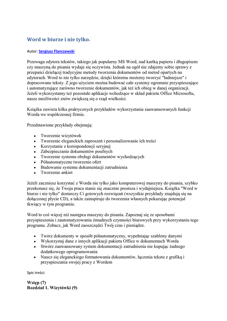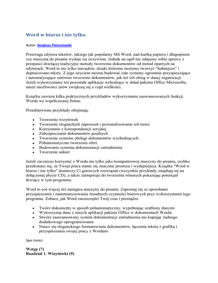 Word w biurze i nie tylko. Autor: Sergiusz Flanczewski Przewaga edytora tekstów, takiego jak popularny MS Word, nad kartką papieru i długopisem czy maszyną do pisania wydaje się oczywista. Jednak na ogół nie zdajemy sobie sprawy z przepaści dzielącej tradycyjne metody tworzenia dokumentów od metod opartych na edytorach. Word to nie tylko narzędzie, dzięki któremu możemy tworzyć "ładniejsze" i dopracowane teksty. Z jego użyciem można budować całe systemy ogromnie przyspieszające i automatyzujące zarówno tworzenie dokumentów, jak też ich obieg w danej organizacji. Jeżeli wykorzystamy też pozostałe aplikacje wchodzące w skład pakietu Office Microsoftu, nasze możliwości znów zwiększą się o rząd wielkości. Książka zawiera kilka praktycznych przykładów wykorzystania zaawansowanych funkcji Worda we współczesnej firmie. Przedstawione przykłady obejmują: Tworzenie wizytówek Tworzenie eleganckich zaproszeń i personalizowanie ich treści Korzystanie z korespondencji seryjnej Zabezpieczanie dokumentów poufnych Tworzenie systemu obsługi dokumentów wychodzących Półautomatyczne tworzenie ofert Budowanie systemu dokumentacji zatrudnienia Tworzenie ankiet Jeżeli zaczniesz korzystać z Worda nie tylko jako komputerowej maszyny do pisania, szybko przekonasz się, że Twoja praca stanie się znacznie prostsza i wydajniejsza. Książka "Word w biurze i nie tylko" dostarczy Ci gotowych rozwiązań (wszystkie przykłady znajdują się na dołączonej płycie CD), a także zainspiruje do tworzenia własnych pokazując potencjał tkwiący w tym programie. Word to coś więcej niż następca maszyny do pisania. Zapoznaj się ze sposobami przyspieszenia i zautomatyzowania żmudnych czynności biurowych przy wykorzystaniu tego programu. Zobacz, jak Word zaoszczędzi Twój czas i pieniądze. Twórz dokumenty w sposób półautomatyczny, wypełniając szablony danymi Wykorzystaj dane z innych aplikacji pakietu Office w dokumentach Worda Stwórz zaawansowany system dokumentacji zatrudnienia nie kupując żadnego dodatkowego oprogramowania Naucz się eleganckiego formatowania dokumentów, łączenia tekstu z grafiką i przyspieszania swojej pracy z Wordem Spis treści: Wstęp (7) Rozdział 1. Wizytówki (9) Przeznaczenie dokumentu (9) Konstrukcja i obsługa dokumentu (10) o Dokument dane do wizytówki.doc (11) o Dokument wizytówka.doc (13) o Tworzenie "szablonu" wizytówki (14) o Tworzenie "matrycy" wizytówki (22) Rozdział 2. Zaproszenia i kartki okolicznościowe (29) Przeznaczenie dokumentu (29) Konstrukcja i obsługa dokumentu (30) Plik dane do zaproszenia.doc (31) o Budowa dokumentu (31) Plik zaproszenie.doc (32) o Budowa strony wewnętrznej zaproszenia (32) o Budowa strony zewnętrznej zaproszenia (44) o Obsługa dokumentu (49) Plik kartka.doc (50) Konstrukcja i obsługa dokumentu (50) o Budowa dokumentu (50) Rozdział 3. Identyfikatory - grafika w korespondencji seryjnej (53) Przeznaczenie dokumentu (53) Konstrukcja i obsługa dokumentu (54) Plik dane do identyfikatora.doc (54) o Budowa i obsługa dokumentu (54) Plik identyfikator.doc (60) o Budowa i obsługa dokumentu (60) Rozdział 4. Tabliczki informacyjne - inicjał w korespondencji seryjnej (71) Przeznaczenie dokumentu (71) Konstrukcja i obsługa dokumentu (71) Dokument dane do tabliczek (72) Dokument tabliczka (74) o Budowa i obsługa dokumentu (74) Rozdział 5. Korespondencja poufna (85) Przeznaczenie dokumentu (85) Konstrukcja i obsługa dokumentu (88) Dokument rozdzielnik pism (89) o Budowa nagłówka strony dokumentu rozdzielnik pism.doc (90) Dokument poufne (92) o Budowa nagłówka i stopki strony dokumentu "poufne" (93) o Budowa pola tekstowego (99) Zabezpieczenia dokumentu (102) o Zabezpieczenie przed otwarciem i modyfikacją dokumentu (102) o Ochrona przed kopiowaniem części lub całości tekstu do innego pliku (105) o Szyfrowanie dokumentu (106) Rozdział 6. System obsługi pism wychodzących (109) Opis systemu (109) Konstrukcja i obsługa systemu (111) Plik Menu (111) o Przeznaczenie, budowa i obsługa dokumentu (111) o Obsługa dokumentu Menu (116) Pliki baz danych (117) o Dokument dane do menu (117) o Skoroszyt Baza danych.xls (122) Plik dokument.doc - papier firmowy (130) o Przeznaczenie, budowa i obsługa dokumentu (130) o Budowa nagłówka "firmówki" (131) o Budowa stopek "firmówki" (137) o Wstawienie pól bazy danych do dokumentu (140) o Pole treści dokumentu (142) o Obsługa dokumentu (145) Plik Rejestr pism.doc (146) o Przeznaczenie, budowa i obsługa dokumentu (146) o Budowa nagłówka rejestru (146) o Wstawienie pól danych do dokumentu Rejestr pism (148) o Obsługa dokumentu (150) Plik Koperta.doc (150) o Przeznaczenie, budowa i obsługa dokumentu (150) o Wstawienie pól danych do dokumentu Koperta (152) o Obsługa dokumentu wydruku kopert (155) Plik Poczta.doc (155) o Przeznaczenie, budowa i obsługa dokumentu (155) o Budowa nagłówka strony Książki opłaty pocztowej (156) o Wstawienie pól danych do dokumentu Poczta (157) o Obsługa dokumentu Książka pocztowa (159) Rozdział 7. Oferta (161) Przeznaczenie dokumentu (161) Konstrukcja i obsługa dokumentu (161) Plik dane do oferty.doc (163) o Budowa dokumentu (163) Plik oferta.doc (166) o Budowa dokumentu (166) o Wstawianie obiektów graficznych - autokształtów (174) o Obsługa dokumentu (178) Rozdział 8. System dokumentacji zatrudnienia (179) Konstrukcja i obsługa systemu (181) Plik Menu_zatrudnienie (181) o Przeznaczenie, budowa i obsługa dokumentu (181) Baza danych systemu (189) o Budowa i obsługa skoroszytu (190) o Ustawienie hiperłączy na wybranych kolumnach i arkuszach (195) o Procedura wyboru (197) Umowa o pracę (200) o Budowa dokumentu (200) o Obsługa dokumentu umowy (211) Dokumenty rozwiązania umowy o pracę (212) o Informacje ogólne (212) o Budowa tabel dokumentów typu rozwiązanie umowy (212) o Budowa pola tekstowego dla informacji o numerach Regon oraz NIP (215) o Wstawienie pól bazy danych (216)