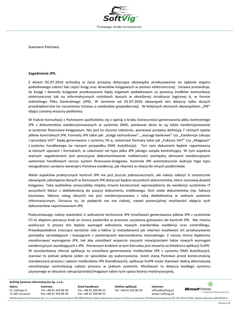 Szanowni Państwo, Zagadnienie JPK. Z dniem 01.07.2016 wchodzą w życie przepisy dotyczące obowiązku przekazywania na żądanie organu podatkowego całości lub części ksiąg oraz dowodów księgowych w postaci elektronicznej. Ustawa przewiduje, że księgi i dowody księgowe przekazywane będą organom podatkowym za pomocą środków komunikacji elektronicznej lub na informatycznych nośnikach danych w określonej strukturze logicznej tj. w formie Jednolitego Pliku Kontrolnego (JPK). W terminie od 01.07.2016 obowiązek ten dotyczy tylko dużych przedsiębiorców (w rozumieniu Ustawy o swobodzie gospodarczej). W kolejnych okresach obowiązkiem „JPK” objęci zostaną wszyscy podatnicy. W trakcie konsultacji z Państwem spotkaliśmy się z opinią o braku konieczności generowania pliku kontrolnego JPK z dokumentów ewidencjonowanych w systemie DMS, ponieważ dane te są także ewidencjonowane w systemie finansowo-księgowym. Nie jest to słuszne założenie, ponieważ przepisy definiują 7 różnych typów plików kontrolnych JPK. Formaty JPK takie jak: „księgi rachunkowe”, „wyciągi bankowe” czy „Ewidencje zakupu i sprzedaży VAT” będę generowane z systemu FK-a, natomiast formaty takie jak „Faktury VAT” czy „Magazyn” z systemu handlowego (w naszym przypadku DMS AutoStacja). Ten sam dokument będzie raportowany w różnych ujęciach i formatach, w zależności od typu pliku JPK jakiego zażąda kontrolujący. W tym aspekcie ważnym zagadnieniem jest precyzyjne dokumentowanie rozbieżności pomiędzy okresami ewidencyjnymi systemów handlowych versus system finansowo-księgowy. Kontrola JPK automatycznie wykryje tego typu niezgodności zarówno wewnątrz Państwa ewidencji, jak również w relacji do innych podatników. Wiele aspektów praktycznych kontroli JPK nie jest jeszcze jednoznacznych, ale należy założyć iż ostatecznie obowiązek udostępnia danych w formatach JPK dotyczyć będzie wszystkich dokumentów, które stanowią dowód księgowy. Taka wykładnia oznaczałaby między innymi konieczność wprowadzenia do ewidencji systemów IT wszystkich faktur z dokładnością do pozycji dokumentu źródłowego. Dziś wiele dokumentów (np. faktury kosztowe, faktury usług obcych) nie jest ewidencjonowana z taką dokładnością w żadnym systemie informatycznym. Oznacza to, że podatnik nie ma żadnej, nawet potencjalnej możliwości objęcia tych dokumentów raportowaniem JPK. Podsumowując należy stwierdzić iż wdrożenie techniczne JPK (możliwość generowania plików JPK z systemów IT) to dopiero pierwszy krok ze strony podatnika w procesie uzyskania gotowości do kontroli JPK. Nie można wykluczyć iż proces ten będzie wymagał wdrożenia nowych standardów ewidencji oraz controllingu. Prawdopodobnie znacząco wzrośnie rola e-faktur (z metadanymi) jak również możliwość ich przekazywania pomiędzy sprzedającym i kupującym z pominięciem wprowadzania manualnego. Z naszej strony będziemy monitorować wymagania JPK, tak aby umożliwić wsparcie naszymi rozwiązaniami także nowych wymagań ewidencyjnych wynikających z JPK. Pierwszym krokiem w tym kierunku jest otwarta architektura aplikacji SvJPK. W standardowej ofercie aplikacja ta umożliwia generowanie meldunków JPK z systemu DMS AutoStacja3, stanowi to jednak jedynie jeden ze sposobów jej wykorzystania. Jeżeli staną Państwo przed koniecznością standaryzacji procesu i jakości meldunków JPK (handlowych), aplikacja SvJPK może stanowić dobrą alternatywę umożliwiając centralizację całości procesu w jednym systemie. Możliwość ta dotyczy każdego systemu używanego w obszarze zakup/sprzedaż/magazyn także tych spoza branży motoryzacyjnej. SoftVig Systemy Informatyczne Sp. z o.o. Adres: Ul. Cyfrowa 4 71-441 Szczecin Centrala: Tel. +48 91 350 89 20 Fax +48 91 350 89 30 Dział handlowy: Tel. +48 91 350 89 22 Fax +48 91 350 89 31 Hotline aplikacji: Tel. +48 91 350 89 26 Internet: [email protected] www.softvig.pl SoftVig Systemy Informatyczne Sp. z o.o. zarejestrowana pod nr KRS 0000112010 w Sądzie Rejonowym Szczecin -Centrum w Szczecinie, XIII Wydział Gospodarczy KRS. NIP: 8512773583. Kapitał zakładowy: 600 000,00 zł. Strona 1 z 2 Rozwiązania JPK We współpracy z firmą Sage przygotowaliśmy dla Państwa ofertę kompleksowo wspierającą Państwa w przygotowaniach do „Kontroli JPK”. Oferta ta obejmuje nie tylko możliwość generowania meldunków JPK z systemu DMS AutoStacja3 oraz z systemu finansowo-księgowego Symfonia ERP, ale również możliwość weryfikacji poprawności i zgodności poszczególnych plików (np. DMS versus FK) w platformie eAudytor. Dzięki platformie eAudytor oraz pakietowi usług oferowanych przez firmę Sage, mogą Państwo zweryfikować udostępniane dane w formie podobnej do tej, w jakiej będą one prezentowane dla urzędu kontroli. Dopełnieniem oferty JPK firmy Sage jest możliwość consultingu oraz szkoleń. Proces wdrożenia technicznego rozwiązań JPK oferowanych przez nasza firmę będzie przebiegał następująco : a. b. c. d. Aktualizacja przez dealera systemu DMS AutoStacja3 do wersji wspierającej publikację obecnego zakresu ewidencji zdarzeń gospodarczych w formie JPK. Optymalnie wdrożenie zmian wprowadzanych przez tę wersję DMS-u powinno nastąpić do dnia 1 lipca 2016 r. Z uwagi na realia czasowe wprowadziliśmy jednak możliwość aktualizacji dokumentów zakupu wystawionych w wcześniejszej wersji systemu do standardu wymaganego przez JPK. Szczegóły znajdą Państwo w dokumentacji. Zgłoszenie przez dealera gotowości technicznej do instalacji aplikacji SvJPK. Instalacja i konfiguracja aplikacji SvJPK przez wdrożeniowca SoftVig (usługa zdalna). Wdrożenie biznesowe rozwiązań JPK przez dealera. Licencja aplikacji SvJPK będzie udostępniona dla Państwa bez dodatkowych kosztów, w ramach świadczenia ubezpieczenia dostępu do nowych wersji systemu DMS AutoStacja Core, co stanowi element składowy opłat