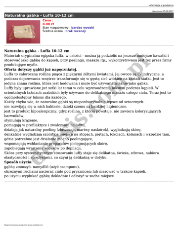 Informacje o produkcie Utworzono 07-03-2017 Naturalna gąbka - Luffa 10-12 cm Cena : 8.00 zł Stan magazynowy : bardzo wysoki Średnia ocena : brak recenzji de es is .c o m .p l Naturalna gąbka - Luffa 10-12 cm Materiał: oryginalna egipska luffa, w całości - można ją podzielić na jeszcze mniejsze kawałki i stosować jako gąbkę do kąpieli, przy peelingu, masażu itp.; wykorzystywana jest też przez firmy produkujące mydła. Oferta dotyczy gąbki już napęczniałej. Luffa to całoroczna roślina pnąca z pięknymi żółtymi kwiatami. Jej owoce są cylindryczne, a podczas dojrzewania wnętrze transformuje się w gęstą sieć włókien na kształt siatki. Jest to jedyna znana roślina, która jest hodowana i może być używana właśnie jako gąbka. Luffy były uprawiane już setki lat temu w celu wprowadzenia luksusu podczas kąpieli. W orientalnych łaźniach arabskich były używane do delikatnego masażu całego ciała. Teraz jest to ogólnodostępny luksus dla każdego. Każdy chyba wie, że naturalne gąbki są nieporównywalnie lepsze od sztucznych: nie rozwijają się w nich bakterie, dzięki czemu są bardziej higieniczne, jest to produkt hipoalergiczny, gdyż roślina, z której powstaje, nie zawiera koloryzujących barwników, stymulują krążenie, pomagają w profilaktyce i zwalczaniu cellulitu, działają jak naturalny peeling (złuszczają martwy naskórek), wygładzają skórę, delikatnie wygładzają szorstkie miejsca na stopach, piętach, łokciach, kolanach i wszędzie tam, gdzie potrzebne jest działanie mocno peelingujące, wspomagają wchłanianie preparatów pielęgnujących skórę, zapobiegają wrastaniu włosków po depilacji, Skóra przy systematycznym stosowaniu luffy staje się delikatna, świeża, zdrowa, nabiera elastyczności i sprężystości, co czyni ją delikatną w dotyku. Sposób użycia: gąbkę zmoczyć, namydlić (użyć szamponu), okrężnymi ruchami nacierać ciało pod prysznicem lub masować w trakcie kąpieli, po użyciu wypłukać gąbkę dokładnie i odłożyć w suche miejsce Wygenerowano w programie www.oscGold.com