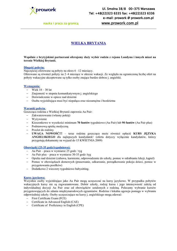 Ul. Smolna 38/8 0000-375 Warszawa Tel: +48(22)323 6335 6335 fax: +48(22)323 6336 e-mail: prowork @ prowork.com.pl nauka i praca za granicą www.prowork.com.pl WIELKA BRYTANIA Wspólnie z brytyjskimi partnerami oferujemy duŜy wybór rodzin z rejonu Londynu i innych miast na terenie Wielkiej Brytanii. Długość pobytu: Najczęściej oferowane są pobyty na okres 6 –12 miesięcy. Oferowane są równieŜ pobyty na 2–4 miesiące w okresie wakacji. Ze względu na ograniczoną liczbę ofert na pobyty wakacyjne akceptowane są tylko osoby znające bardzo dobrze j. angielski. Wymagania: − Wiek 18 – 30 lat − Znajomość w stopniu komunikatywnym j. angielskiego − Doświadczenie w opiece nad dziećmi − Osoba wyjeŜdŜająca musi być niepaląca oraz niezamęŜna i bezdzietna Warunki pobytu: Goszcząca rodzina z Wielkiej Brytanii zapewnia Au Pair: − Zakwaterowanie (własny pokój) − WyŜywienie − Kieszonkowe w wysokości minimum 70 funtów tygodniowo (Au Pair) lub 90 funtów (Au Pair plus) − Podstawową opiekę medyczną − Przelot do rodziny − UWAGA NOWOŚĆ!!! – teraz rodzina goszcząca moŜe równieŜ opłacić KURS JĘZYKA ANGIELSKIEGO dla najlepszych kandydatek! (oferta dotyczy wyłącznie kandydatów, którzy przygotują dokumenty na wyjazd do 15 KWIETNIA 2009) Obowiązki (25-35 godz/tygodniowo): − Au Pair – praca w wymiarze 25 godz / tyg − Au Pair plus – praca w wymiarze 30-35 godz /tyg − Opieka nad dziećmi (zabawa, karmienie, odprowadzanie do szkoły, pomoc w odrabianiu lekcji, kąpiel) − Pomoc w obowiązkach domowych (prasowanie, odkurzanie, porządkowanie pokoju dzieci, pomoc w przygotowaniu posiłków) − Dodatkowo 2 wieczory tygodniowo babysitting. Kursy językowe: Wszystkie osoby wyjeŜdŜające jako Au Pair mogą uczęszczać na kursy językowe. W przypadku pobytów wakacyjnych kursy nie są zagwarantowane. Dobór szkoły, rodzaj kursu i jego intensywność zaleŜą od indywidualnej decyzji Au Pair oraz od obowiązków ustalonych z rodziną. Polecamy wybranie kursów przygotowujących do zdania międzynarodowych egzaminów. Rodzina i lokalna agencja pomaga w wybraniu odpowiedniej szkoły. Osoby uczęszczające na kursy j. angielskiego mogą zdawać: − First Certificate Exam (FCE) − Certificate in Advanced English (CAE) − Certificate of Proficiency in English (CPE) Koszty związane z wyjazdem: Całkowity koszt przygotowania i przeszkolenia do wyjazdu jako Au Pair wynosi 750 zł. ================================================================== UWAGA: W ramach specjalnej promocji opłata programowa wynosi tylko 500 ZŁ w przypadku zgłoszenia się 2 lub więcej osób (oferta Au Pair dla koleŜanek) lub 600 ZŁ w przypadku wyjazdu indywidualnego. ================================================================== Opłata jest wnoszona przelewem na konto agencji w 2 ratach: Wyjazd indywidualny: 600 zł I rata – 300 zł Po zakwalifikowaniu do wyjazdu i podpisaniu umowy, II rata – 300 zł Po zaakceptowaniu rodziny. Wyjazd z koleŜanką: 500 zł I rata – 300 zł Po zakwalifikowaniu do wyjazdu i podpisaniu umowy, II rata – 200 zł Po zaakceptowaniu rodziny. Opłata nie obejmuje kosztów karty Euro 26 gwarantującej dodatkowe ubezpieczenie (koszt ok. 60 zł) Warunkiem skorzystania z oferty jest podpisanie umowy i złoŜenie dokumentów do 15 kwietnia 2009. Wyjazd moŜe być zrealizowany w dowolnym terminie do końca 2009 roku. Procedura związana z wyjazdem: Warunkiem udziału w Programie Au Pair jest dostarczenie do agencji kompletu wymaganych dokumentów. Po otrzymaniu umowy i uiszczeniu I raty opłaty agencyjnej, przesyłamy do kandydata/kandydatki materiały szkoleniowe na płycie CD do samodzielnej pracy w domu. Szkolenie składa się z: 1. Obszernego kursu językowego, przygotowującego do wyjazdu za granicę i pracy jako Au Pair, 2. Materiałów informacyjnych z zakresu opieki nad dziećmi i pierwszej pomocy. Dokładne zapoznanie się z tymi materiałami pozwoli na lepsze przygotowanie się do wyjazdu i pobytu jako Au Pair. Kolejnym etapem jest oczekiwanie na rodzinę i bezpośredni kontakt z zainteresowaną rodziną. Agencja zazwyczaj informuje o rozmowie telefonicznej, jednak niektóre rodziny dzwonią bez uprzedzenia, na co równieŜ naleŜy być przygotowanym w trakcie oczekiwania na rodzinę. Rozmowa telefoniczna jest dla obydwu stron okazją do bliŜszego poznania i podjęcia decyzji o wzajemnej akceptacji. W przypadku, gdy proponowana rodzina nie spełnia oczekiwań kandydatki na Au Pair (lub odwrotnie) przedstawiamy ofertę innej rodziny. Oficjalnym potwierdzeniem wyjazdu jest zaproszenie od rodziny otrzymywane za pośrednictwem agencji. Ostatnim etapem jest przesłanie przez agencję biletu lotniczego, który został zakupiony wcześniej przez rodzinę. Nie naleŜy się martwić o bezpośredni dojazd do miejsca zamieszkania i pobytu. Rodzina zazwyczaj gwarantuje osobisty odbiór Au Pair z dworca lub lotniska. Dokumenty do zgłoszenia na wyjazd (formularze przysyła agencja): 1. Ogólna ankieta. 2. List do rodziny - powinien zawierać informacje o Tobie i Twojej rodzinie, doświadczenie w pracy z dziećmi (stosunek do dzieci, umiejętności, zainteresowania, powody wyjazdu jako Au Pair, plany na przyszłość). 3. Referencje od 2 osób - muszą być wystawione przez osoby (niespokrewnione) mogące potwierdzić doświadczenie kandydatki w opiece nad dziećmi i jej predyspozycje do opieki nad nimi, np. pracodawca, nauczyciel, przyjaciel rodziny. JeŜeli referencje będą w języku polskim naleŜy dołączyć własnoręczne tłumaczenie na j. angielski. 4. Zdjęcie formatu paszportowego – pamiętaj, aby wybrać przyjazne i „uśmiechnięte” zdjęcie. 5. „Photo album” to 3 - 4 kolorowe i „uśmiechnięte” zdjęcia - z dziećmi, własną rodziną itp. Na zdjęciach Twoja postać musi być pierwszoplanowa i wyraźna. Zdjęcia są Twoją wizytówką i są bardzo waŜnym elementem przy podjęciu decyzji przez rodzinę o 
