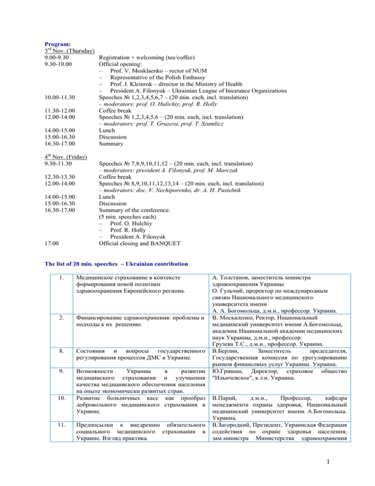 Program: 3rd Nov. (Thursday) 9.00-9.30 Registration + welcoming (tee/coffee) 9.30-10.00 Official opening: – Prof. V. Mosklaenko – rector of NUM – Representative of the Polish Embassy – Prof. J. Kleinrok – director in the Ministry of Health – President A. Filonyuk – Ukrainian League of Insurance Organizations 10.00-11.30 Speeches № 1,2,3,4,5,6,7 – (20 min. each, incl. translation) – moderators: prof. O. Hulichiy, prof. R. Holly 11.30-12.00 Coffee break 12.00-14.00 Speeches № 1,2,3,4,5,6 – (20 min. each, incl. translation) – moderators: prof. T. Gruzeva, prof. T. Szumlicz 14.00-15.00 Lunch 15.00-16.30 Discussion 16.30-17.00 Summary 4th Nov. (Friday) 9.30-11.30 12.30-13.30 12.00-14.00 14.00-15.00 15.00-16.30 16.30-17.00 17.00 Speeches № 7,8,9,10,11,12 – (20 min. each, incl. translation) – moderators: president A. Filonyuk, prof. M. Marczak Coffee break Speeches № 8,9,10,11,12,13,14 – (20 min. each, incl. translation) – moderators: doc. V. Nechiporenko, dr. A. H. Pustelnik Lunch Discussion Summary of the conference: (5 min. speeches each) – Prof. O. Hulchiy – Prof. R. Holly – President A. Filonyuk Official closing and BANQUET The list of 20 min. speeches – Ukrainian contribution 1. Медицинское страхование в контексте формирования новой политики здравоохранения Европейского региона. 2. Финансирование здравоохранения: проблемы и подходы к их решению. 8. Состояния и вопросы государственного регулирования процессов ДМС в Украине. 9. Возможности Украины в развитии медицинского страхования и улучшения качества медицинского обеспечения населения на опыте экономически развитых стран. Развитие больничных касс как прообраз добровольного медицинского страхования в Украине. 10. 11. Предпосылки к внедрению обязательного социального медицинского страхования в Украине. Взгляд практика. А. Толстанов, заместитель министра здравоохранения Украины О. Гульчий, проректор по международным связям Национального медицинского университета имени А. А. Богомольца, д.м.н., профессор. Украина. В. Москаленко, Ректор, Национальный медицинский университет имени А.Богомольца, академик Национальной академии медицинских наук Украины, д.м.н., профессор. Грузева Т.С., д.м.н., профессор. Украина. В.Берлин, Заместитель председателя, Государственная комиссия по урегулированию рынков финансовых услуг Украины. Украина. Ю.Гришан, Директор, страховое общество "Ильичевское", к.э.н. Украина. В.Парий, д.м.н., Профессор, кафедра менеджмента охраны здоровья, Национальный медицинский университет имени А.Богомольца. Украина. В.Загородний, Президент, Украинская Федерация содействия по охране здоровья населения; зам.министра Министерства здравоохранения 1 Украины (2002-2005 г.г.), к.н. с гос. упр. Украина. 14. Добровольное медицинское страхование как инструмент мотивации персонала. 15. Из опыта медицинского страхования на базе бюджетных медучреждений. 18. Особенности развития ОМС и ДМС в республике Молдова в период 2000-2011 г.г. 19. Особенности обслуживания крупных корпоративных клиентов по ДМС силами внешних медицинских ассистансов: "за" и "против". Опыт страховой компании "Провидна" по формированию модели и структуры продукта в добровольном медицинском страховании. Медицинские информационные системы и электронный протокол лечения. 20. 21. 22. 27. 28. Из опыта ДМС страховой компании "UNIQA Украина". Варианты и возможные стратегии введения ОМС в Украине. Пути усовершенствования сотрудничества страховых компаний с медучреждениями. Аспект хронической патологии. С.Гурьянова, Директор департамента личного страхования, страховая компания "Европейский страховой альянс". Украина. Е.Матушевский, Генеральный директор, страховая компания "АСКА-Донбасс Северный". Украина. И.Чеботарь, Начальник департамента личного страхования страховая компания "MOLDASIG". Молдова. Я.Мейзнер, Председатель правления, страховая компания