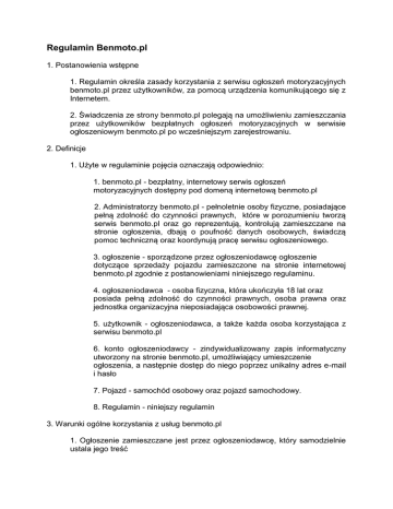 Regulamin Benmoto.pl 1. Postanowienia wstępne 1. Regulamin określa zasady korzystania z serwisu ogłoszeń motoryzacyjnych benmoto.pl przez użytkowników, za pomocą urządzenia komunikującego się z Internetem. 2. Świadczenia ze strony benmoto.pl polegają na umożliwieniu zamieszczania przez użytkowników bezpłatnych ogłoszeń motoryzacyjnych w serwisie ogłoszeniowym benmoto.pl po wcześniejszym zarejestrowaniu. 2. Definicje 1. Użyte w regulaminie pojęcia oznaczają odpowiednio: 1. benmoto.pl - bezpłatny, internetowy serwis ogłoszeń motoryzacyjnych dostępny pod domeną internetową benmoto.pl 2. Administratorzy benmoto.pl - pełnoletnie osoby fizyczne, posiadające pełną zdolność do czynności prawnych, które w porozumieniu tworzą serwis benmoto.pl oraz go reprezentują, kontrolują zamieszczane na stronie ogłoszenia, dbają o poufność danych osobowych, świadczą pomoc techniczną oraz koordynują pracę serwisu ogłoszeniowego. 3. ogłoszenie - sporządzone przez ogłoszeniodawcę ogłoszenie dotyczące sprzedaży pojazdu zamieszczone na stronie internetowej benmoto.pl zgodnie z postanowieniami niniejszego regulaminu. 4. ogłoszeniodawca - osoba fizyczna, która ukończyła 18 lat oraz posiada pełną zdolność do czynności prawnych, osoba prawna oraz jednostka organizacyjna nieposiadająca osobowości prawnej. 5. użytkownik - ogłoszeniodawca, a także każda osoba korzystająca z serwisu benmoto.pl 6. konto ogłoszeniodawcy - zindywidualizowany zapis informatyczny utworzony na stronie benmoto.pl, umożliwiający umieszczenie ogłoszenia, a następnie dostęp do niego poprzez unikalny adres e-mail i hasło 7. Pojazd - samochód osobowy oraz pojazd samochodowy. 8. Regulamin - niniejszy regulamin 3. Warunki ogólne korzystania z usług benmoto.pl 1. Ogłoszenie zamieszczane jest przez ogłoszeniodawcę, który samodzielnie ustala jego treść 2. Ogłoszenie dotyczy sprzedaży pojazdu, ze wskazaną ceną brutto oraz alternatywnie netto. Informację na temat pojazdu umieszczane są przez ogłoszeniodawcę w momencie tworzenia ogłoszenia. 3. Podstawowy czas trwania aktywnego ogłoszenia jest nieokreślony. Ogłoszeniodawca ma obowiązek usunąć ogłoszenie niezwłocznie, jeżeli pojazd zostanie sprzedany. 4. Treść ogłoszenia musi być zgodna ze stanem faktycznym i prawnym. 5. Ogłoszeniodawca ponosi pełną odpowiedzialność za treści oraz zdjęcia umieszczone w ogłoszeniu, jednocześnie potwierdza zgodność tych treści ze stanem rzeczywistym. Publikacja treści zawartych w ogłoszeniu musi być zgodna z powszechnie obowiązującymi przepisami prawa, same treści nie mogą naruszać regulaminu serwisu benmoto.pl, jak również praw osób trzecich, w tym praw autorskich. Administratorzy serwisu benmoto.pl nie ponoszą odpowiedzialności za działania po stronie użytkowników, ogłoszeniodawców, a zwłaszcza za rzetelność treści zawartych w ogłoszeniach oraz ich zgodność z powszechnymi przepisami prawnymi. 6. Zabronione jest wykorzystywanie oznaczeń oraz charakterystycznej grafiki serwisu benmoto.pl bez wcześniejszej zgody administratorów. 4. Zamieszczenie ogłoszenia 1.Ogłoszeniodawca wypełnia formularz dostępny na stronie benmoto.pl. Musi podać prawdziwe dane osobowe (imię, nazwisko), adres e-mail , numer kontaktowy oraz ustalić zindywidualizowane hasło dostępu do konta. 2. Po przesłaniu formularza, ogłoszeniodawca otrzyma wiadomość na skrzynkę e-mail, następnie klikając link wysłany w wiadomości aktywuje ogłoszenie. 5. Odpowiedzialność administratorów benmoto.pl 1. Administratorzy serwisu benmoto.pl nie ponoszą żadnej odpowiedzialności: 1. za treści umieszczane w ogłoszeniach. 2. za brak zainteresowania ogłoszeniami 3. za działanie siły wyższej 4. za przebieg transakcji między użytkownikami 5. za kontakt między użytkownikami 6. za działanie systemów teleinformatycznych i urządzeń elektronicznych 2. Administratorzy serwisu benmoto.pl zastrzegają sobie prawo do usunięcia konta ogłoszeniodawcy, edycji treści jego ogłoszenia lub do całkowitego usunięcia zamieszczonego ogłoszenia jeżeli: 1. Treści zawarte w ogłoszeniu naruszają prawa oraz dobra serwisu benmoto.pl, administratorów, osób trzecich. 2. Treści zawarte w ogłoszeniu są niezgodne z powszechnie obowiązującymi przepisami prawnymi 3. Ogłoszenie zawiera treści wulgarne lub powszechnie uważane za obraźliwe 4. Treści zawarte w ogłoszeniu wprowadzają użytkowników w błąd 6. Dane osobowe 1. Dane podawane na stronie benmoto.pl w momencie umieszczania ogłoszenia są zbierane przez administratorów strony internetowej benmoto.pl na czas trwania aktywnego ogłoszenia lub tak długo jak konto użytkownika istnieje w serwisie. 2. Dane kontaktowe są widoczne dla wszystkich użytkowników i są umieszczone wraz z ogłoszeniem 7. Zmiany regulaminu 1. Administratorzy benmoto.pl zastrzegają sobie prawo do zmiany treści zawartych w regulaminie. 2. Użytkownicy drogą e-mail otrzymają informację o zmianie treści regulaminu do 72 godzin przed wprowadzeniem zmian. Aby ogłoszenie mogło być dalej aktywne wymagane jest zatwierdzenie nowego regulaminu przez ogłoszeniodawców. 3. W przypadku nie zatwierdzenia zmian w regulaminie przez użytkowników ogłoszenie zostanie niezwłocznie usunięte ze strony serwisu benmoto.pl 8. Postanowienia końcowe 1. Niniejszy regulamin jest integralną częścią umowy ogłoszeniodawcą, a administratorami serwisu benmoto.pl pomiędzy 2. Niniejszy regulamin jest zamieszczony na stronie benmoto.pl i ogólnodostępny dla użytkowników serwisu 4. Warunkiem korzystania z serwisu benmoto.pl jest zapoznanie się z regulaminem oraz zaakceptowanie jego warunków 3. Nieprzestrzeganie regulaminu przez użytkowników benmoto.pl wiąże się z zablokowaniem lub usunięciem konta 4. Regulamin sporządzony dnia 01.01.2017 5. Regulamin jest ważny do dnia 04.04.2017