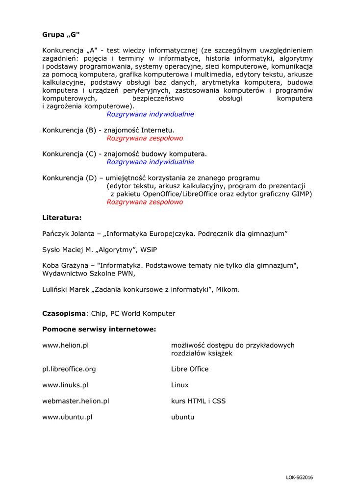 Grupa „G" Konkurencja „A" - test wiedzy informatycznej (ze szczególnym uwzględnieniem zagadnień: pojęcia i terminy w informatyce, historia informatyki, algorytmy i podstawy programowania, systemy operacyjne, sieci komputerowe, komunikacja za pomocą komputera, grafika komputerowa i multimedia, edytory tekstu, arkusze kalkulacyjne, podstawy obsługi baz danych, arytmetyka komputera, budowa komputera i urządzeń peryferyjnych, zastosowania komputerów i programów komputerowych, bezpieczeństwo obsługi komputera i zagrożenia komputerowe). Rozgrywana indywidualnie Konkurencja (B) - znajomość Internetu. Rozgrywana zespołowo Konkurencja (C) - znajomość budowy komputera. Rozgrywana indywidualnie Konkurencja (D) – umiejętność korzystania ze znanego programu (edytor tekstu, arkusz kalkulacyjny, program do prezentacji z pakietu OpenOffice/LibreOffice oraz edytor graficzny GIMP) Rozgrywana zespołowo Literatura: Pańczyk Jolanta – „Informatyka Europejczyka. Podręcznik dla gimnazjum” Sysło Maciej M. „Algorytmy”, WSiP Koba Grażyna – "Informatyka. Podstawowe tematy nie tylko dla gimnazjum", Wydawnictwo Szkolne PWN, Luliński Marek „Zadania konkursowe z informatyki”, Mikom. Czasopisma: Chip, PC World Komputer Pomocne serwisy internetowe: www.helion.pl możliwość dostępu do przykładowych rozdziałów książek pl.libreoffice.org Libre Office www.linuks.pl Linux webmaster.helion.pl kurs HTML i CSS www.ubuntu.pl ubuntu LOK-SG2016 Grupa „S" Konkurencja „A" — test wiedzy informatycznej (ze szczególnym uwzględnieniem zagadnień: pojęcia i terminy informatyczne, historia informatyki i tendencje rozwojowe, algorytmika, języki programowania, systemy operacyjne, sieci komputerowe, transmisje cyfrowe, grafika komputerowa i multimedia, edytory tekstu, bazy danych, arkusze kalkulacyjne, oprogramowanie narzędziowe, reprezentacja danych i przetwarzanie informacji w komputerze, architektura i działanie komputera oraz urządzeń peryferyjnych, zastosowania komputerów i programów komputerowych, prawne, etyczne i społeczne aspekty informatyki). Rozgrywana indywidualnie Konkurencja (B) - znajomość systemów operacyjnych i sieci komputerowych Rozgrywana zespołowo Konkurencja (C) - znajomość budowy komputera Rozgrywana indywidualnie Konkurencja (D) - umiejętność programowania (Pascal/C) Rozgrywana zespołowo Konkurencja „umiejętność programowania” będzie rozgrywana przy wykorzystaniu platformy internetowej www.youngcoder.eu W celu zapoznania zawodników z tą platformą nauczyciele zgłaszający zespoły mogą przed zawodami odbywać próby. W tym celu nauczyciel zgłaszający zespół (pkt III.3.a) otrzyma dostęp do platformy www.youngcoder.eu tj. konto dla nauczyciela, który będzie mógł przygotowywać swoich uczniów do Zawodów. Uwaga: aktywacja konta nastąpi po uprzednim przesłaniu zeskanowanego zgłoszenia drużyny na adres: [email protected] W razie problemów z dostępem do platformy YoungCoder należy kontaktowac się z Panią Magdaleną Burakowską: [email protected] Literatura: Zawadzka Grażyna., „Informatyka Europejczyka. Informatyka. Podręcznik dla szkół ponadgimnazjalnych. Zakres rozszerzony” - Wydawnictwo HELION Sysło Maciej M. „Algorytmy” WSiP Koba Grażyna – "Technologia informacyjna dla szkół ponadgimnazjalnych", Wydawnictwo MIGRA, Czasopisma: Chip, PC World Komputer Pomocne serwisy internetowe: www.helion.pl możliwość dostępu do przykładowych rozdziałów książek www.ubuntu.pl ubuntu www.damnsmalllinux.org Damn Small Linux webmaster.helion.pl kurs HTML i CSS LOK-SG2016