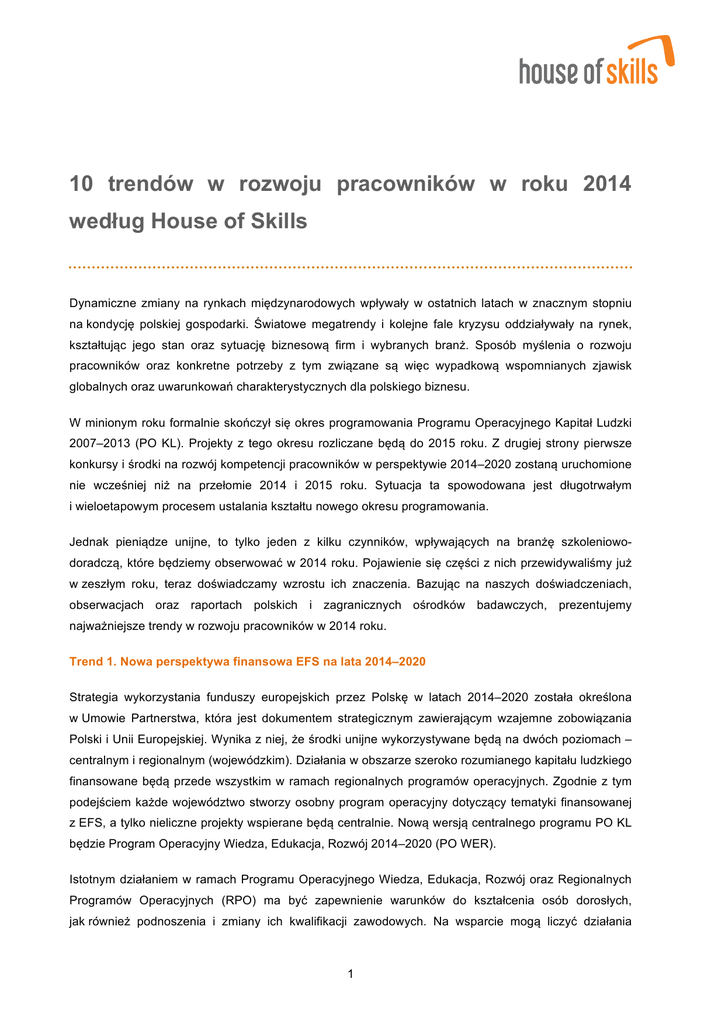 10 trendów w rozwoju pracowników w roku 2014 według House of Skills Dynamiczne zmiany na rynkach międzynarodowych wpływały w ostatnich latach w znacznym stopniu na kondycję polskiej gospodarki. Światowe megatrendy i kolejne fale kryzysu oddziaływały na rynek, kształtując jego stan oraz sytuację biznesową firm i wybranych branż. Sposób myślenia o rozwoju pracowników oraz konkretne potrzeby z tym związane są więc wypadkową wspomnianych zjawisk globalnych oraz uwarunkowań charakterystycznych dla polskiego biznesu. W minionym roku formalnie skończył się okres programowania Programu Operacyjnego Kapitał Ludzki 2007–2013 (PO KL). Projekty z tego okresu rozliczane będą do 2015 roku. Z drugiej strony pierwsze konkursy i środki na rozwój kompetencji pracowników w perspektywie 2014–2020 zostaną uruchomione nie wcześniej niż na przełomie 2014 i 2015 roku. Sytuacja ta spowodowana jest długotrwałym i wieloetapowym procesem ustalania kształtu nowego okresu programowania. Jednak pieniądze unijne, to tylko jeden z kilku czynników, wpływających na branżę szkoleniowodoradczą, które będziemy obserwować w 2014 roku. Pojawienie się części z nich przewidywaliśmy już w zeszłym roku, teraz doświadczamy wzrostu ich znaczenia. Bazując na naszych doświadczeniach, obserwacjach oraz raportach polskich i zagranicznych ośrodków badawczych, prezentujemy najważniejsze trendy w rozwoju pracowników w 2014 roku. Trend 1. Nowa perspektywa finansowa EFS na lata 2014–2020 Strategia wykorzystania funduszy europejskich przez Polskę w latach 2014–2020 została określona w Umowie Partnerstwa, która jest dokumentem strategicznym zawierającym wzajemne zobowiązania Polski i Unii Europejskiej. Wynika z niej, że środki unijne wykorzystywane będą na dwóch poziomach – centralnym i regionalnym (wojewódzkim). Działania w obszarze szeroko rozumianego kapitału ludzkiego finansowane będą przede wszystkim w ramach regionalnych programów operacyjnych. Zgodnie z tym podejściem każde województwo stworzy osobny program operacyjny dotyczący tematyki finansowanej z EFS, a tylko nieliczne projekty wspierane będą centralnie. Nową wersją centralnego programu PO KL będzie Program Operacyjny Wiedza, Edukacja, Rozwój 2014–2020 (PO WER). Istotnym działaniem w ramach Programu Operacyjnego Wiedza, Edukacja, Rozwój oraz Regionalnych Programów Operacyjnych (RPO) ma być zapewnienie warunków do kształcenia osób dorosłych, jak również podnoszenia i zmiany ich kwalifikacji zawodowych. Na wsparcie mogą liczyć działania 1 związane ze szkoleniami pracowników, przede wszystkim z sektora MŚP. W perspektywie 2014–2020 postanowiono zreorganizować funkcjonowanie rynku szkoleniowo-doradczego poprzez ograniczenie roli strony podażowej (firmy szkoleniowe składające wnioski i administracja publiczna dokonująca ich wyboru) na rzecz wzmocnienia roli strony popytowej (przedsiębiorców i pracodawców). To odbiorca wsparcia będzie mógł samodzielnie, w ramach określonych wytycznych decydować o rodzaju i zakresie usługi rozwojowej. W tym celu w roku 2014 utworzony zostanie przez PARP Rejestr Usług Rozwojowych zawierający zarówno zweryfikowane pod względem wiarygodności i jakości świadczonych usług firmy szkoleniowe dopuszczone do realizacji usług rozwojowych współfinansowanych z EFS, jak i centralną bazę danych wszystkich usług rozwojowych oferowanych przez te firmy. Takie podejście pozwoli na zmniejszenie biurokracji, skrócenie czasu oczekiwania na dofinansowanie, eliminację nierzetelnych usługodawców, podniesienie jakości usług, a w efekcie lepsze dopasowanie działań rozwojowych do potrzeb beneficjentów środków unijnych i wyższy zwrot z inwestycji w rozwój pracowników. W związku z planowanymi działaniami i oferowanym finansowaniem przewidujemy, że w roku 2014 zwiększy się gotowość małych i średnich firm do inwestowania w szkolenia i rozwój pracowników. Przeniesiona na pracodawców i przedsiębiorców odpowiedzialność za wybór ścieżek, treści i form rozwojowych będzie motywatorem do przemyślanej selekcji działań szkoleniowych oraz doradczych, których realizacja ściśle wiąże się z celami strategicznymi i planami biznesowymi firmy. Trend 2. Dojrzewanie rynku szkoleniowo-doradczego Firmy szkoleniowe, które w dużej części powstały i rozwijały się dzięki finansowaniu EFS, mierzyć się będą w 2014 roku ze skutkami zakończenia finansowania z budżetu 2007–2013 (finansowanie z budżetu 2014–2020 rozpocznie się w praktyce nie wcześniej niż w pierwszej połowie 2015 roku). W roku 2014 będziemy świadkami licznych przetasowań wśród usługodawców szkoleniowych, gdyż część z nich nie poradzi sobie bez wsparcia w postaci środków EFS. Liczba podmiotów na rynku zacznie maleć. Naturalną tego konsekwencją winna być konsolidacja rynku. Z całą pewnością zaostrzy się walka konkurencyjna. Firmy szkoleniowe będą walczyć o klienta albo jakością rozwiązań, albo niską ceną. Biorąc pod uwagę liczbę podmiotów szkoleniowych działających na rynku, klient stanie przed możliwością wybrania rozwiązania z szerokiego wachlarza ofert. Trend 3. Joy of missing out Codziennie dociera do nas ogromna ilość danych. Ma to przede wszystkim związek z rozwojem nowoczesnych technologii, komunikacji elektronicznej, smartfonów, mediów społecznościowych itp. Cały czas jesteśmy podłączeni do sieci umożliwiającej wymianę informacji i śledzenie nowości. W związku z tą sytuacją obserwuje się zjawisko zwane „Fear of missing out” (FOMO), oznaczające obawę przed wykluczeniem z przepływu informacji. Użytkownicy mediów społecznościowych 2 nieustannie powiadamiają się nawzajem o tym, co robią i gdzie są. Tak samo często sprawdzają, co dzieje się u ich znajomych. Kiedy nie mają dostępu do tych informacji, odczuwają lęk. Odmienne zjawisko obserwujemy w obszarz