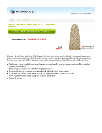 Utworzono: 2017-03-07 16:40:42 Menu: Części > PRODUCENT > Continental Opona Continental Retro Ride 28 x 2.2 kremowa drutowa Obejrzyj na stronie internetowej Cena produktu: 77,00 PLN 69,30 PLN Lifestyle i design Retro-Look Retro RIDE. Nazwa mówi wszystko. Opona o dużej objętości najbardziej polecana do rowerów miejskich typu Cruiser. Oferuje wysoki komfort jazdy, a wyróżnia go design i Lifestyle. Profil nawiązuje do legendarnego typu Conti KKS10 i dostępny jest w wielu modnych kolorach. Model idealny dla miłośników stylu. ● ● ● ● ● ● Rewlacyjny retro wygląd pasujący do rowerów miejskich i cruiser a rowerom górskim nadający zupenie inne oblicze. Bezawaryjność zapewnia wkładka antyprzebiciowa Bezpieczeństwo po zmroku zapewnia pasek odblaskowy z boku opony Przyczepna w różnych warunkach przy zachowaniu niskich oporów toczenia Wzór bieżnika wzorowany na oponach motocyklowych Opona drutowa Rodzaj Opony Producent Continental Zastosowanie Trekkingowe / Miejskie Rozmiar 700, 28" Typ Drutowa Mimo dołożenia wszelkich starań nie gwarantujemy, że publikowane opisy i specyfikacje techniczne niezawierają uchybień lub błędów, które nie mogą jednak być podstawą do roszczeń. W przypadku jakichkolwiek wątpliwości, przed podjęciem decyzji prosimy o kontakt. Adres: www.erowery.pl Telefon: 605 515 185, 34 361 16 71 Email: [email protected]