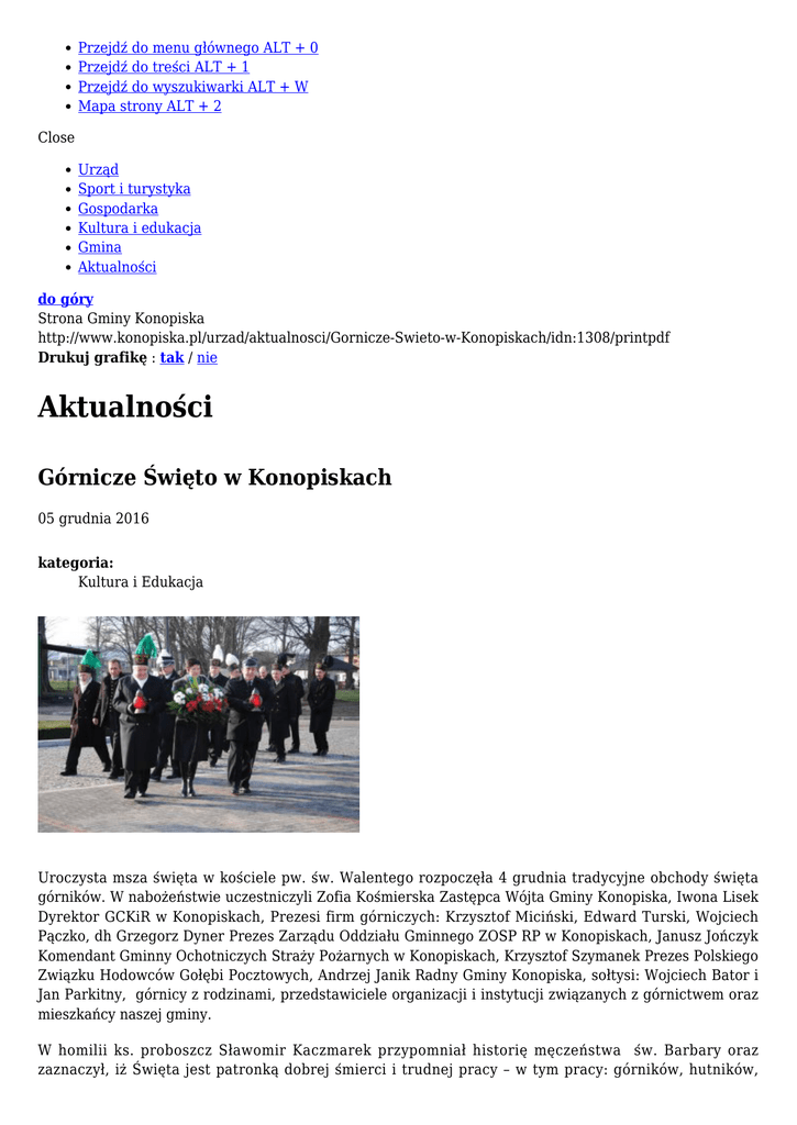Przejdź do menu głównego ALT + 0 Przejdź do treści ALT + 1 Przejdź do wyszukiwarki ALT + W Mapa strony ALT + 2 Close Urząd Sport i turystyka Gospodarka Kultura i edukacja Gmina Aktualności do góry Strona Gminy Konopiska http://www.konopiska.pl/urzad/aktualnosci/Gornicze-Swieto-w-Konopiskach/idn:1308/printpdf Drukuj grafikę : tak / nie Aktualności Górnicze Święto w Konopiskach 05 grudnia 2016 kategoria: Kultura i Edukacja Uroczysta msza święta w kościele pw. św. Walentego rozpoczęła 4 grudnia tradycyjne obchody święta górników. W nabożeństwie uczestniczyli Zofia Kośmierska Zastępca Wójta Gminy Konopiska, Iwona Lisek Dyrektor GCKiR w Konopiskach, Prezesi firm górniczych: Krzysztof Miciński, Edward Turski, Wojciech Pączko, dh Grzegorz Dyner Prezes Zarządu Oddziału Gminnego ZOSP RP w Konopiskach, Janusz Jończyk Komendant Gminny Ochotniczych Straży Pożarnych w Konopiskach, Krzysztof Szymanek Prezes Polskiego Związku Hodowców Gołębi Pocztowych, Andrzej Janik Radny Gminy Konopiska, sołtysi: Wojciech Bator i Jan Parkitny, górnicy z rodzinami, przedstawiciele organizacji i instytucji związanych z górnictwem oraz mieszkańcy naszej gminy. W homilii ks. proboszcz Sławomir Kaczmarek przypomniał historię męczeństwa św. Barbary oraz zaznaczył, iż Święta jest patronką dobrej śmierci i trudnej pracy – w tym pracy: górników, hutników, marynarzy, rybaków, żołnierzy, kamieniarzy, więźniów, a także orędowniczką w czasie burzy i pożarów. Św. Barbara wywodziła się z pogańskiej rodziny z Heliopolis. Z chrześcijaństwem „spotkała” się w Nikomedii, gdzie wysłano ją na naukę. Za przejście na wiarę chrześcijańską została uwięziona w wieży, gdzie przed śmiercią miał się jej objawić anioł niosący kielich z Hostią. Barbara została skazana na śmierć przez ścięcie mieczem. Zmarła śmiercią męczeńską w roku 306. Legenda głosi, iż męczeństwu towarzyszyły cuda – w nocy miał ją odwiedzić Chrystus, lecząc jej rany i udzielając Komunii Św. W ikonografii - św. Barbara - jest przedstawiana z koroną na głowie, w długiej tunice oraz płaszczu. W jednej ręce trzyma kielich z Hostią (symbol Eucharystii), w drugiej ręce trzyma miecz – atrybut swej męczeńskiej śmierci. Po mszy świętej – w uroczystym korowodzie - przemaszerowano pod „wagonik” – pomnik upamiętniający górników pracujących w kopalniach rud żelaza w rejonie Konopisk - gdzie złożono kwiaty oraz zapalono znicze. Od kilkunastu lat obchody górniczego święta nabrały bardzo uroczystego charakteru. To zasługa prezesów górniczych firm związanych z Gminą Konopiska i ich współpracy z Wójtem Gminy. Widocznym dla każdego efektem tej współpracy jest postawiony pomnik tj. górniczy wagonik i obelisk upamiętniający górniczy trud mieszkańców gminy. To już tradycja, że 4 grudnia w Konopiskach spotykają się górnicy, ich rodziny oraz przyjaciele i w kościele proszą swoją patronkę o błogosławieństwo. W tegorocznych obchodach górniczego święta z powodu choroby nie uczestniczył Prezes Marek Rak, któremu życzymy szybkiego powrotu do zdrowia. Wszystkim górnikom życzymy, by Święta Barbara nieustannie otaczała ich i rodziny ochronnymi ramionami, zapewniając bezpieczeństwo i pewność dnia jutrzejszego. Szczęść Boże! 05 gru 2016 Górnicze Święto w Konopiskach Górnicze Górnicze Górnicze Górnicze Górnicze Górnicze Górnicze Górnicze Górnicze Górnicze Górnicze Górnicze Górnicze Górnicze Górnicze Górnicze Górnicze Górnicze Górnicze Górnicze Święto Święto Święto Święto Święto Święto Święto Święto Święto Święto Święto Święto Święto Święto Święto Święto Święto Święto Święto Święto w w w w w w w w w w w w w w w w w w w w Konopiskach Konopiskach Konopiskach Konopiskach Konopiskach Konopiskach Konopiskach Konopiskach Konopiskach Konopiskach Konopiskach Konopiskach Konopiskach Konopiskach Konopiskach Konopiskach Konopiskach Konopiskach Konopiskach Konopiskach Aktualności - strona 1 Aktualności - strona 2 powrót do listy aktualności