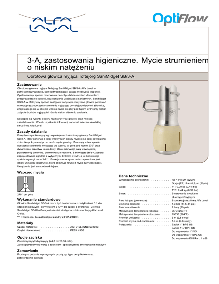 . ky 3-A, zastosowania higieniczne. Mycie strumieniem o niskim natężeniu Obrotowa głowica myjąca Toftejorg SaniMidget SB/3-A Zastosowanie Obrotowa głowica myjąca Toftejorg SaniMidget SB/3-A Alfa Laval w pełni samoczyszcząca, samoodwadniająca i dająca możliwość inspekcji. Opatentowany sposób mocowania one-clip ułatwia montaż, demontaż i przeprowadzanie kontroli, bez obniżenia właściwości sanitarnych. SaniMidget SB/3-A w efektywny sposób zastępuje tradycyjne statyczne głowice ponieważ myje poprzez uderzenia strumienia myjącego po całej powierzchni zbiornika, znajdującego się w obrębie wzorca mycia do góry pod kątem 270°; przy niskim zużyciu środków myjących i równie niskim ciśnieniu zasilania. Dostępne są rysunki doboru rozmiaru/ typu głowicy oraz miejsca zainstalowania. W celu uzyskania informacji na temat zaleceń skontaktuj się z firmą Alfa Laval. Zasady działania Przepływ czynnika myjącego wywołuje ruch obrotowy głowicy SaniMidget SB/3-A, który generuje z kolej wirowy ruch cieczy myjącej na całej powierzchni zbiornika pokrywanej przez wzór mycia głowicy. Powstają w ten sposób uderzenia strumienia myjącego we wzorcu w górę pod kątem 270° oraz dynamiczny przepływ kaskadowy, które pokrywają całą wewnętrzną powierzchnię zbiornika, pojemnika lub reaktora. SaniMidget SB/3-A została zaprojektowana zgodnie z wytycznymi EHEDG i GMP, a jej konstrukcja spełnia wymogi norm 3-A**. Funkcja samoczyszczenia zapewniona jest dzięki unikalnej konstrukcji, która obejmuje również mycie rury zasilającej. Urządzenie jest samoodwadniające. Wzorzec mycia . 270° do góry Wykonanie standardowe Głowica SaniMidget SB/3-A może być dostarczona z certyfikatami 3.1 dla części metalowych i certyfikatem 3-A*** dla części z tworzywa. Głowica SaniMidget SB/UltraPure jest również dostępna z dokumentacją Alfa Laval Q-doc. *** = Oznacza, że materiał jest zgodny z FDA 21CFR. Materiały Części metalowe: . . . . . . . . . . . . . . . . AISI 316L (UNS S31603) Części niemetalowe: . . . . . . . . . . . . . . PEEK 450G Opcje zacisku Zacisk łączący/odłączający (ø4,0 mm/0,16 cala). Zacisk potrzebny do wersji z zaciskiem i spawanych do zmontowania maszyny. Zamawianie Prosimy o podanie wymaganych przyłączy, typu certyfikatów oraz potwierdzenie aplikacji Dane techniczne Wykończenie powierzchni: . . . . . . . . . . . Ra < 0,8 µm (32µin) Opcja (EP): Ra < 0,5 µm (20µin) Waga: . . . . . . . . . . . . . . . . . . . . . . . 1" : 0,20 kg (0,44 lbs) 1½": 0,44 kg (0,97 lbs) Smar: . . . . . . . . . . . . . . . . . . . . . . . . Smarowanie środkiem płuczącym/myjącym Para lub gaz (powietrze): . . . . . . . . . . . . Skontaktuj się z firmą Alfa Laval Ciśnienie robocze: . . . . . . . . . . . . . . . . 1-3 bar (14.5-44 psi) Zalecane ciśnienie: . . . . . . . . . . . . . . . 2 bary (29 psi) Maksymalna temperatura robocza: . . . . . . 95°C (203°F) Maksymalna temperatura otoczenia: . . . . . 150°C (284°F) Promień zwilżania: . . . . . . . . . . . . . . . . 3 m (9,8 stopy) Promień mycia pod ciśnieniem: . . . . . . . . 1,4 m (4,6 stopy) Połączenia: . . . . . . . . . . . . . . . . . . . . Zacisk 1” BPE US Zacisk 1½” BPE US Do wspawania 1” ISO Do wspawania 1” BPE US Do wspawania DIN Ran. 1 ø28 Natężenie przepływu Natężenie przepływu m3/h./USgpm Mycie Długość wyrzutu m./ft l/min. A 8 B 35 4 125 7 30 11 100 6 3 25 10 270° 9 5 20 8 75 4 2 6 15 3 50 5 10 270° 4 2 1 25 1 7 5 3 2 5 10 20 15 25 30 35 40 2 1 A= Zacisk B = Do wspawania 1 0 3 5 10 15 1 20 25 30 35 Ciśnienie na wlocie psi/bar 40 3 2 Ciśnienie na wlocie psi/bar Uwaga: Ciśnienie na wlocie jest pobierane natychmiast przed otworem wlotowym maszyny. W celu osiągnięcia wydajności wskazanej na krzywych, należy wziąć pod uwagę spadek ciśnienia w przewodach zasilających pomiędzy pompą i maszyną, a temperatura podczas testowania powinna wynosić około 20°C. Wymiary (mm i cale) ID A G E t B ID t B A Ø-zacisk G E Clip-on 1” BPE US mm cale 25.7 1.012 1.2 0.047 42.0 1.653 84.8 3.338 4.0 0.157 4.1 0.161 15.0 0.590 Clip-on 1½” BPE US mm cale 38.4 1.512 1.2 0.047 54.7 2.154 118.3 4.659 4.0 0.157 4.1 0.161 25.4 1.000 Do wspawania 1” ISO mm cale 22.6 0.890 1.2 0.047 42.0 1.653 104.8 4.126 4.0 0.157 4.1 0.161 Do wspawania 1” BPE US mm cale 22.1 0.870 1.65 0.065 42.0 1.653 104.8 4.126 4.0 0.157 4.1 0.161 Do wspawania DIN zakres 1 (Ø28) mm cale 25.7 1.010 1.2 0.047 42.0 1.653 84.8 3.338 4.0 0.157 4.1 0.161 * Wersja do wspawania spełnia tylko wymogi normy sanitarnej 3-A 78-01, jeśli zostanie zainstalowana zgodnie z instrukcją obsługi. ** Weryfikacja osób trzecich wykazuje, że maszyna spełnia wymogi normy sanitarnej 3-A 78-01. . ESE01537PL 1001 Alfa Laval Polska Sp. z o.o. ul. Rzymowskiego 53, 02-697 Warszawa tel.: 0-22 336-64-64, fax: 0-22 336-64-60 www.alfalaval.com Alfa Laval zastrzega sobie prawo do wprowadzenia zmian bez wcześniejszego powiadamiania.